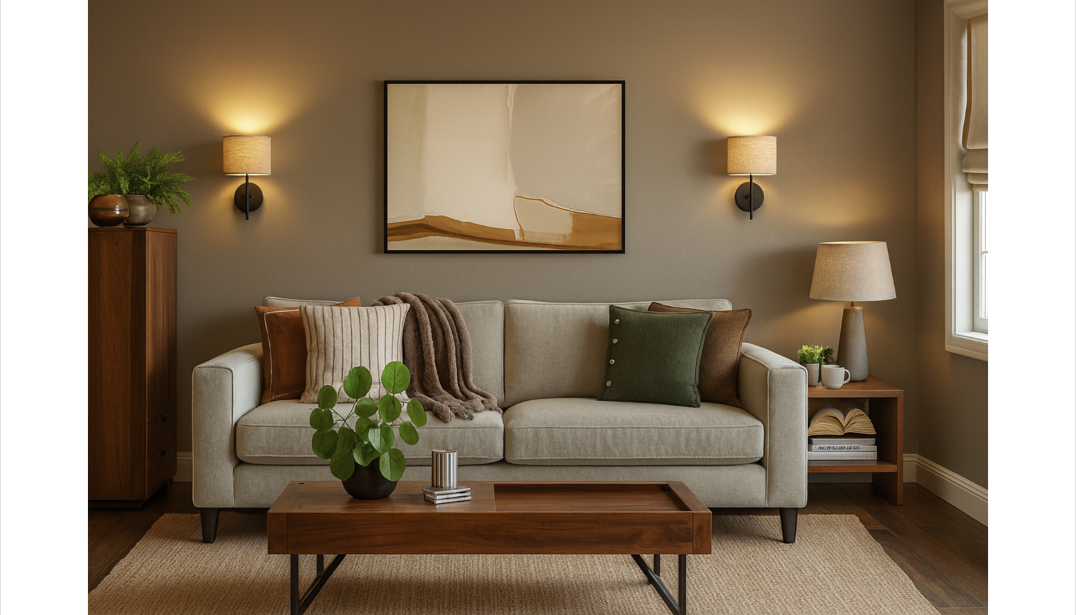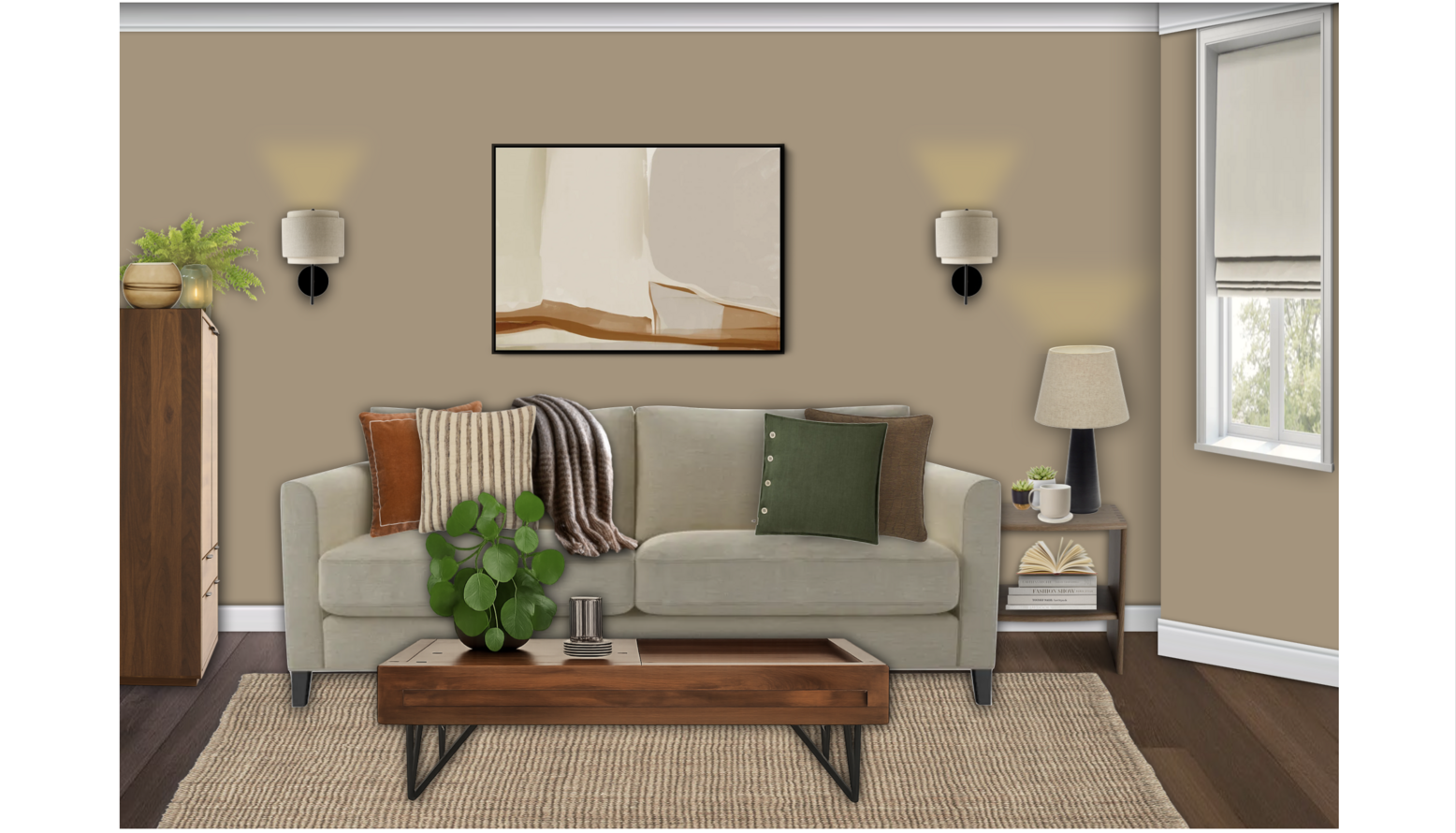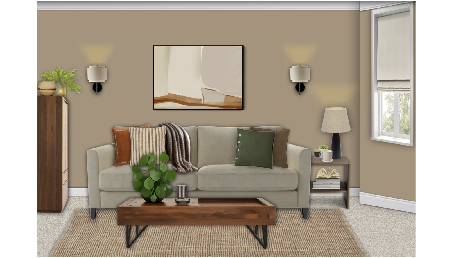 This living room design features a harmonious blend of comfort and style. The focal point is an Izzy 3 Seat Sofa upholstered in a soft Pampas Hygge Smart Linen, adorned with contrasting Tivani orange embroidered velvet cushions. Adjacent to the sofa, a charming Izzy Loveseat in Greige Florence Textured Weave complements the seating arrangement. A rich Knotty Rug in Jute defines the space and adds texture underfoot. Natural light filters in, enhanced by the warm glow of wall-mounted lights and a standing lamp, specifically the John Lewis Brooklyn Tripod Floor Lamp. To the side, a beautifully constructed Onix display cabinet in solid walnut showcases decorative items and adds storage space. The design is completed with accents such as a stylish Faux Mohair Fringe Throw in brown, an Optik Smoked Glass Round Vase, and artworks including 'The Desert Rocks' piece, which adds a modern touch to the walls. A wooden coffee table with black legs provides surface space for books and decorative objects, creating a cohesive and inviting atmosphere throughout the room.
