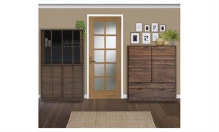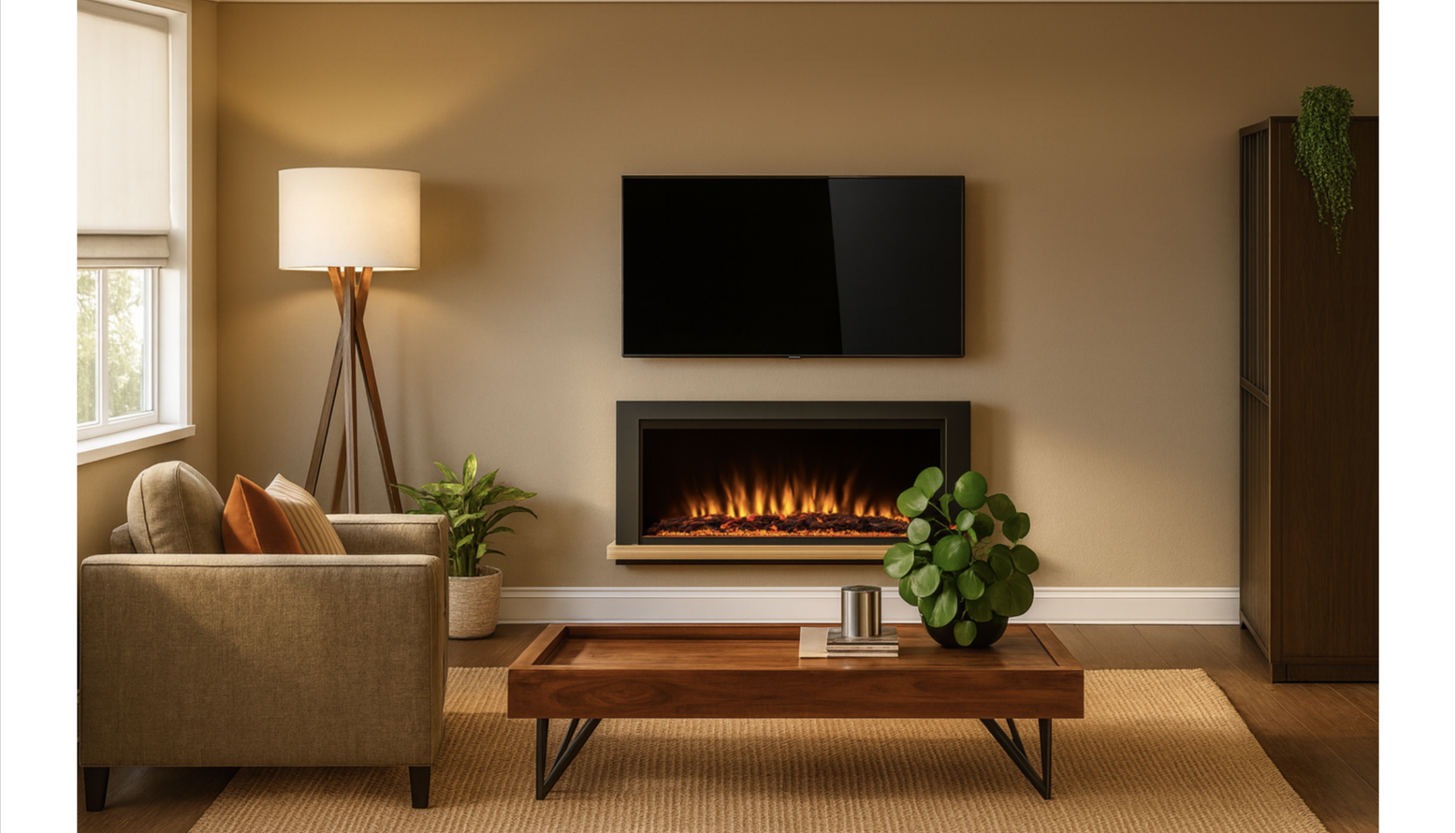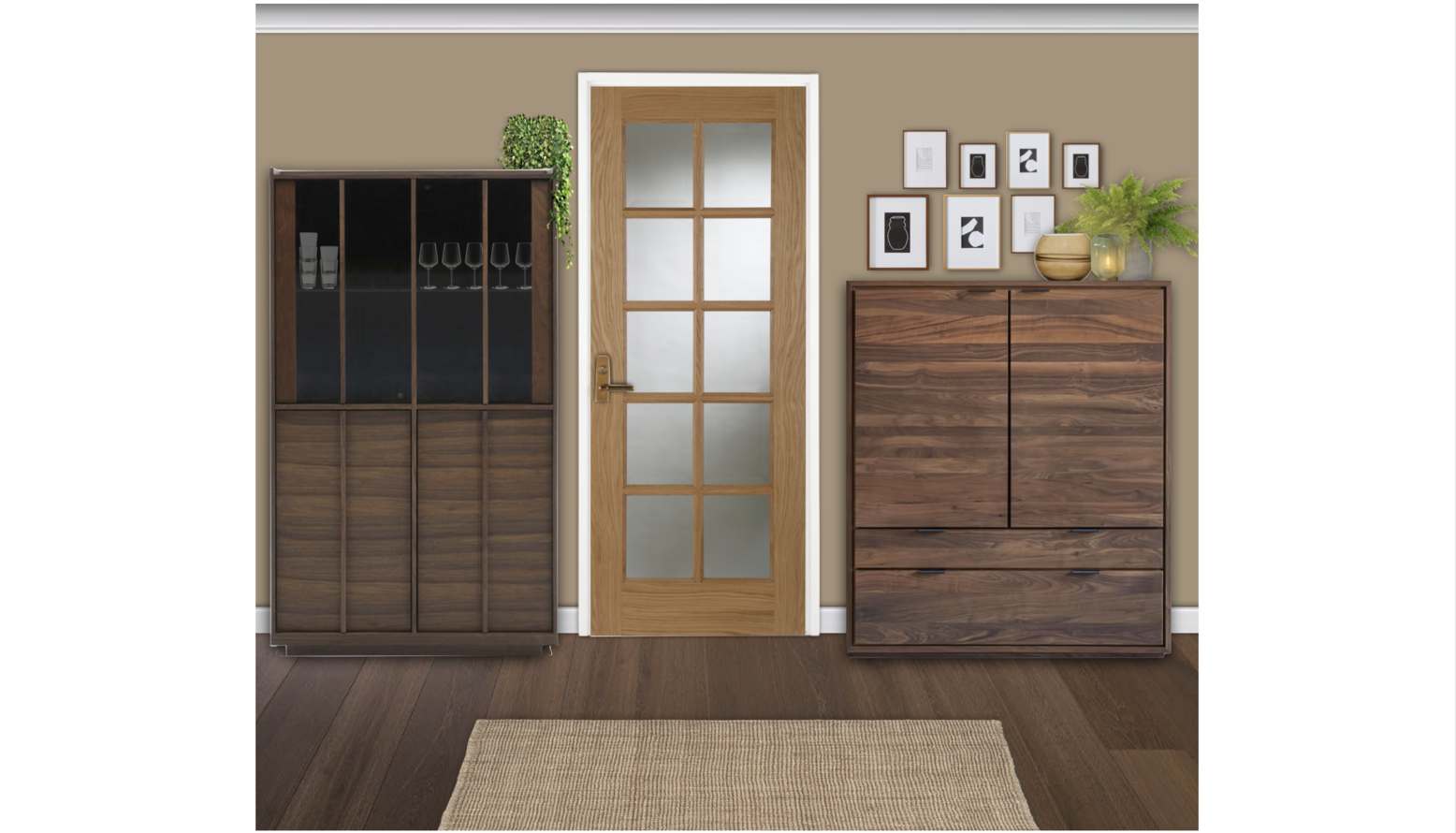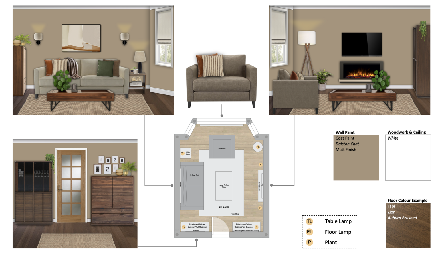 This living room design features a harmonious blend of comfort and style. The focal point is an Izzy 3 Seat Sofa upholstered in a soft Pampas Hygge Smart Linen, adorned with contrasting Tivani orange embroidered velvet cushions. Adjacent to the sofa, a charming Izzy Loveseat in Greige Florence Textured Weave complements the seating arrangement. A rich Knotty Rug in Jute defines the space and adds texture underfoot. Natural light filters in, enhanced by the warm glow of wall-mounted lights and a standing lamp, specifically the John Lewis Brooklyn Tripod Floor Lamp. To the side, a beautifully constructed Onix display cabinet in solid walnut showcases decorative items and adds storage space. The design is completed with accents such as a stylish Faux Mohair Fringe Throw in brown, an Optik Smoked Glass Round Vase, and artworks including 'The Desert Rocks' piece, which adds a modern touch to the walls. A wooden coffee table with black legs provides surface space for books and decorative objects, creating a cohesive and inviting atmosphere throughout the room.