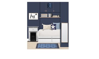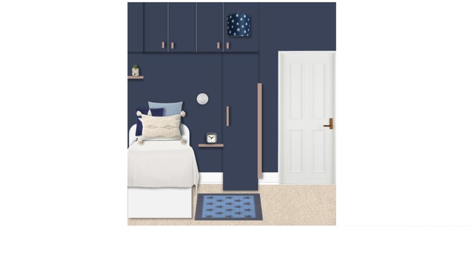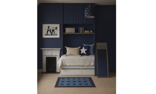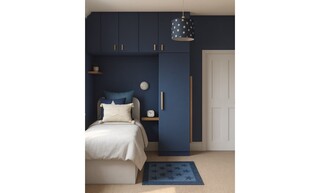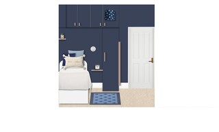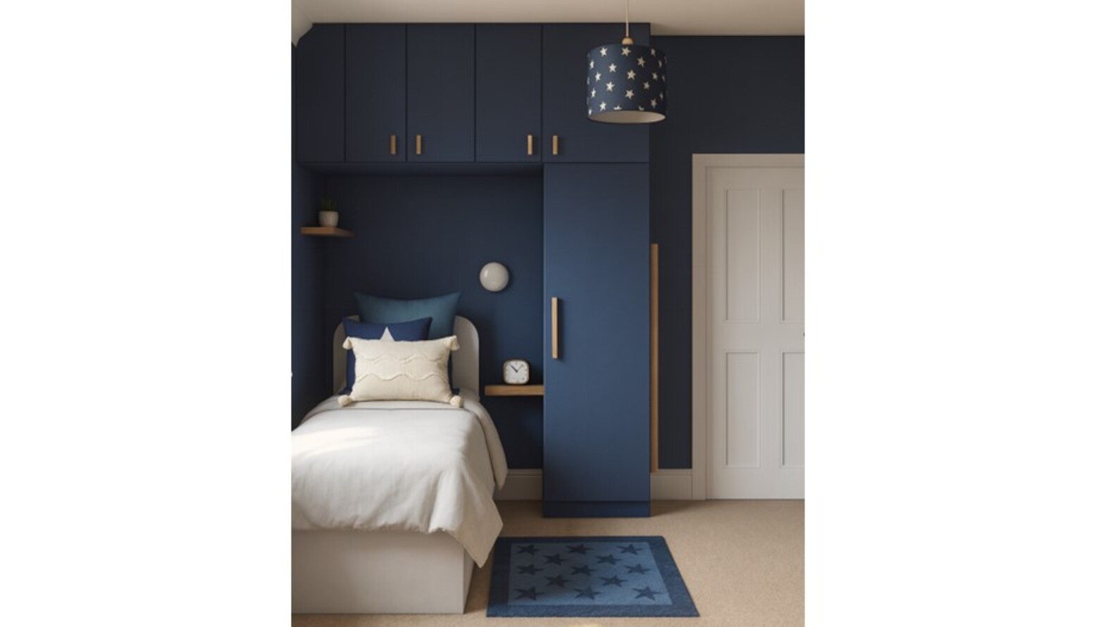 This cozy bedroom features a deep navy blue accent wall that creates a bold yet calming atmosphere. The wall-mounted joinery encompasses a sleek single-door wardrobe, complementing the modern design with its clean lines and gold fixtures. Above the bed, additional cabinetry provides ample storage while maintaining a streamlined look. The bed is adorned with crisp white bedding, accented by a mix of blue cushions, including a star-patterned throw pillow that ties into the room’s theme. A plush area rug in a lighter shade of blue adds warmth underfoot, creating a comfortable space to relax. Strategically placed wall lighting illuminates the room, with a dimmable wall light next to the bed and a stylish, patterned ceiling light adding an artistic flair. A compact bedside shelf showcases a modern clock and small decorative elements. In the corner, a swivel chair offers a perfect spot for reading or working, paired with a chic desk and wall-mounted shelving that provides both functionality and display space for art and personal items. The overall aesthetic is cohesive, combining modern elements with a hint of playful charm, making it a delightful retreat.