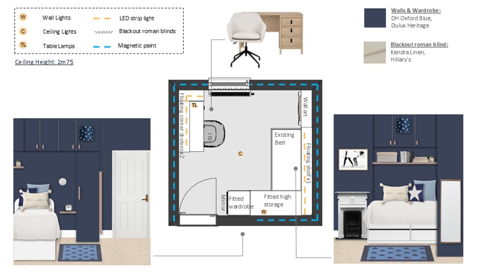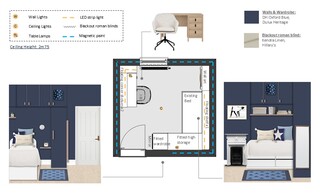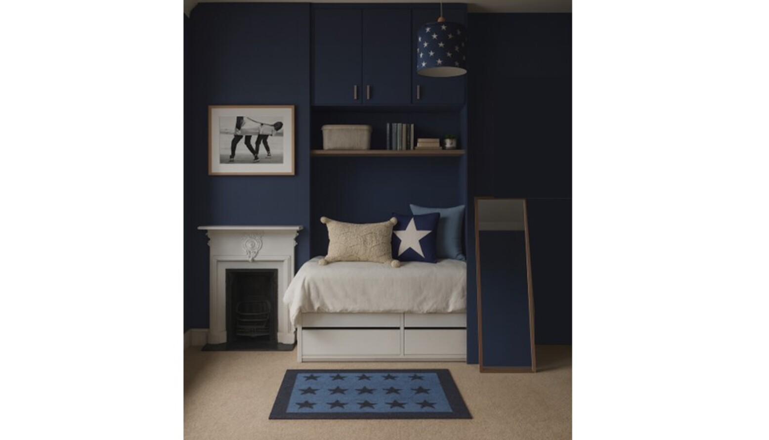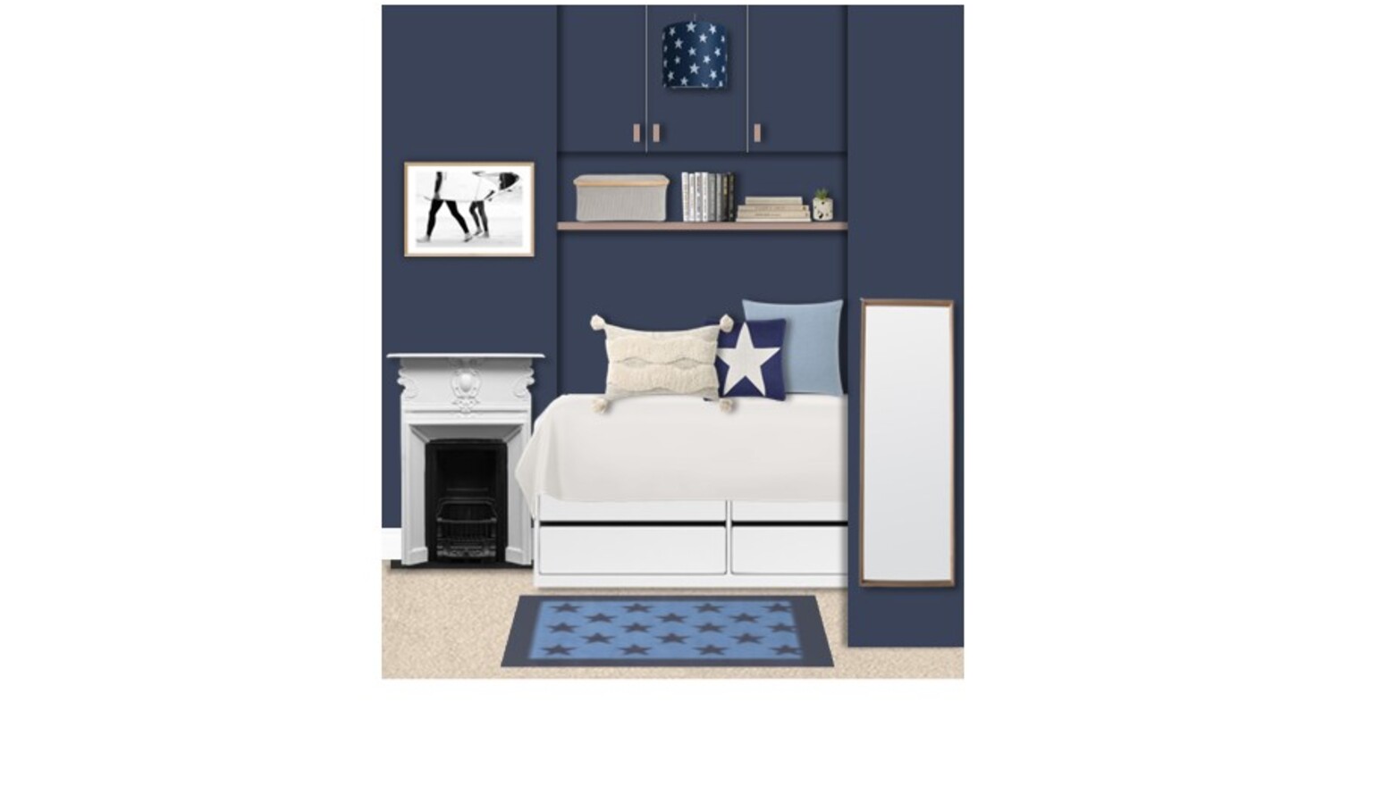 This cozy bedroom features a deep navy blue accent wall that creates a bold yet calming atmosphere. The wall-mounted joinery encompasses a sleek single-door wardrobe, complementing the modern design with its clean lines and gold fixtures. Above the bed, additional cabinetry provides ample storage while maintaining a streamlined look. The bed is adorned with crisp white bedding, accented by a mix of blue cushions, including a star-patterned throw pillow that ties into the room’s theme. A plush area rug in a lighter shade of blue adds warmth underfoot, creating a comfortable space to relax. Strategically placed wall lighting illuminates the room, with a dimmable wall light next to the bed and a stylish, patterned ceiling light adding an artistic flair. A compact bedside shelf showcases a modern clock and small decorative elements. In the corner, a swivel chair offers a perfect spot for reading or working, paired with a chic desk and wall-mounted shelving that provides both functionality and display space for art and personal items. The overall aesthetic is cohesive, combining modern elements with a hint of playful charm, making it a delightful retreat.