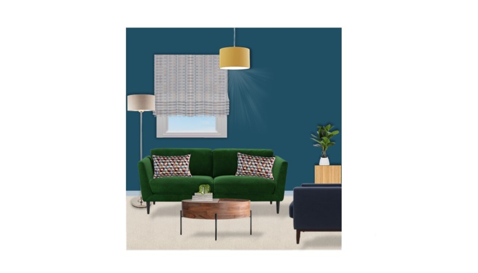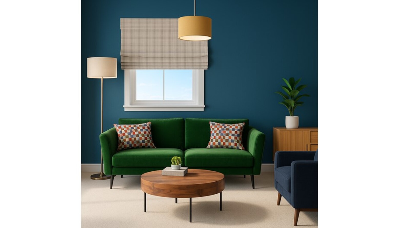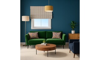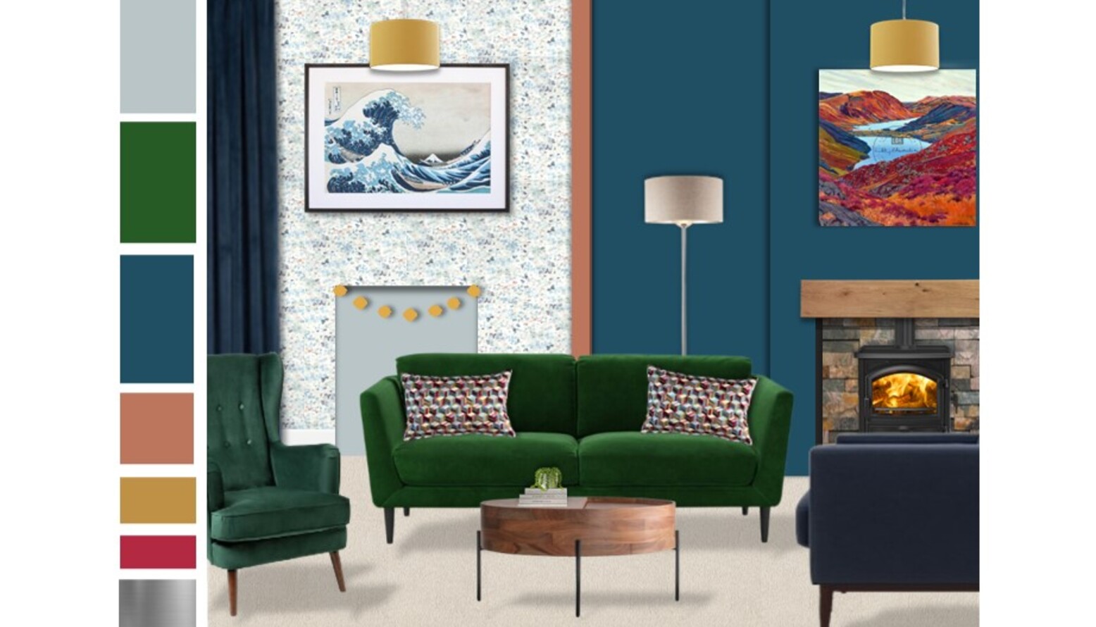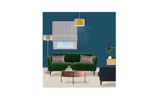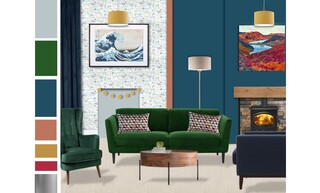 A cozy living room designed with rich colors and a blend of modern and classic elements. The walls are adorned with a deep French Blue paint, creating a striking backdrop for the furnishings. A vibrant Holly sofa, upholstered in Putting Green Aquaclean Clever Velvet, anchors the space. This sofa features decorative cushions featuring a colorful pattern that adds a playful touch. Adjacent to the sofa, a Randall coffee table offers a warm wooden surface, complementing the overall color scheme. A comfortable Holly armchair in Armour Smart Velvet provides additional seating, while a sleek Grey Velvet home office chair contrasts beautifully with the darker tones in the room. A Trianon desk in grey serves as a functional piece, suitable for work or personal projects. The room is well-lit with a combination of floor lamps; a Blair smoke glass ball and black metal floor lamp alongside a Highclere floor lamp in brushed chrome, ensuring a warm and inviting atmosphere. Strategically placed wall-mounted shelves, notably the Seaford black metal wide wall shelf with oak accents, provide storage and display options. Natural elements are introduced with a Lyrata artificial plant in a stylish planter that ties into the decor. The space also boasts artistic flair with a piece of artwork titled "The Great Wave," alongside beautiful light fixtures and textures from the John Lewis Dapple wallpaper. The natural light spilling through the window is filtered by a tasteful check-patterned blind, enhancing the room's overall warmth and style. Soft textures are added through a John Lewis fleece throw, providing comfort and coziness. Overall, the design combines function and aesthetics, achieving a harmonious balance that is both modern and inviting.