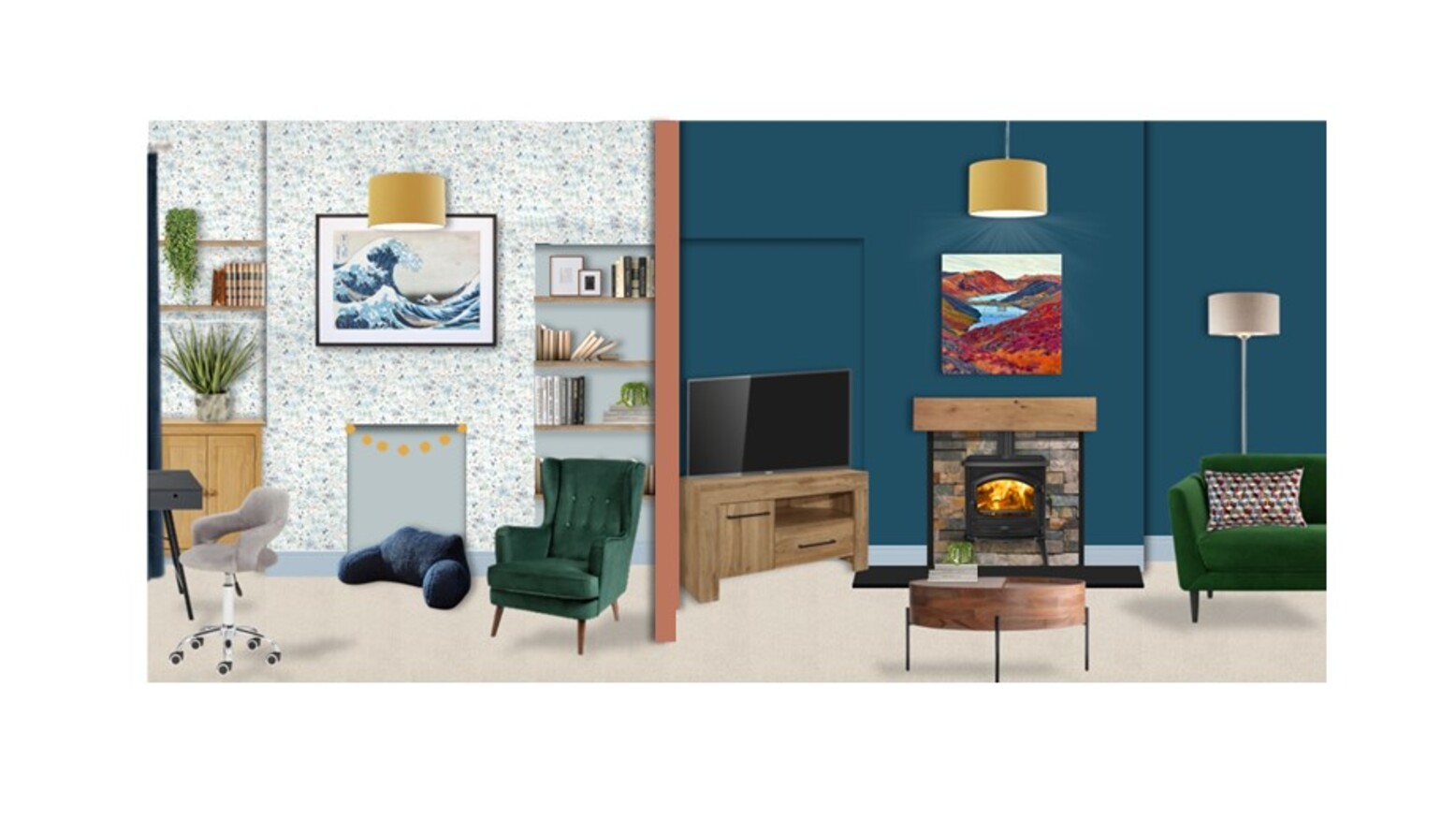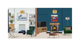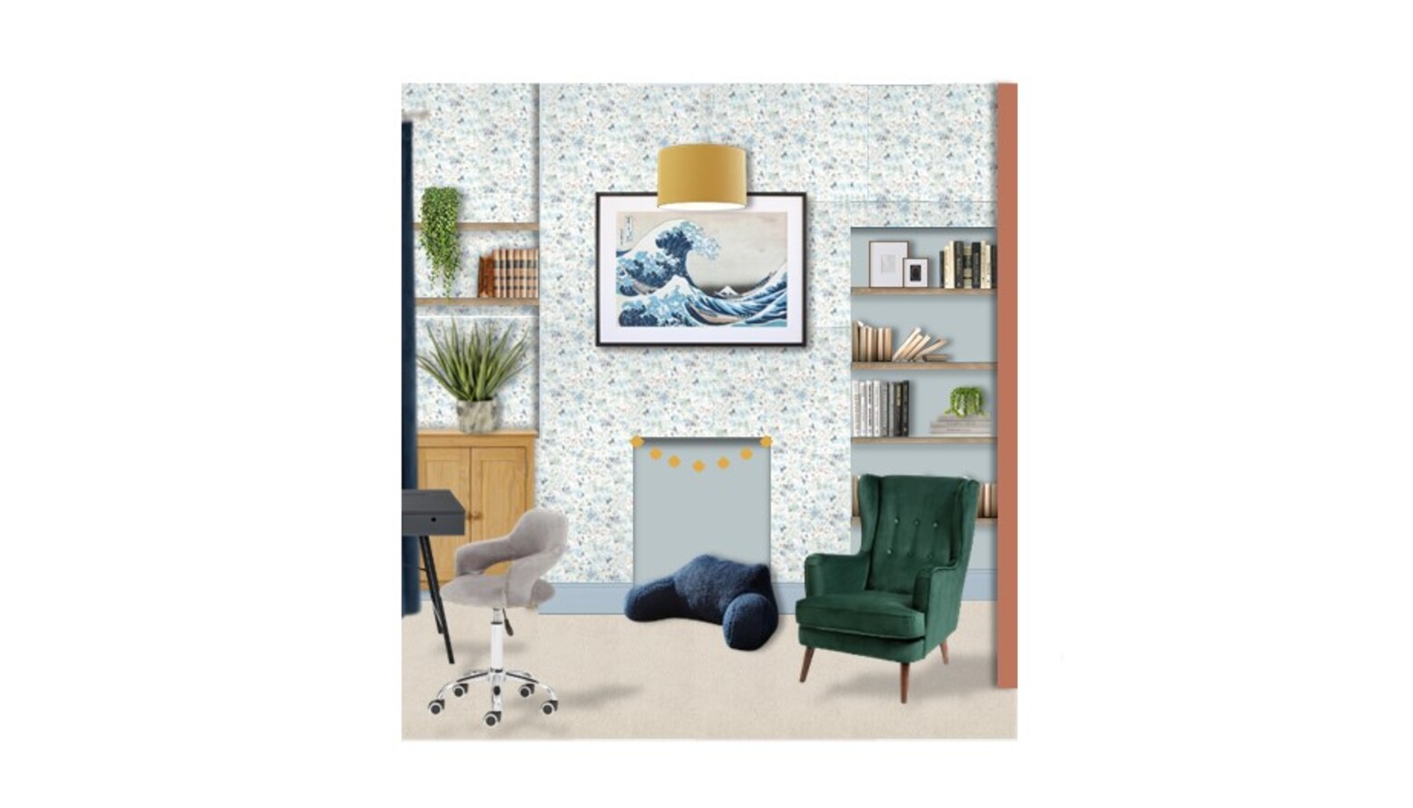I have incorporated your artwork of “The Great Wave” and suggested the Libby Edmonson stretched canvas in 700 x 700mm, both which sets the tone of each room. You are welcome to choose a frame and print instead, it will look just as great!