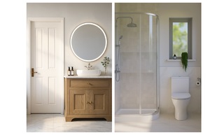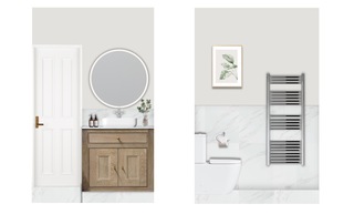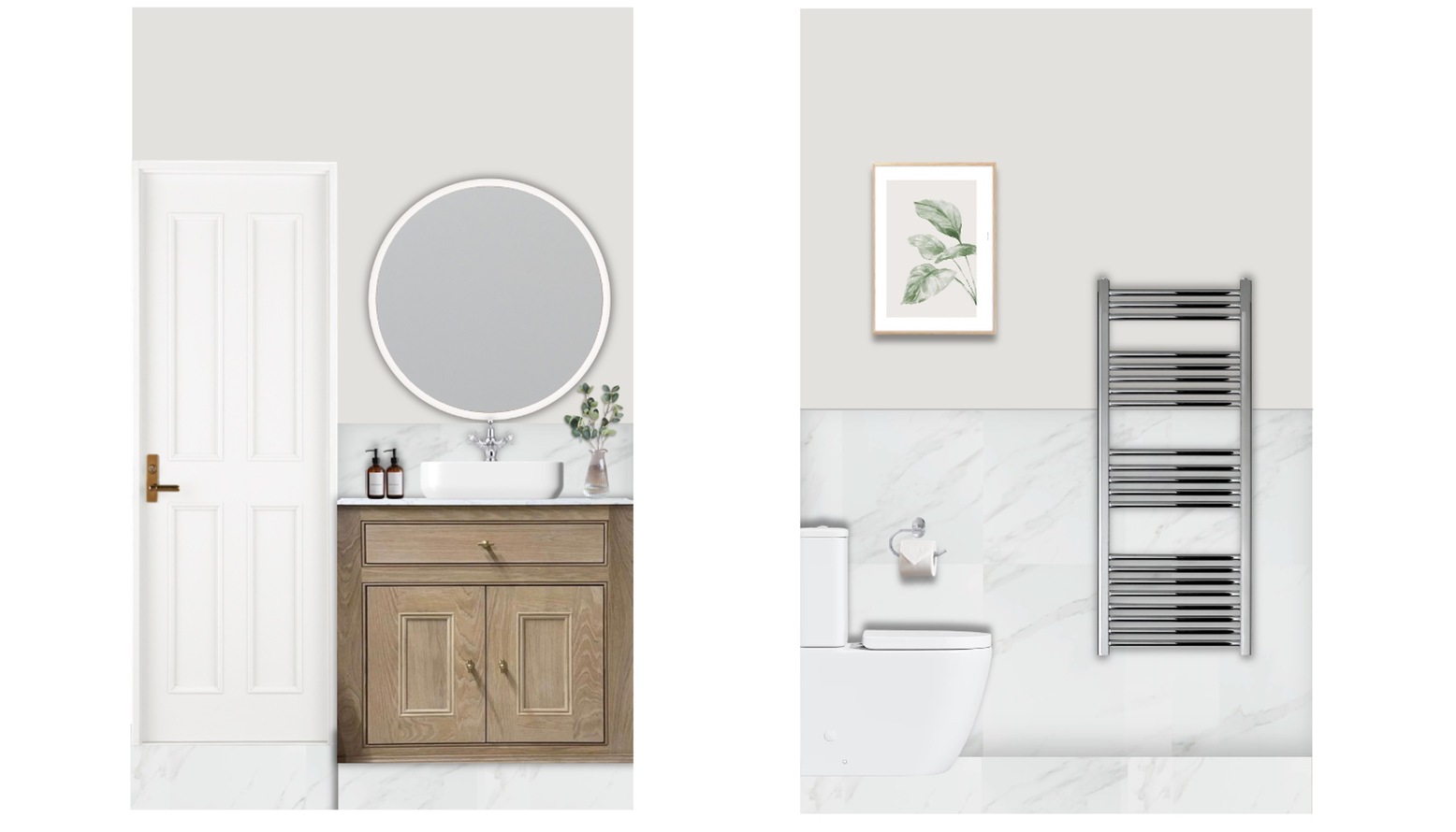 This bathroom design harmoniously blends contemporary elegance with functional utility. A soothing palette of soft tones is complemented by a light wood vanity that features a marble top, creating a luxurious yet minimalistic look. Above the vanity hangs a round LED-illuminated mirror that not only serves as a stylish focal point but also provides ample lighting for daily routines.