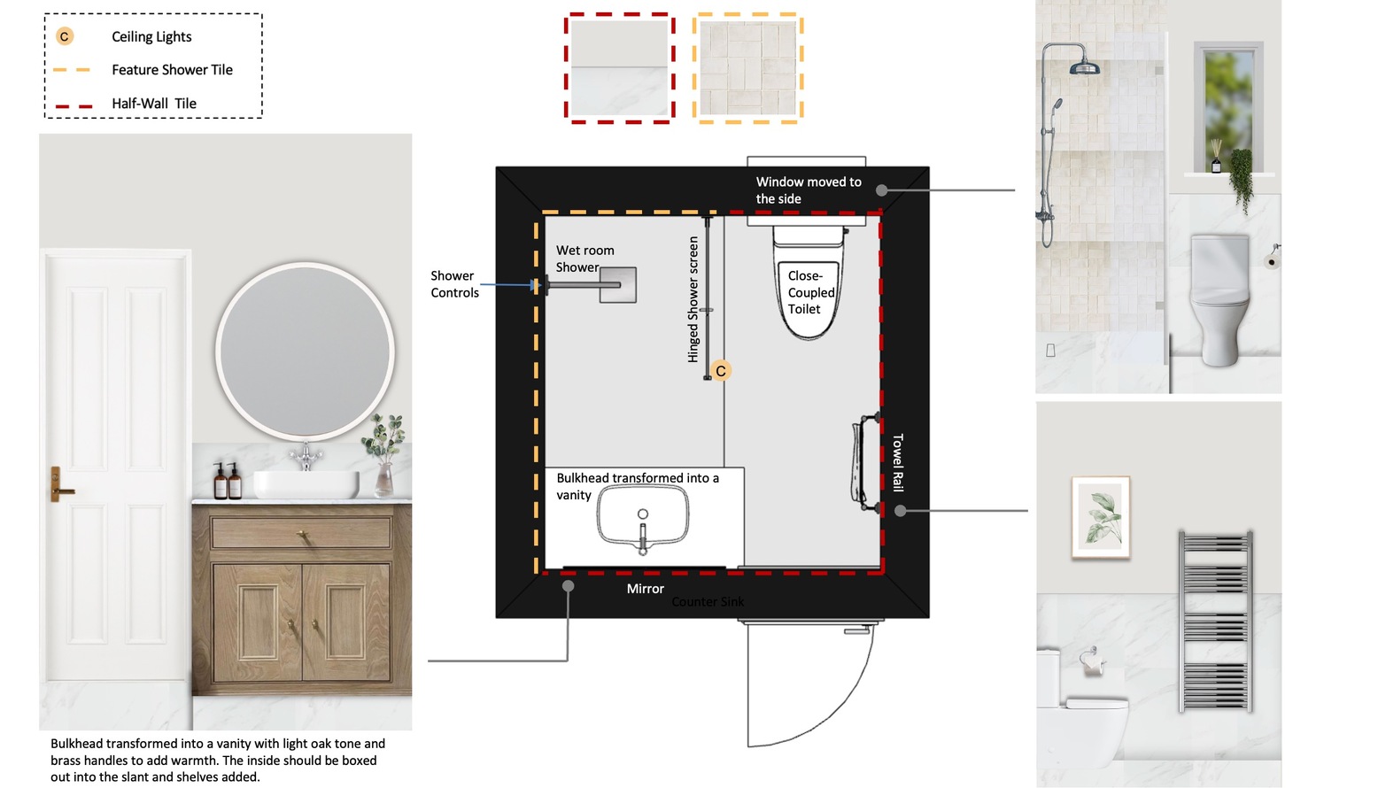 Natural light filters through the small window, which is framed by lush green foliage, creating a refreshing atmosphere. The careful selection of brassware fittings ensures a cohesive look throughout the space, while the thoughtful layout allows for convenience and functionality.
