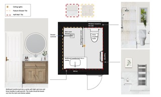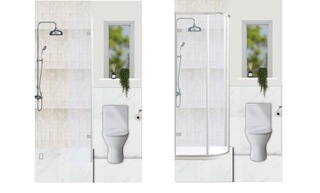 The compact rimless back-to-wall toilet maximizes space and maintains a clean aesthetic, seamlessly integrating with the overall design. Decorative touches such as a plush bath mat, luxurious cotton towels, and a welcoming reed diffuser add comfort and warmth.