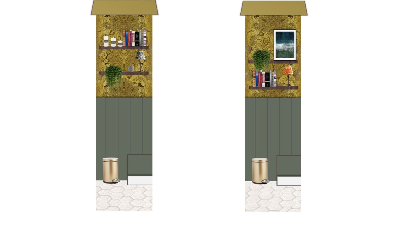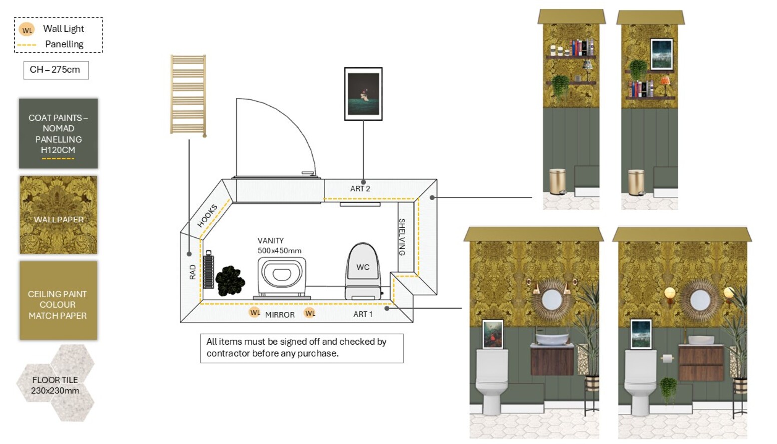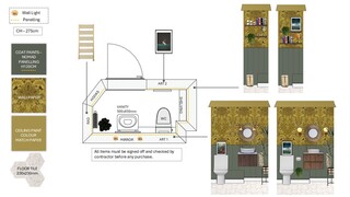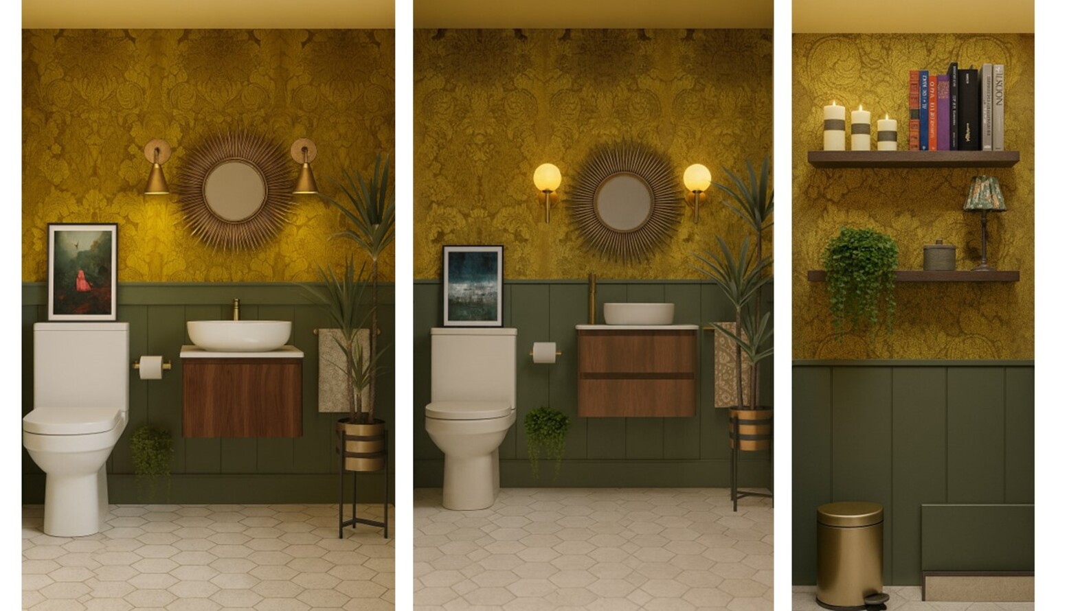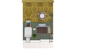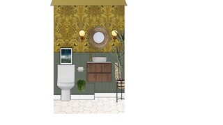 This charming ground floor WC features a rich blend of textures and colors, creating a warm and inviting atmosphere. The walls are adorned with an intricate yellow wallpaper that adds a touch of elegance, complemented by a dark green paneling at the bottom. A modern wall-hung toilet is positioned thoughtfully beside a minimalist washbasin, creating a clean and streamlined look. The vanity beneath the basin showcases a beautiful wood finish, providing both functionality and style. Brass accents throughout the space enhance the overall aesthetic, with stylish wall-mounted lighting fixtures flanking a round mirror that serves as a central focal point above the basin. To add greenery, decorative plants in stylish pots bring life to the design, while framed artwork adds a personal touch. The flooring features a chic hexagon tile pattern that ties the elements together, creating a cohesive look from the walls down to the floor.