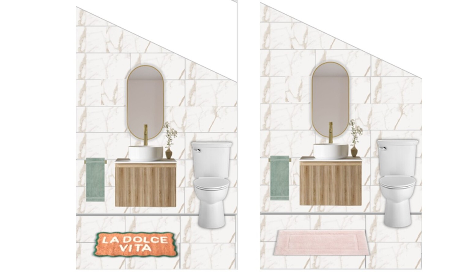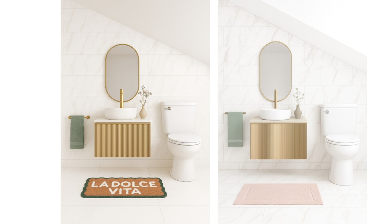 A stylish Brabantia newIcon Pedal Bin in a metallic gold finish maintains cleanliness while seamlessly adding to the decor’s refined palette. Lastly, a faux String of Pearls plant in a pot introduces a hint of greenery, softening the overall aesthetic and completing this beautifully curated bathroom design.