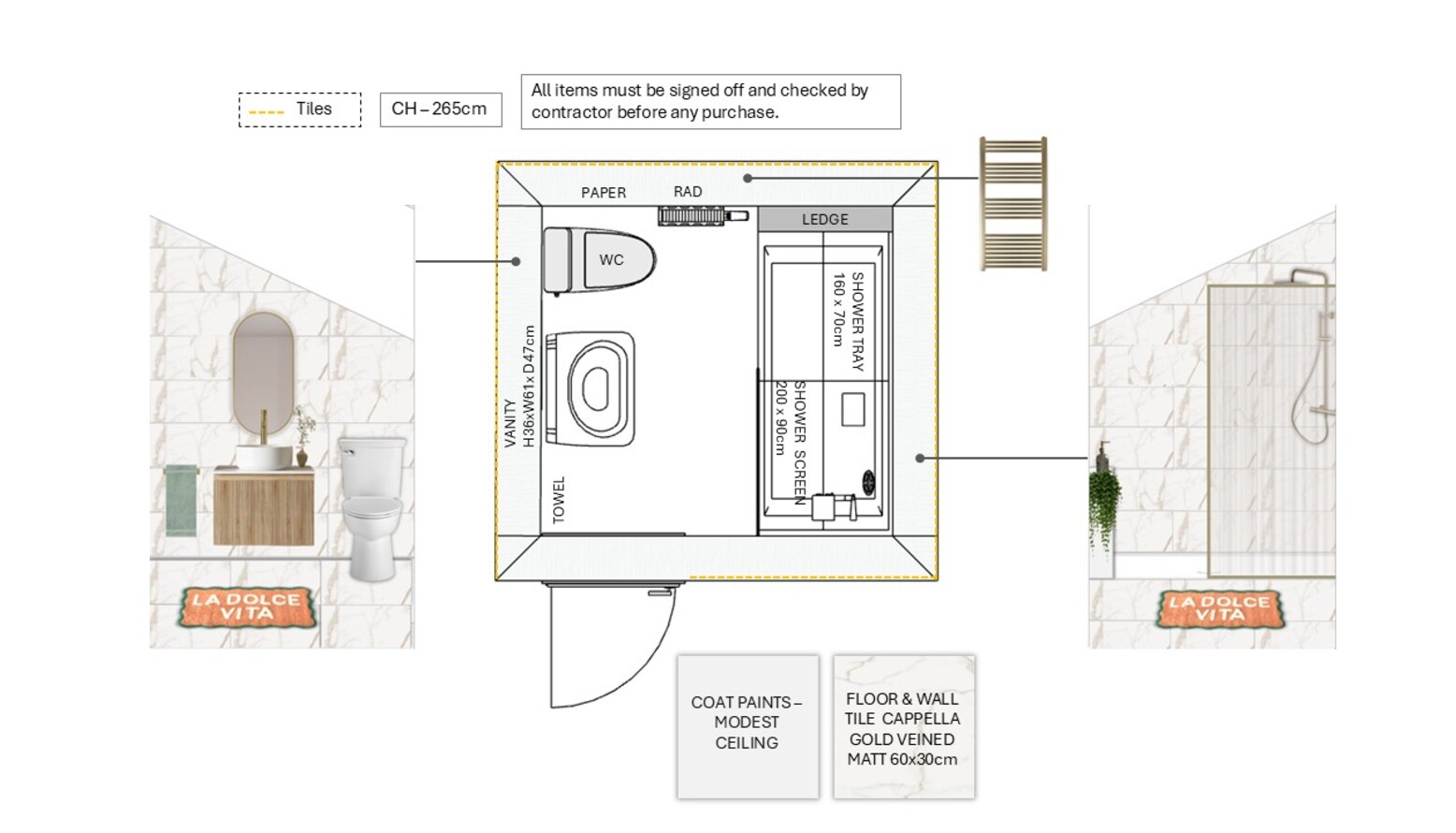 Textiles elevate the comfort of the space; plush John Lewis Egyptian Cotton Towels in a dusty green hue are neatly displayed, while the Peach La Dolce Vita Bath Mat adds a playful touch with its warm terracotta backdrop and bold lettering. Additional brushed brass accessories, including the Harbour Clarity Robe Hook and Toilet Roll Holder, enhance functionality without compromising style.