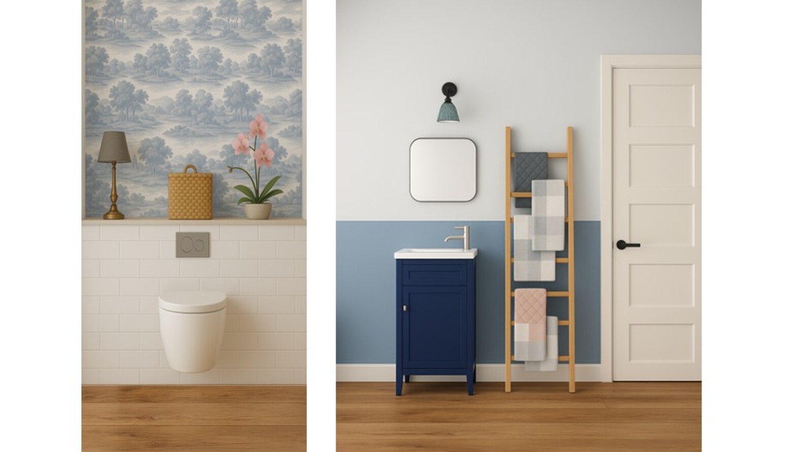 Overall, this cloakroom is a harmonious blend of textures and colors, showcasing modern bathroom fittings against a serene wallpaper backdrop.