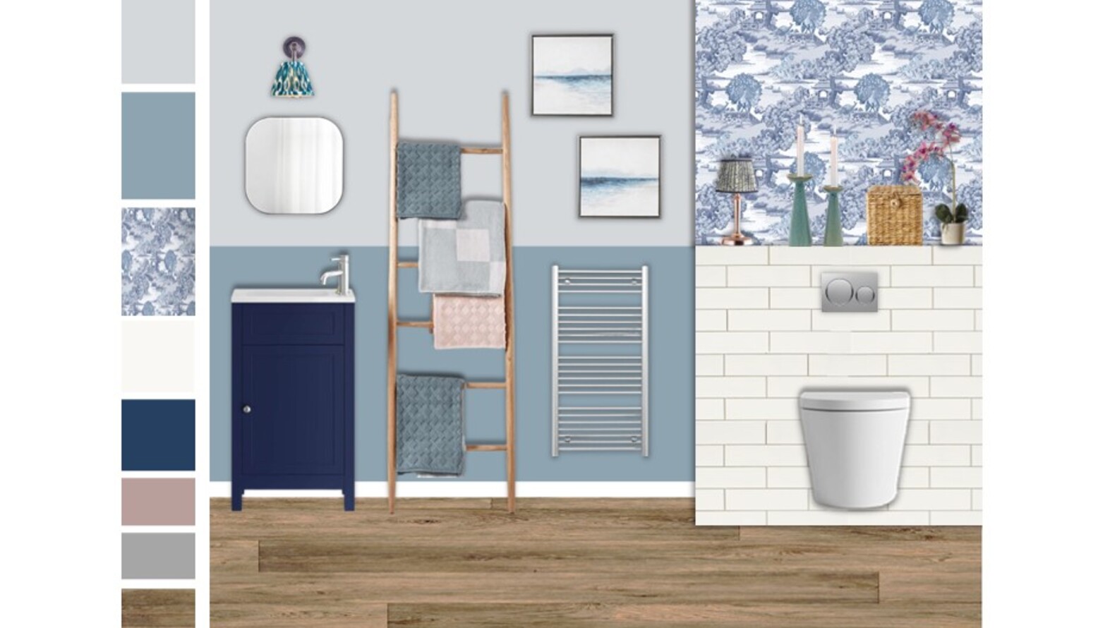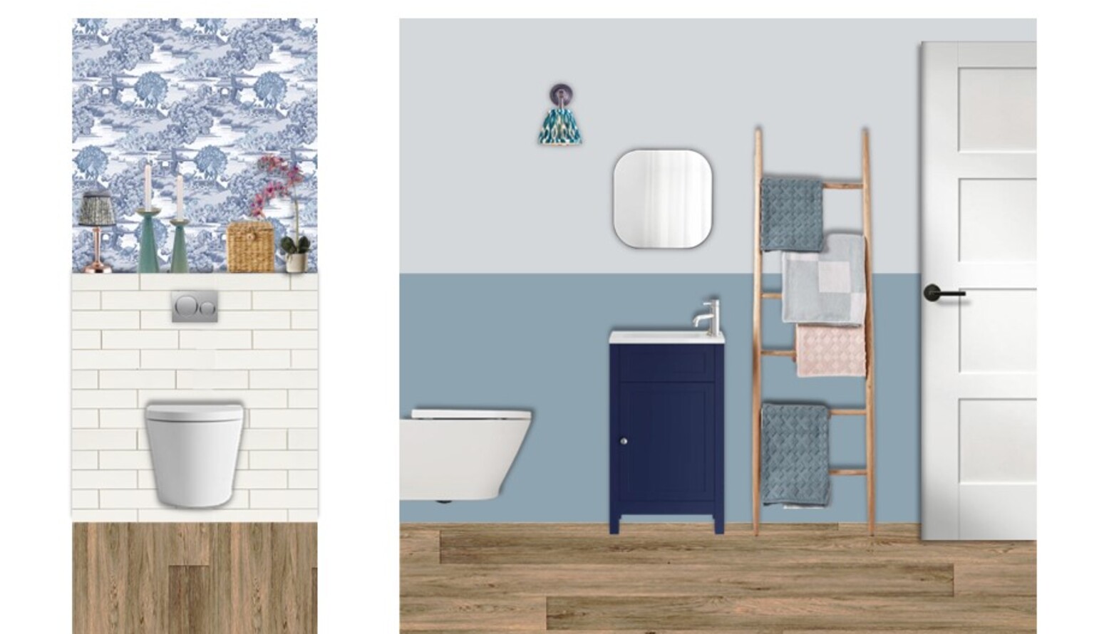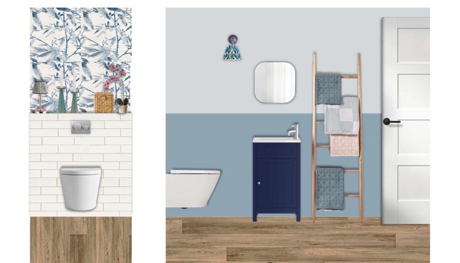 This stylish cloakroom WC features a fresh and inviting color palette that beautifully combines functionality with aesthetics.