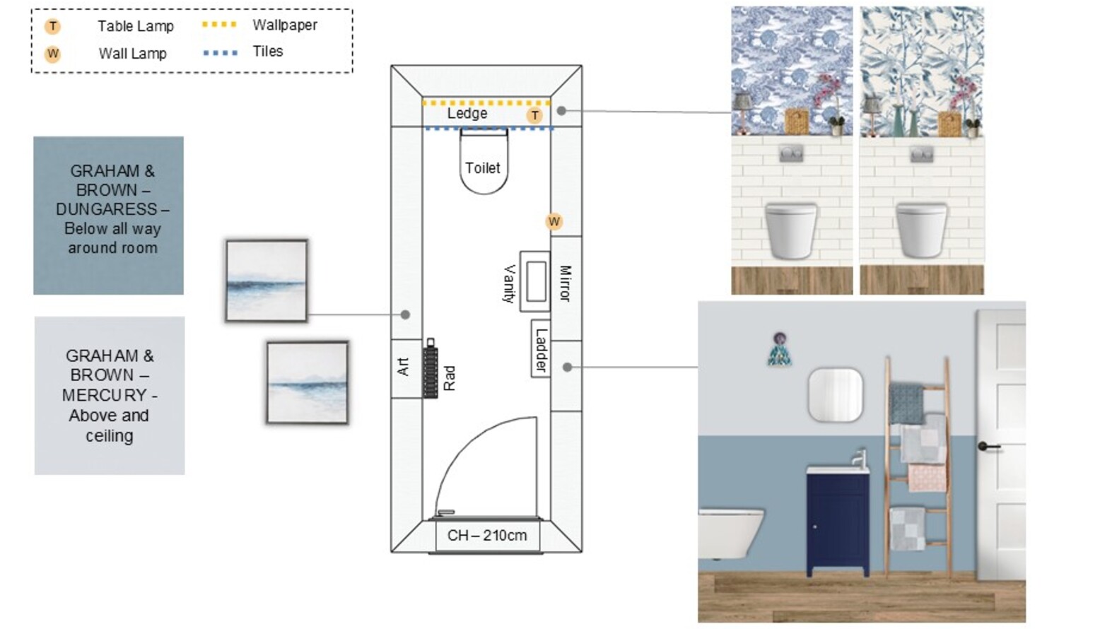 The lower wall is painted in a calming blue, while the upper portion remains light, enhancing the room's spacious feel. Specific shades from Graham & Brown, such as Dungarees and Mercury, echo the blue hues and add depth to the design.