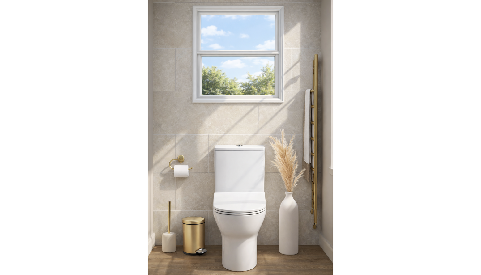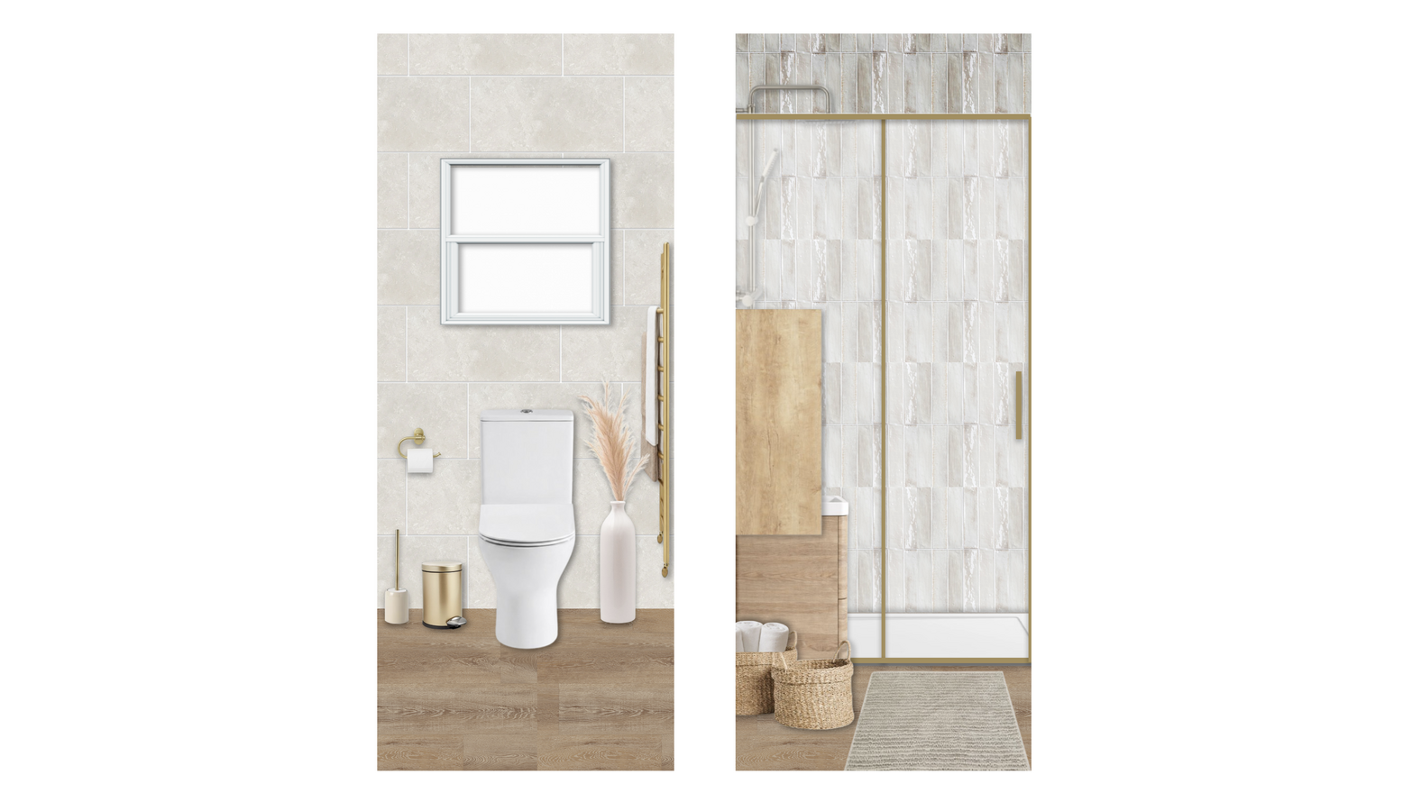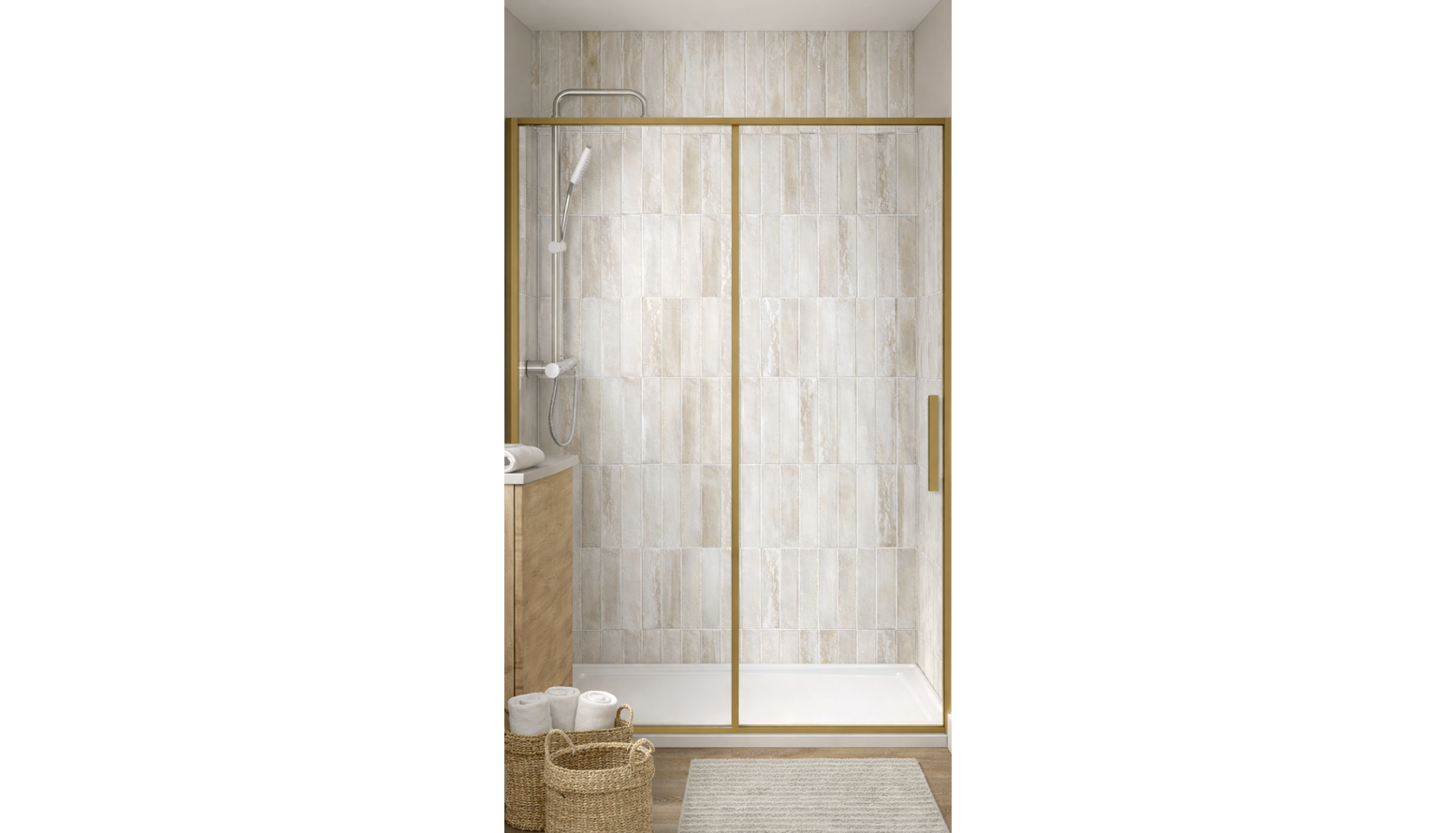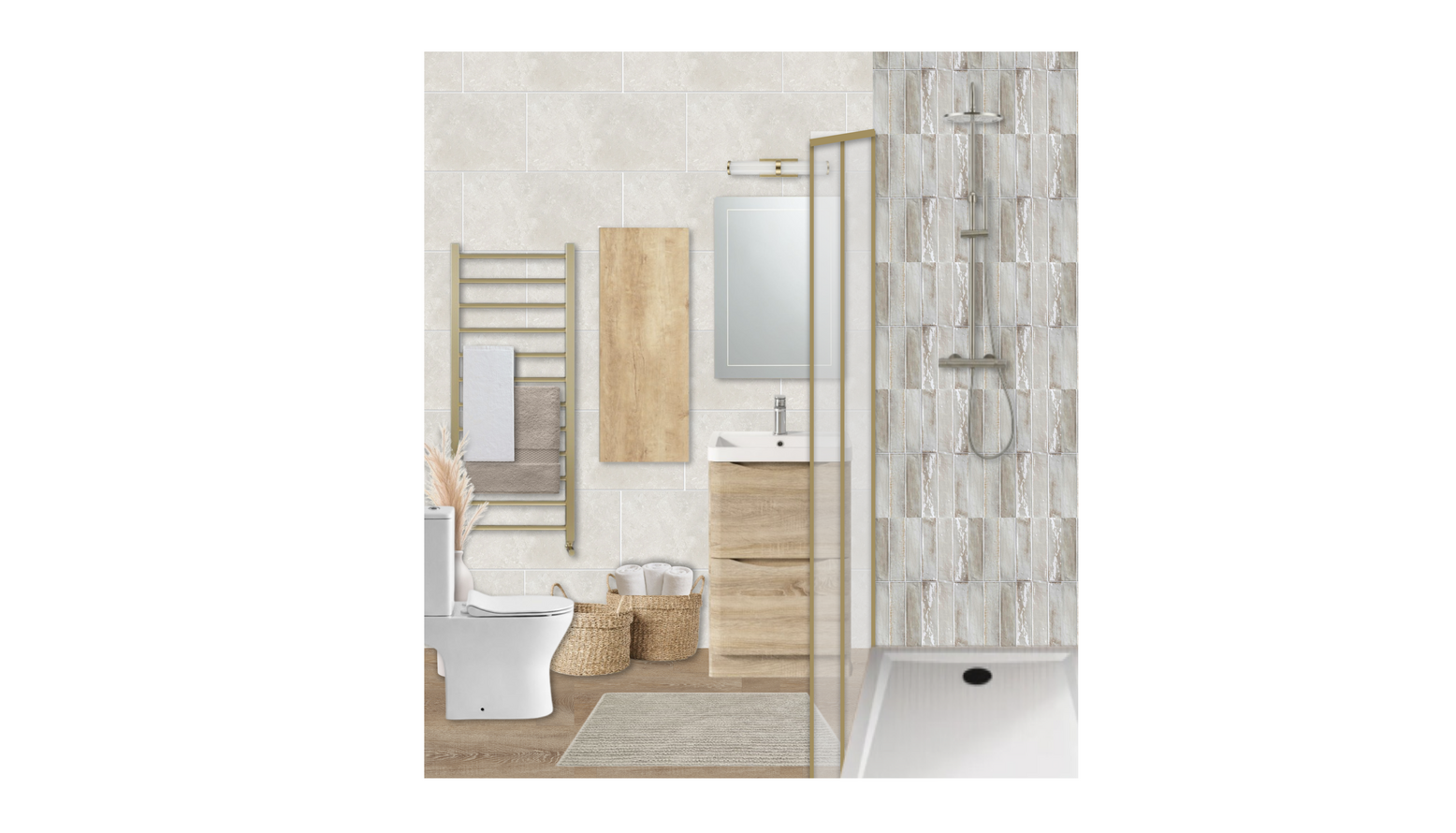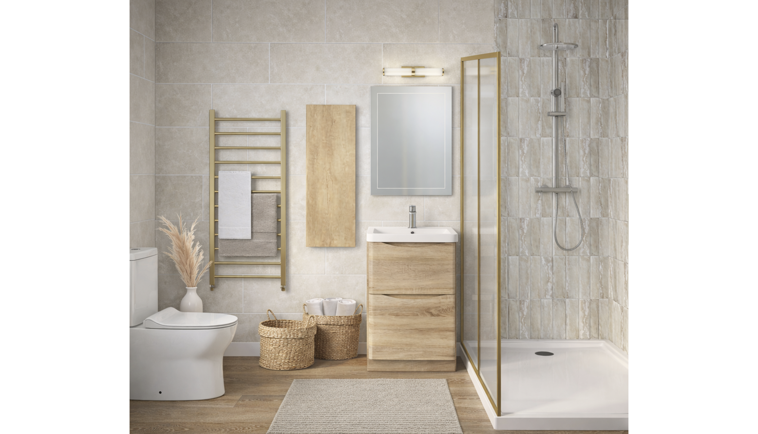 This modern bathroom features an elegant and functional design, enhanced by a light oak floorstanding vanity unit complete with a basin, providing ample storage while adding warmth to the space. The brushed brass sliding shower door creates a stylish entrance to the shower, contrasted by the textured tiles that line the walls, adding depth and sophistication. Illuminated by an IP-rated wall light above the vanity, the large mirror reflects light and enhances the perception of space. A brushed stainless steel basin mixer complements the modern aesthetic and is paired seamlessly with a compact rimless toilet for a clean, uncluttered look. The tall storage cabinet in rustic oak offers additional storage solutions without sacrificing style. For those chilly mornings, the brushed brass heated towel rail not only warms your towels but also adds a stylish touch to the overall decor. Complementing the furnishings, natural woven baskets provide subtle storage options, harmonizing with the overall neutral color palette. Plush, latte-colored cotton towels are neatly arranged, ready for use. The floor is adorned with a textured area rug, adding comfort underfoot and bringing warmth to the wooden flooring. This bathroom effortlessly combines functionality with contemporary aesthetics, creating a serene retreat that is both practical and visually appealing.