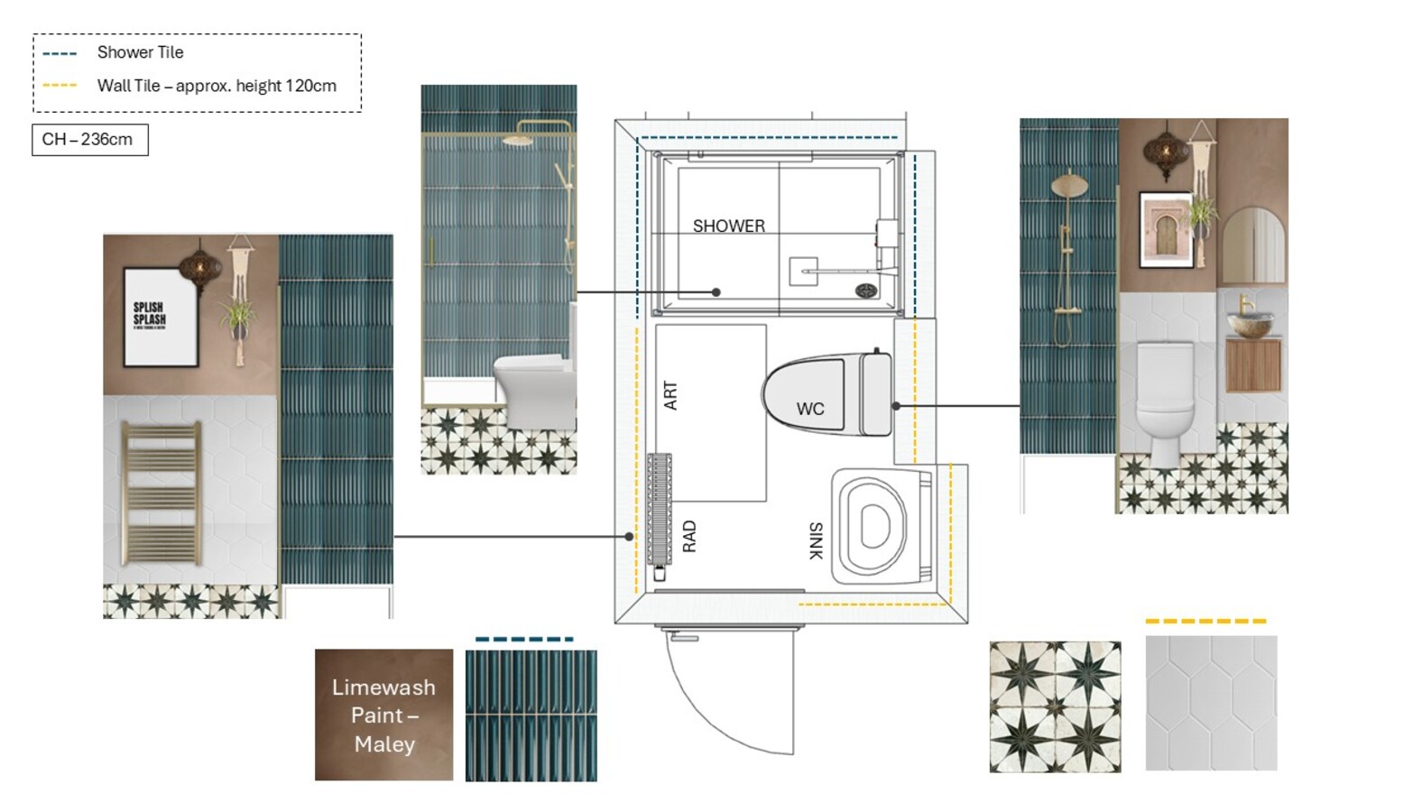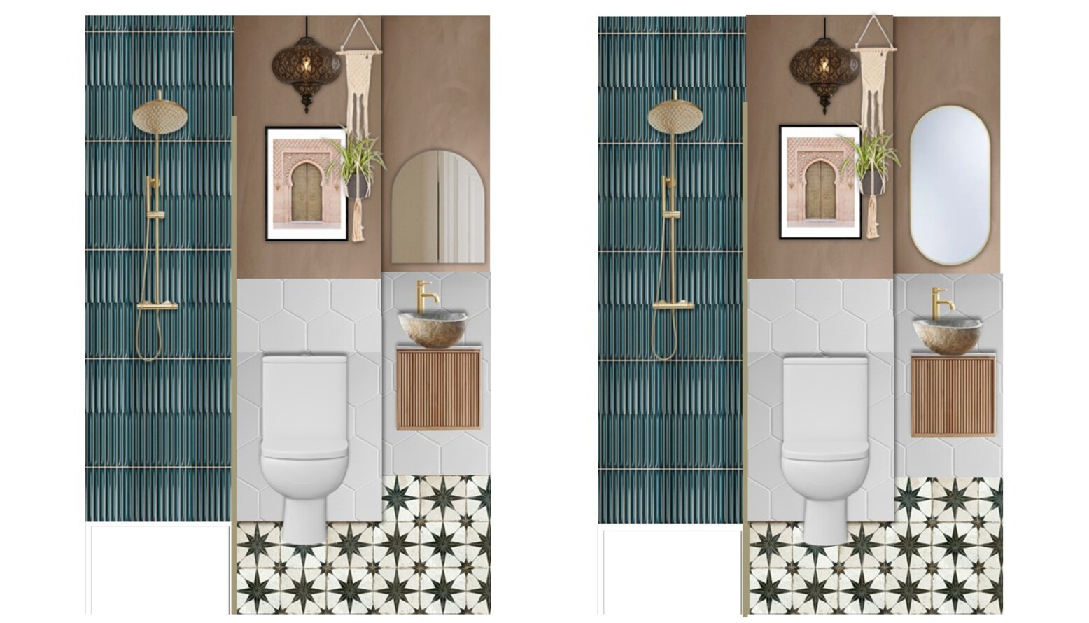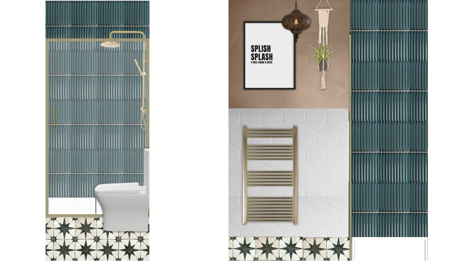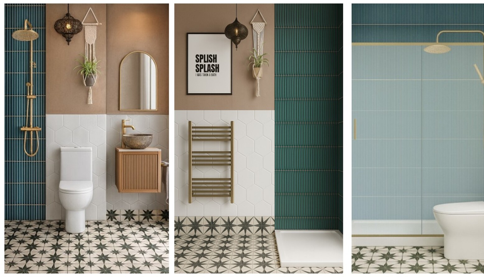 This bathroom exudes a modern yet cozy ambiance with its thoughtful design elements. The shower area features a stunning brushed brass sliding shower door, complemented by a thermostatic rigid riser shower kit in the same finish. A lightweight, geometric hexagonal tile adorns the lower wall, merging elegantly with deep aqua-green tiles that add a contemporary flair. Central to the room is a stylishly retro bathroom vanity made of warm wood, topped with a natural stone basin and a brushed brass faucet. Reflected in an elegant brushed brass-framed mirror above, this space is both functional and visually appealing. Adjacent to the vanity, a sleek rimless toilet seamlessly integrates into the design, contributing to the clean lines of the space. A gold over-the-door hook rack provides a practical touch, enhancing organization without compromising aesthetics. The heated towel rail boasts a brushed brass finish as well, maintaining consistency in metal accents throughout the room. A whimsical framed bathroom print adds character, while greenery from a macrame plant holder introduces life to the design. The floor showcases an intricate star-patterned tile, further enriching the visual interest of the space. A plush peach bath mat softens the landing near the shower, adding warmth underfoot. Lighting is delivered by a chic pendant shade, creating an inviting atmosphere. This bathroom design harmonizes comfort and elegance, perfect for rejuvenating moments.