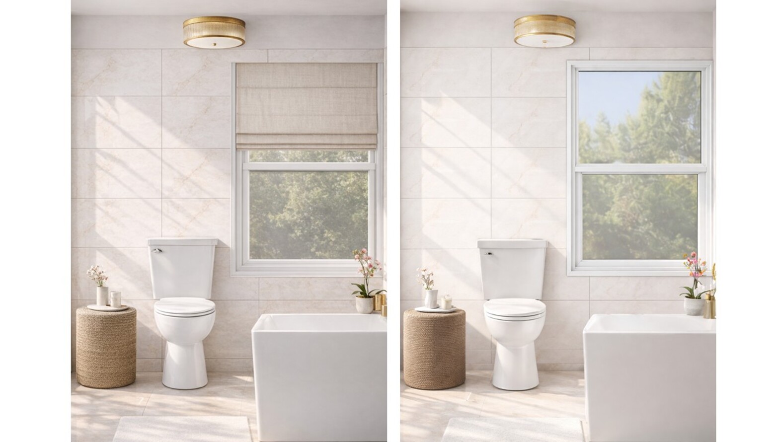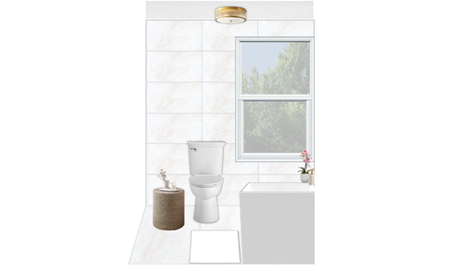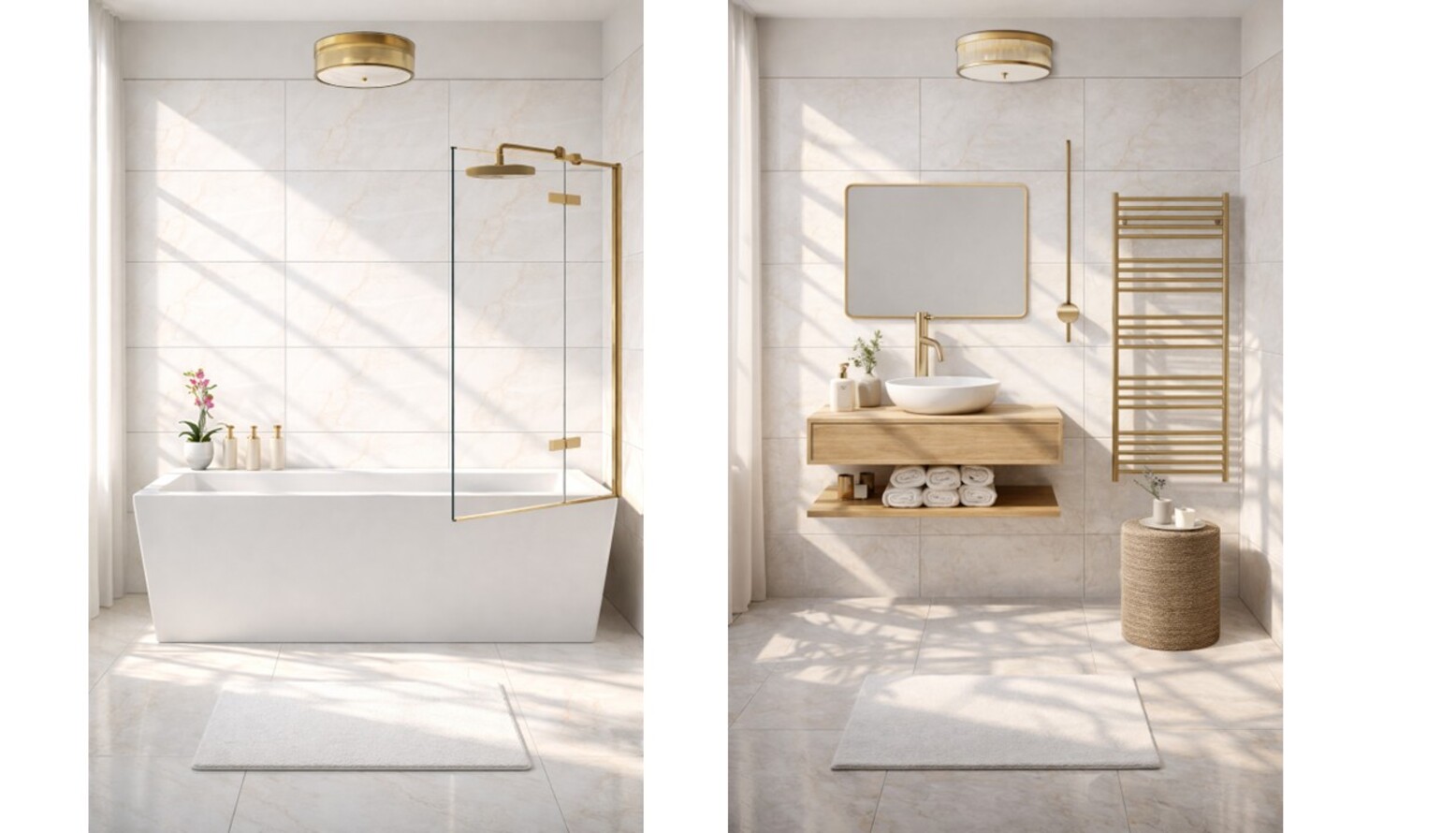 A stylish round ceiling light in antique brass adds warmth and sophistication, illuminating the room beautifully. The porcelain tiles, designed to mimic marble, provide a textured backdrop that enhances the overall aesthetic.