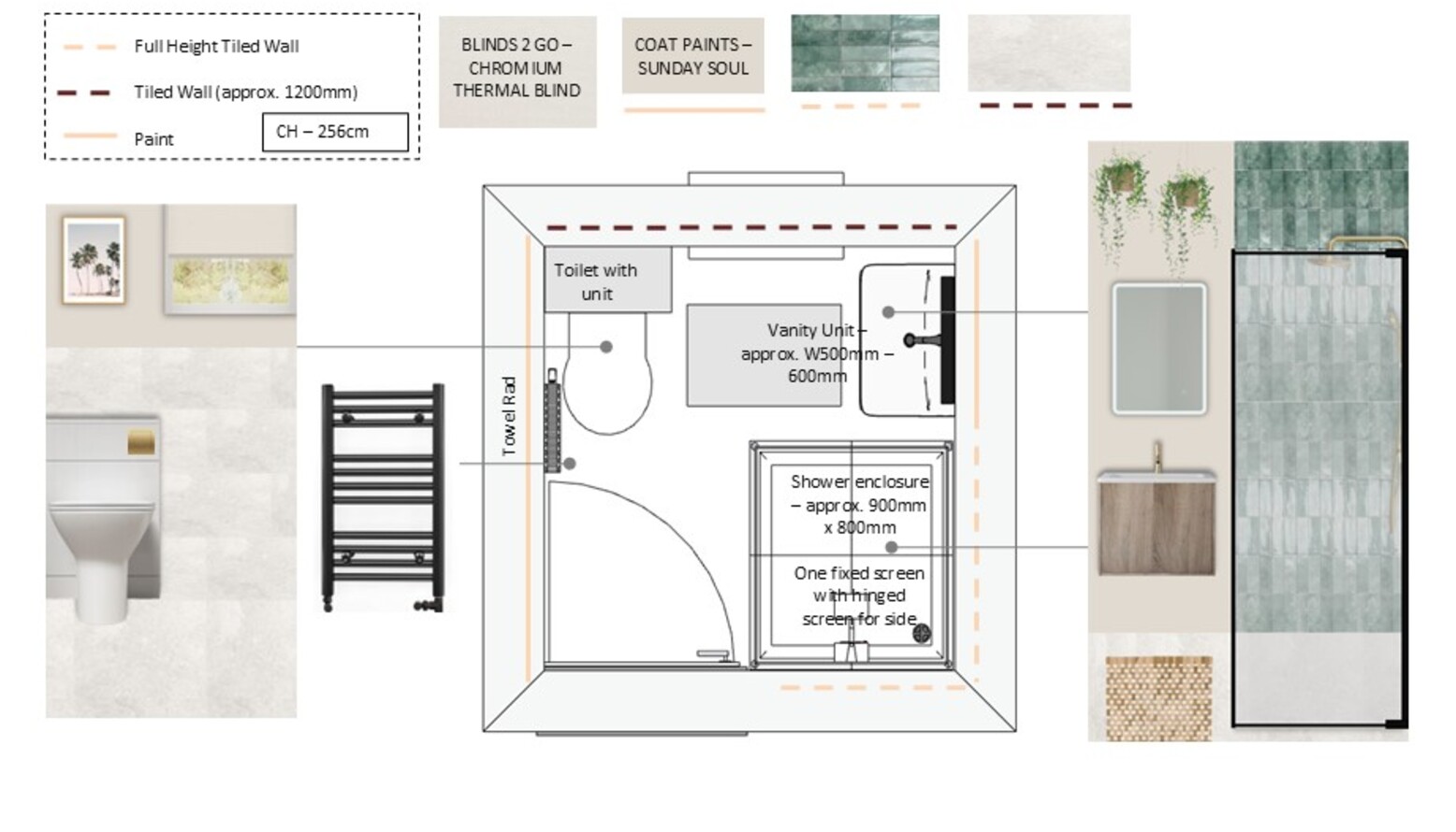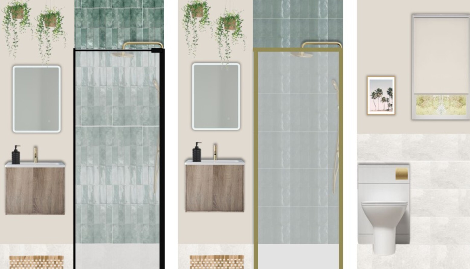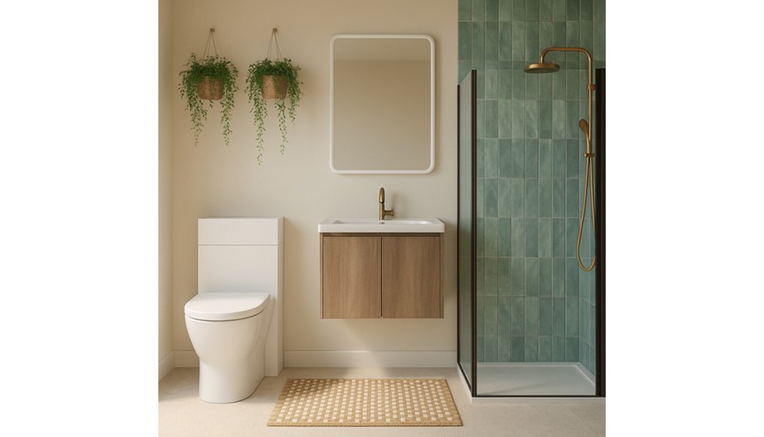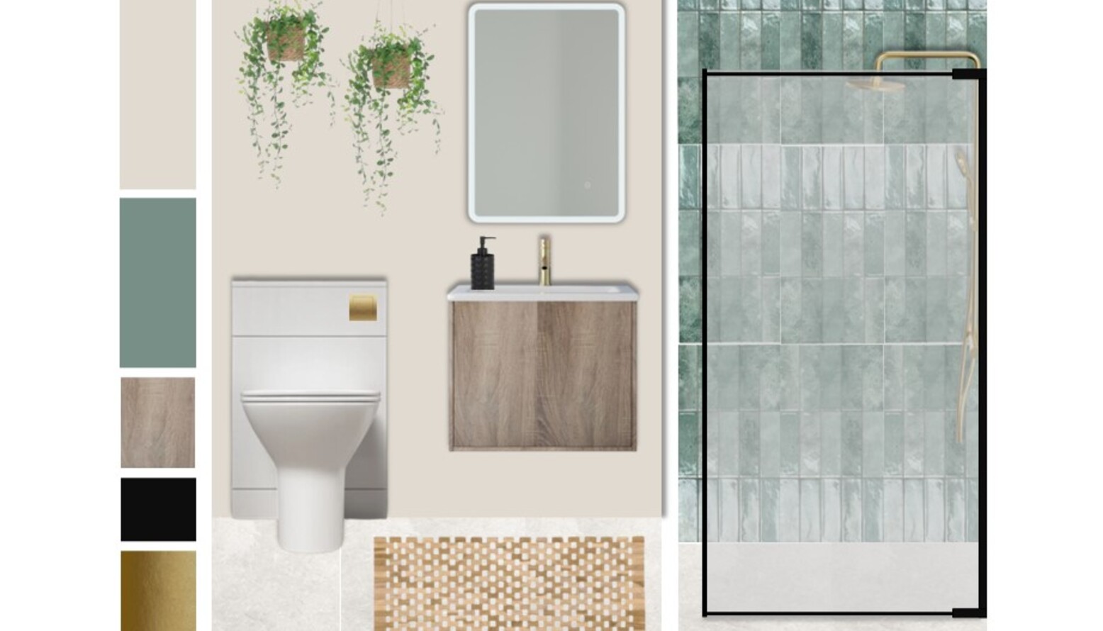 This stylish bathroom design features a harmonious blend of modern and functional elements. Wall-hung furniture, such as the Sonoma Oak vanity unit with an integrated basin, offers a clean aesthetic while maximizing floor space. The space is complemented by a Vellamo LED illuminated steam-free mirror, enhancing visibility and adding a touch of luxury. A matte black heated towel rail provides both comfort and style, while the brushed brass fittings, including a basin mixer tap and shower kit, create an elegant contrast against the clean lines of the fixtures. The shower area showcases a fixed end screen alongside a hinged door, designed to provide flexibility and allow for a wet room feel. The green wall tiles in the shower area contribute a refreshing pop of color, while the soft beige floor tiles ensure a warm and inviting atmosphere. Hanging plants add a touch of nature, creating a serene environment. Additional features include a compact back-to-wall toilet and accessible storage solutions, making this bathroom both practical and aesthetically pleasing.