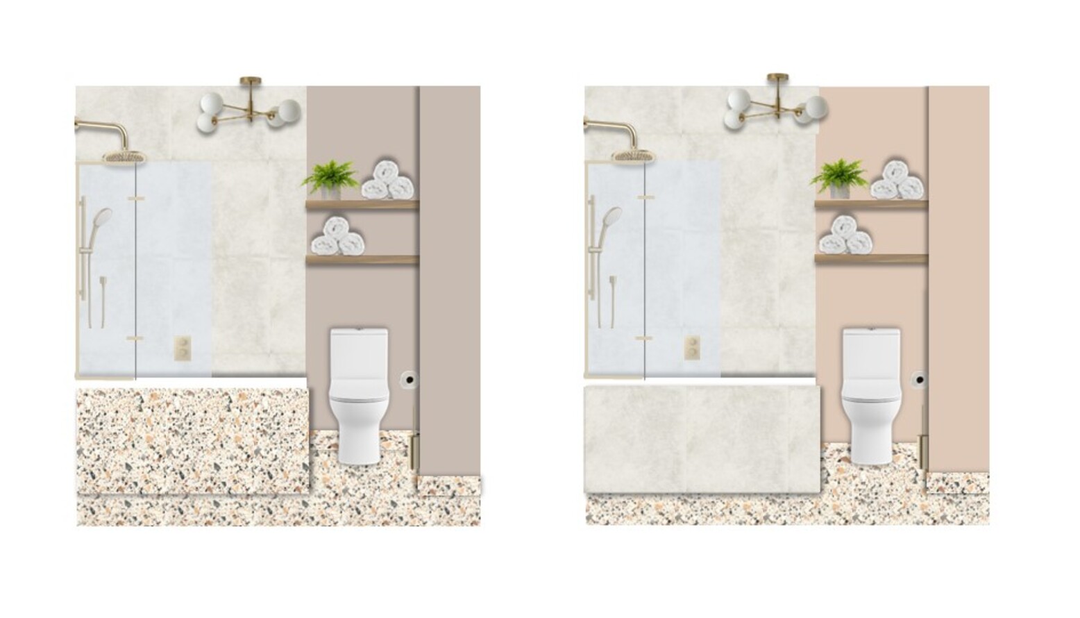 A spacious bathtub, with a sleek design and surrounded by a stylish textured panel, invites indulgence. Above it, a transparent shower screen complements the bathroom aesthetic, paired with a sophisticated shower fixture featuring a brass finish.