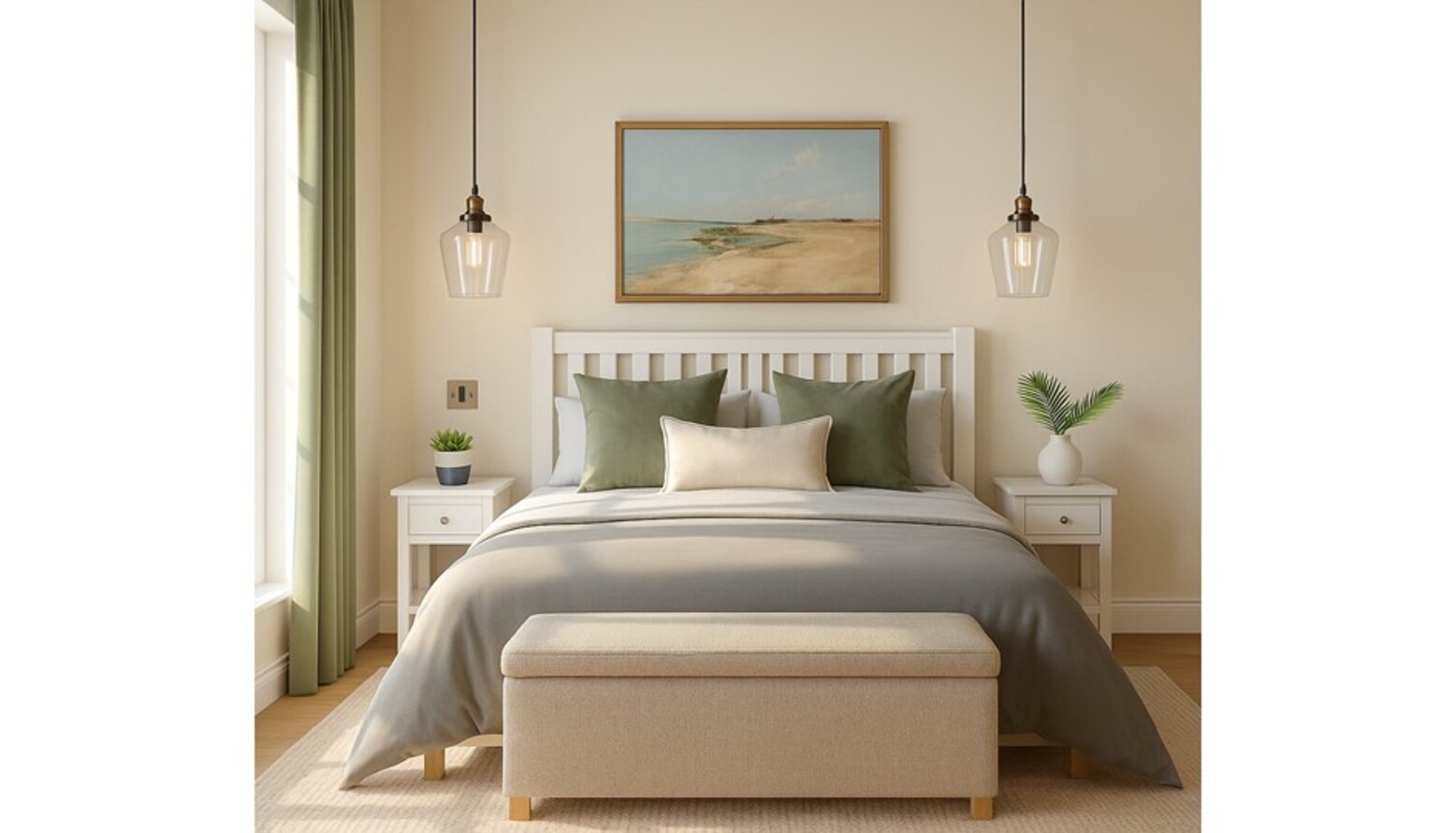 This master bedroom features a serene and inviting design with a neutral color palette. The walls are painted in a soft, warm hue that enhances the natural light flowing in. At the center, a comfortable bed showcases a layered bedding arrangement, including a luxurious white sateen duvet and decorative pillows in calming green shades.