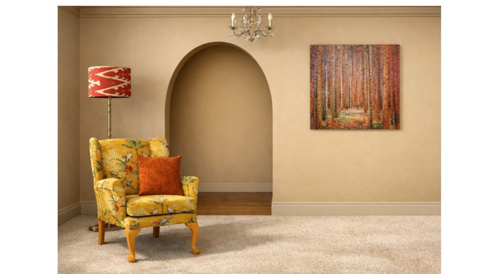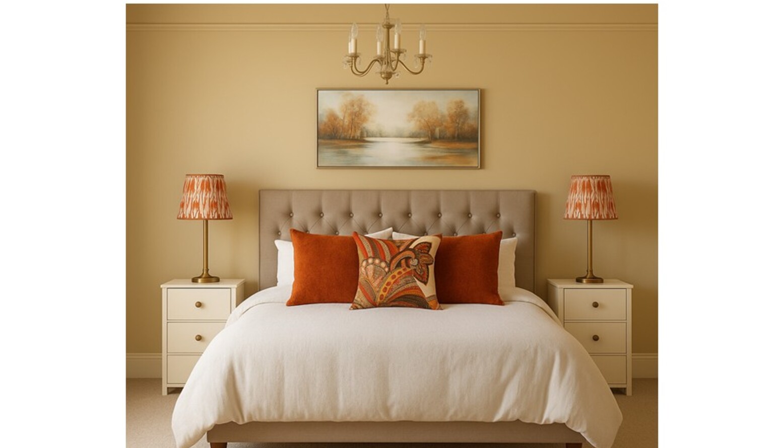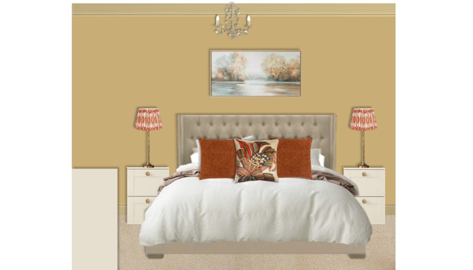 The bedroom features a warm and inviting color palette. A large upholstered headboard, adorned with tufting, serves as a focal point for the space, complementing the soft cream bedding. Flanking the bed are two stylish bedside tables, each topped with a classic Bamboozle table lamp in antique brass, adding a touch of elegance. The decorative elements include cushions in a rust hue, paired with a patterned lumbar cushion that introduces intricate details, enhancing the comfort and visual interest. Above the bed hangs a stunning canvas print, 'Tannenwald I' by Gustav Klimt, which contributes a sophisticated art piece that harmonizes beautifully with the room's overall aesthetic. The ceiling is graced with a satin gold ceiling spotlight, providing functional and ambient lighting. The room is completed with framed canvas prints on the walls, introducing vibrant color and texture. In terms of window treatments, made-to-measure curtains are recommended, allowing for personalized style. The space is chic and functional, merging modernity with classic touches.