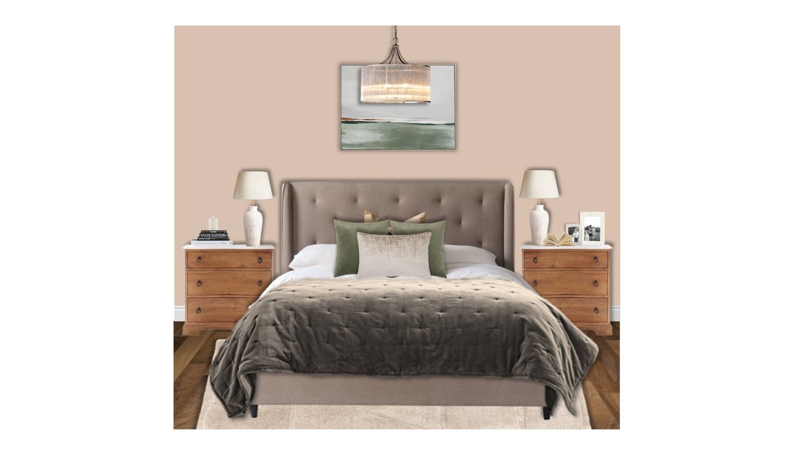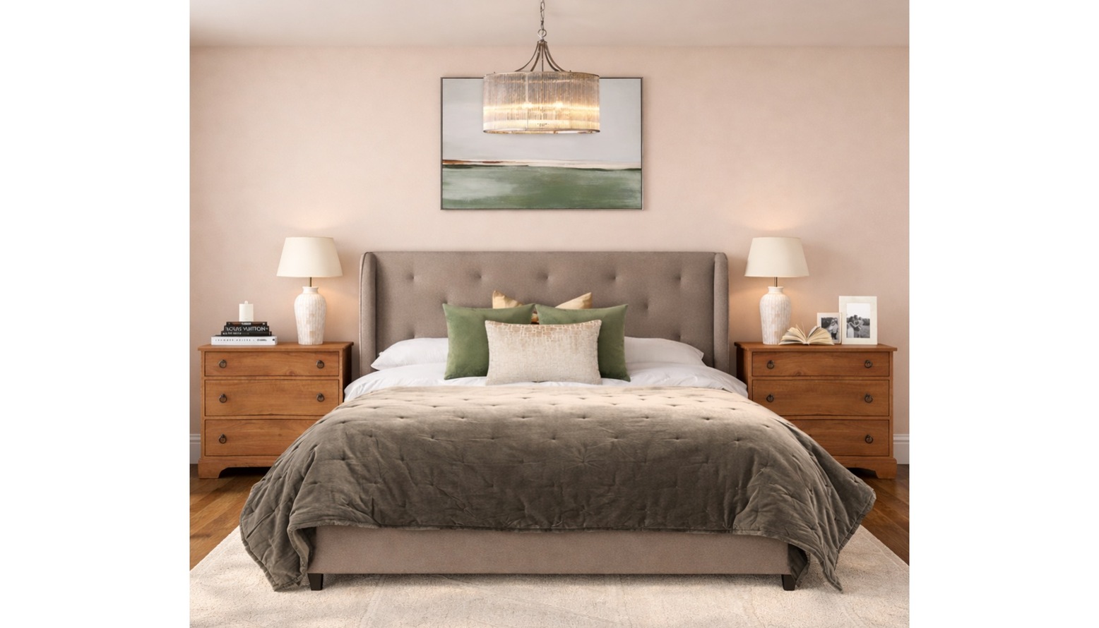The bedroom exudes a tranquil elegance with soft, muted tones and a cozy layout. A plush super king ottoman bed in mocha fabric takes center stage, adorned with an opulent velvet bedspread in neutral hues. Ample decorative cushions in shades of green and cream enhance the inviting look of the bed.