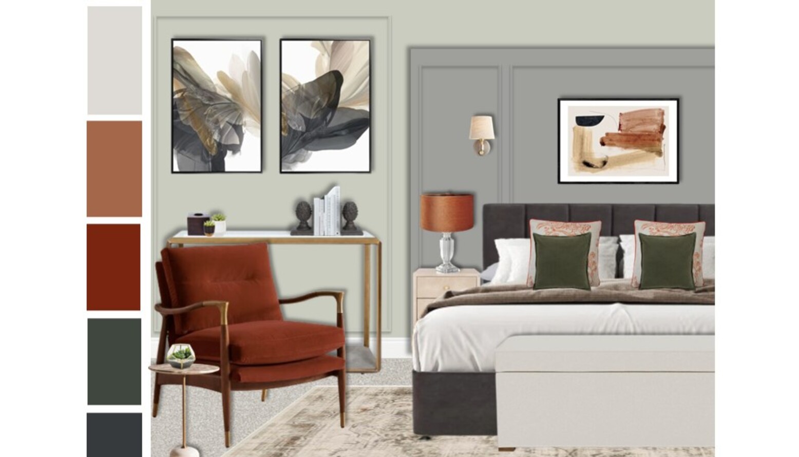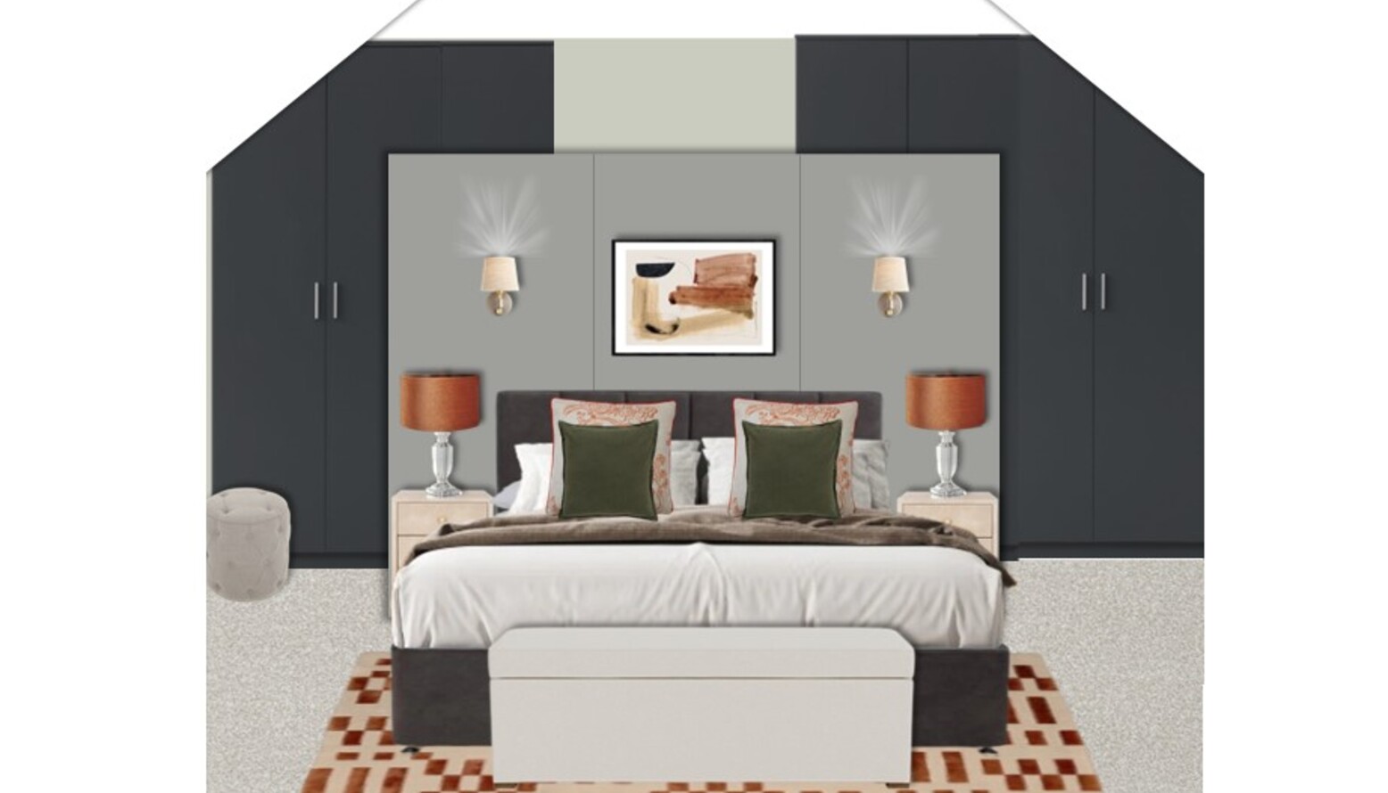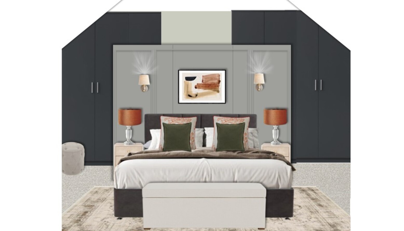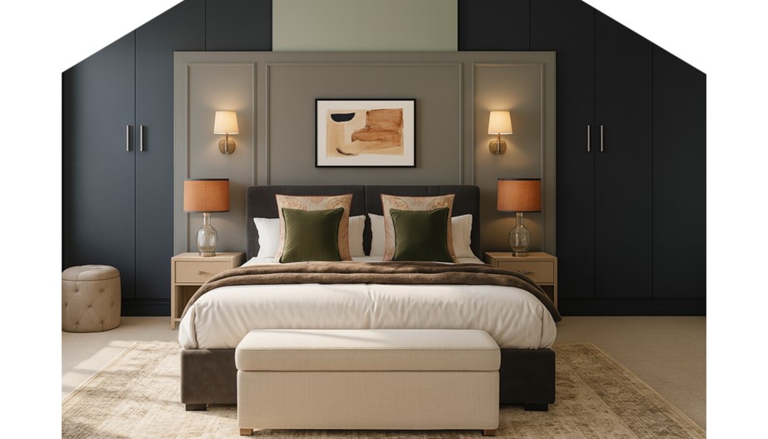 Art plays a pivotal role in this design with a framed artwork above the headboard, contributing an artistic flair to the overall ambiance. The walls are painted a muted Cromarty tone, creating a serene backdrop that contrasts beautifully with sleek dark cabinetry and elegant sconces that frame the artwork gracefully.