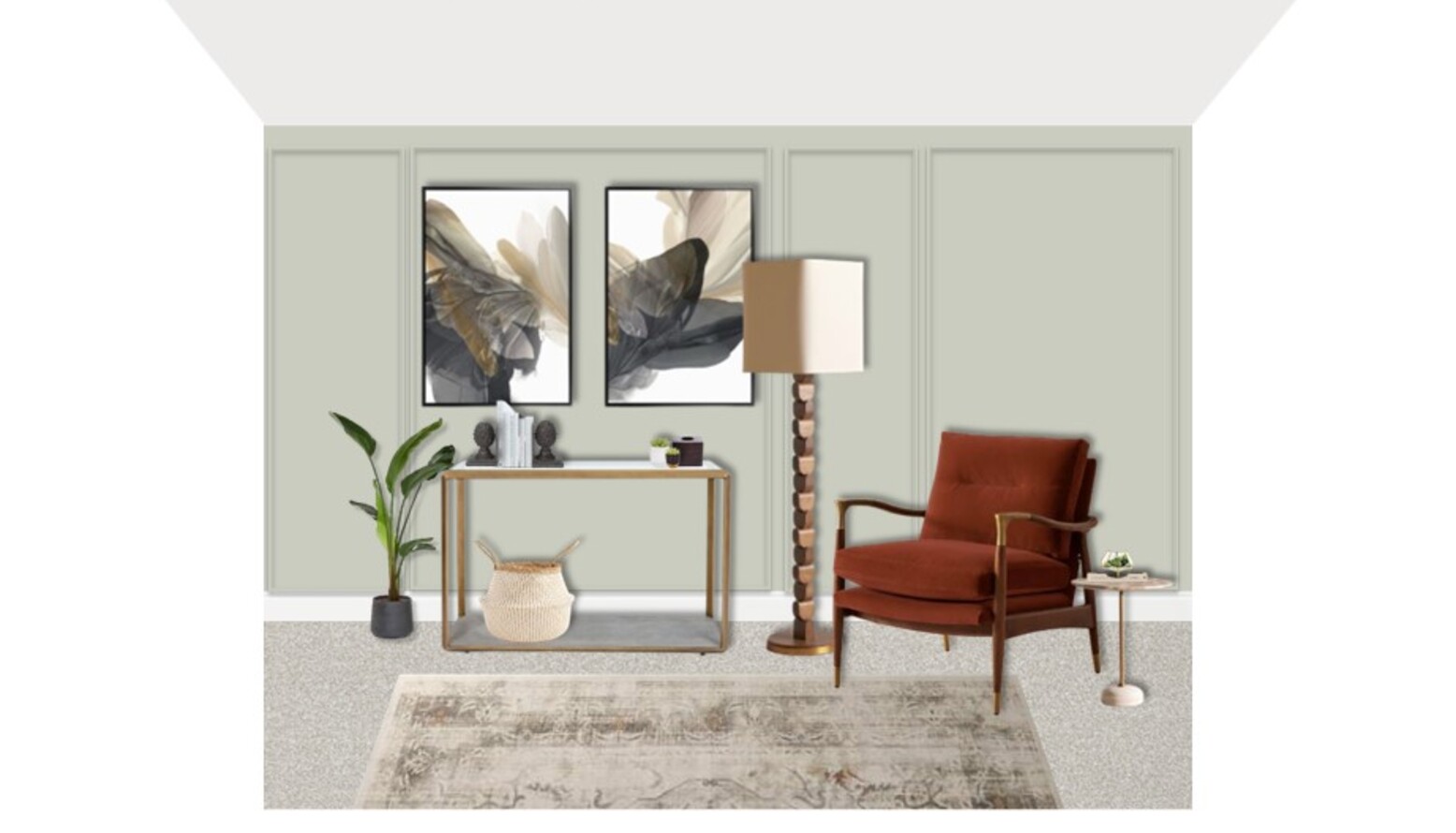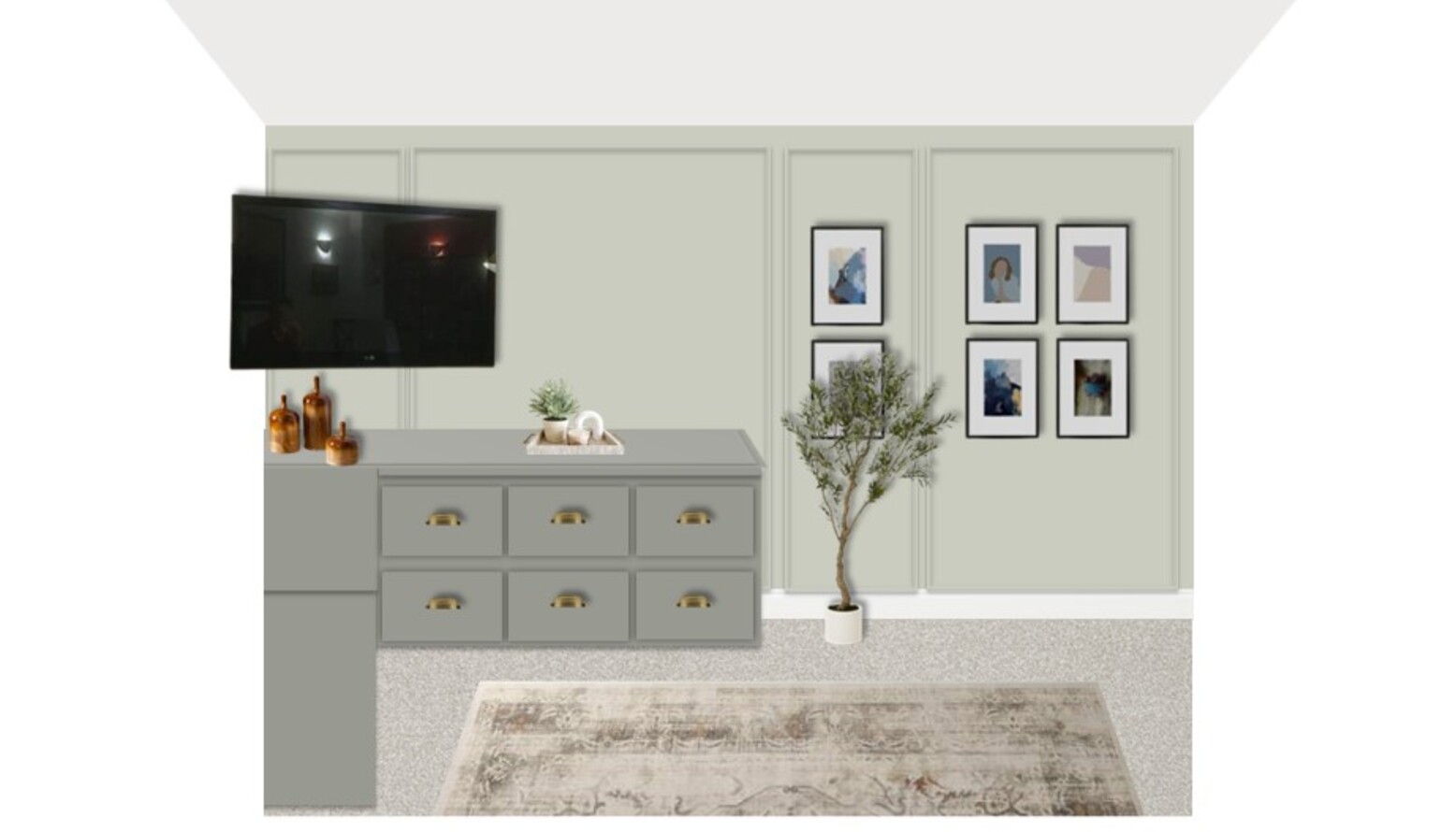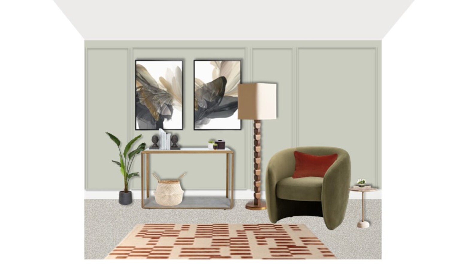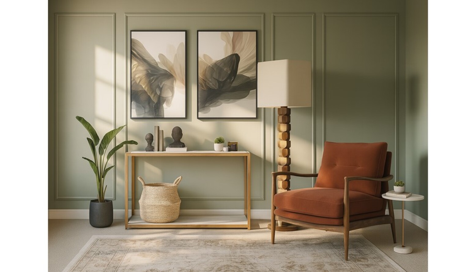 Natural elements are introduced through a lovely olive tree in a white pot, positioned strategically for visual balance. A soft rug in rust tones anchors the space, complementing the overall color scheme and adding warmth to the floor. A decorative glass vase and a circular wall mirror enhance the decor, reflecting the stylish atmosphere.