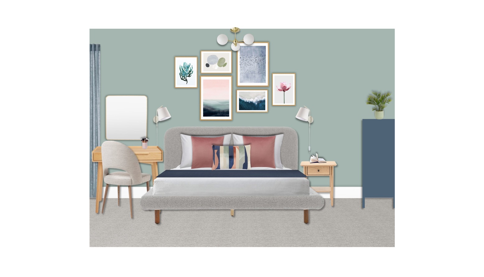 This bedroom features a serene color palette, with a calming green accent wall that enhances the overall ambiance. A plush stone grey kingsize bed takes center stage, its softness complemented by a variety of decorative pillows in shades of navy and muted pink.