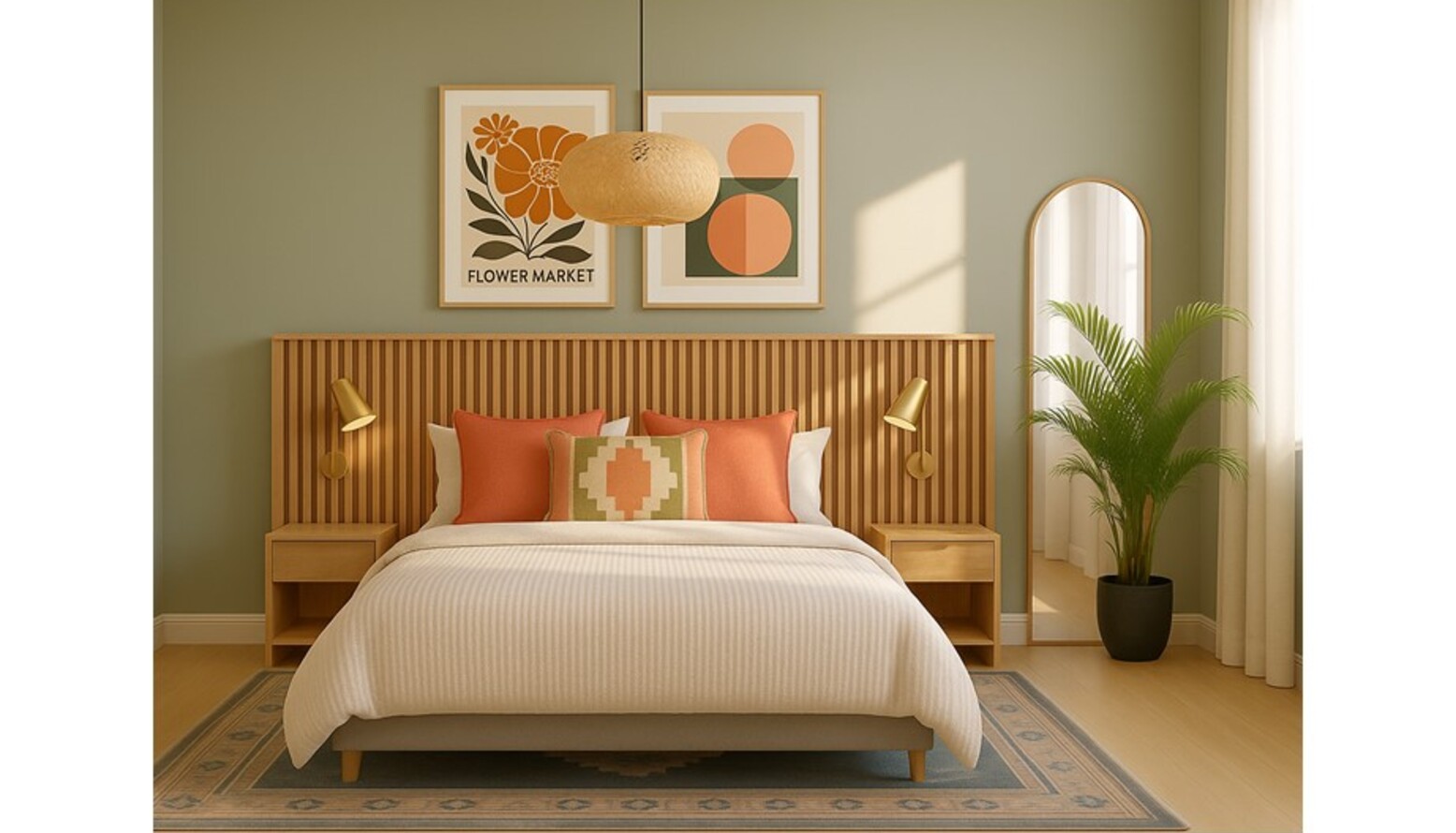 This bedroom design integrates a soothing palette with an emphasis on comfort and modern aesthetics. The walls are painted in a soft green hue, creating a tranquil backdrop. A charm-filled wood slat headboard anchors the bed, flanked by stylish wall-mounted brass swing arm lights for a blend of functionality and elegance.