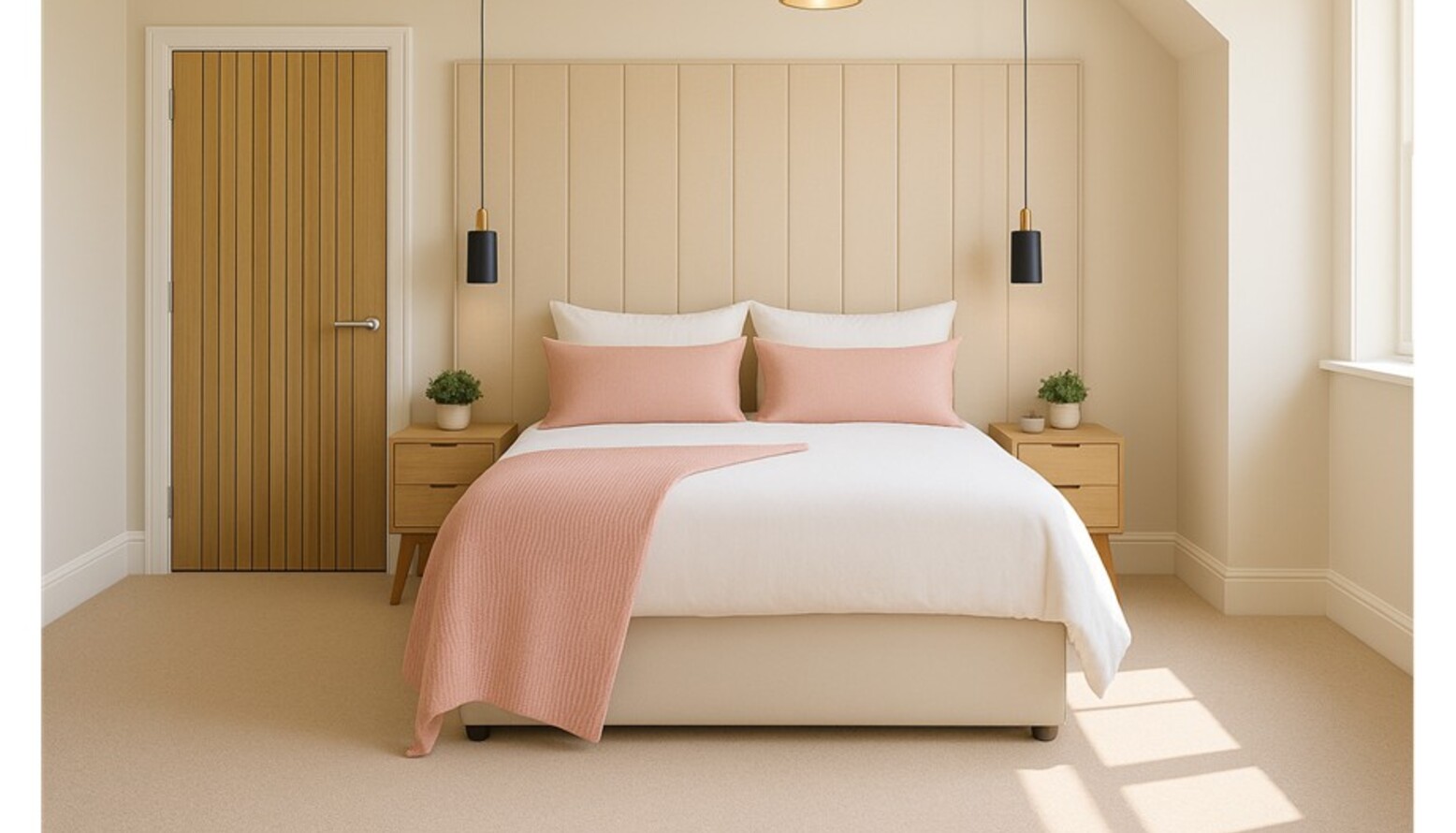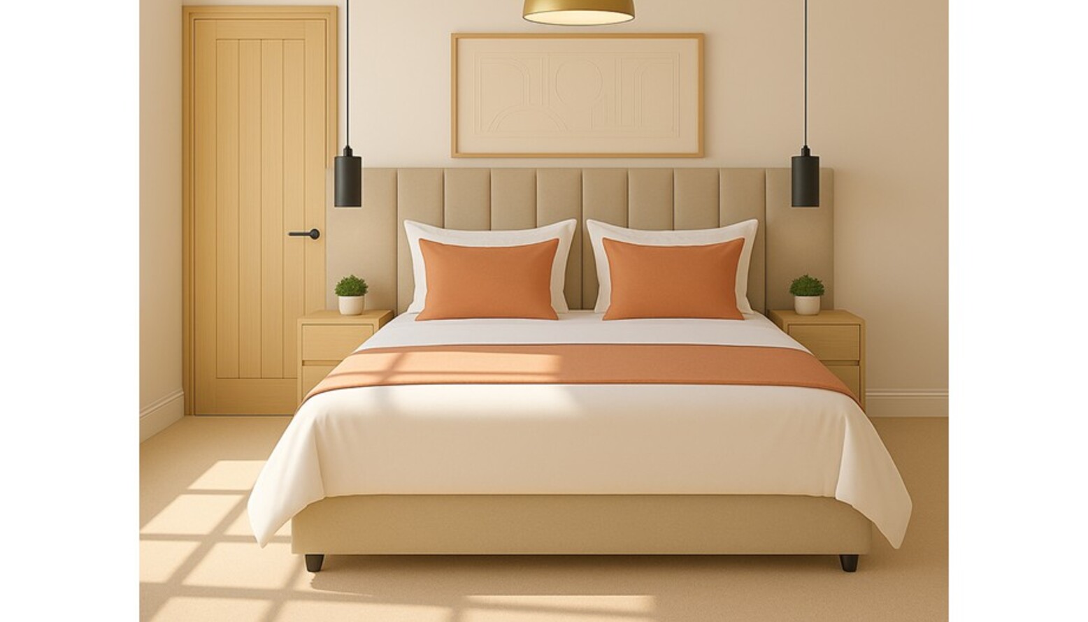 The bedroom features a serene and contemporary design that emanates warmth and comfort. The focal point is a generously sized double bed, luxuriously upholstered in neutral velvet, adorned with a soft white duvet and an elegant warm orange bed runner. Complementary scatter cushions in pink velvet enhance the bed's inviting aesthetic.