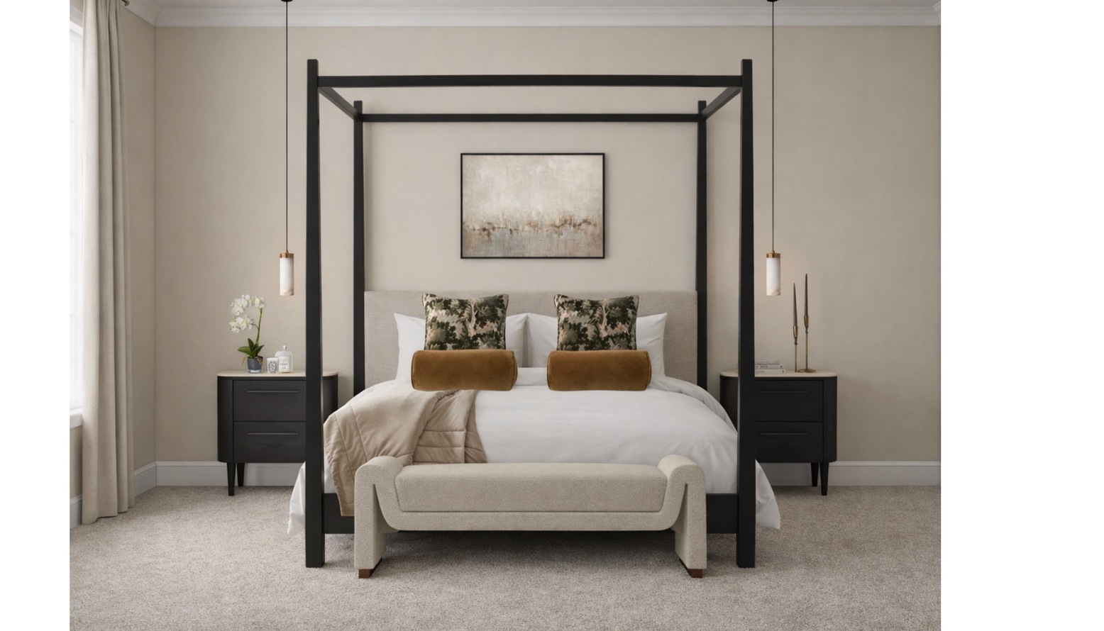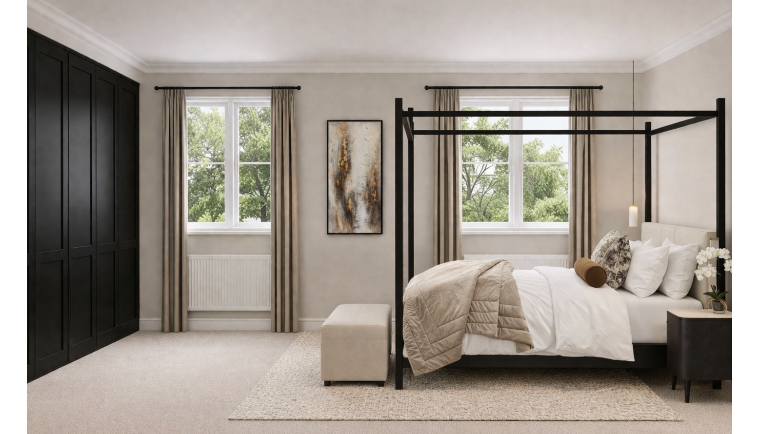 This bedroom design exudes elegance and comfort. At the center, a luxurious super-king-size four-poster bed, adorned with plush bedding, creates a stunning focal point. The soft hues of the bedding are complemented by decorative cushions that add a touch of color and texture.
