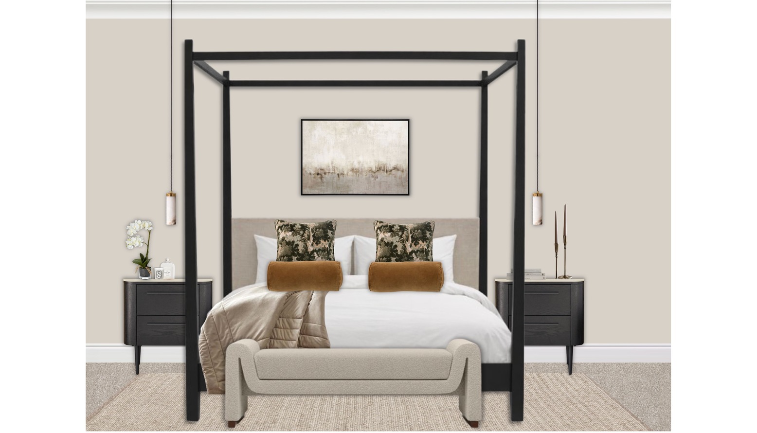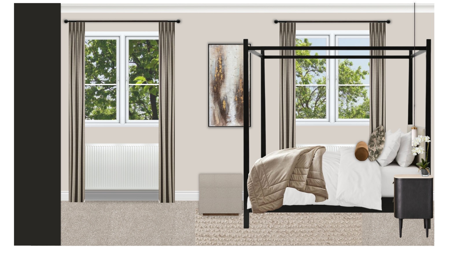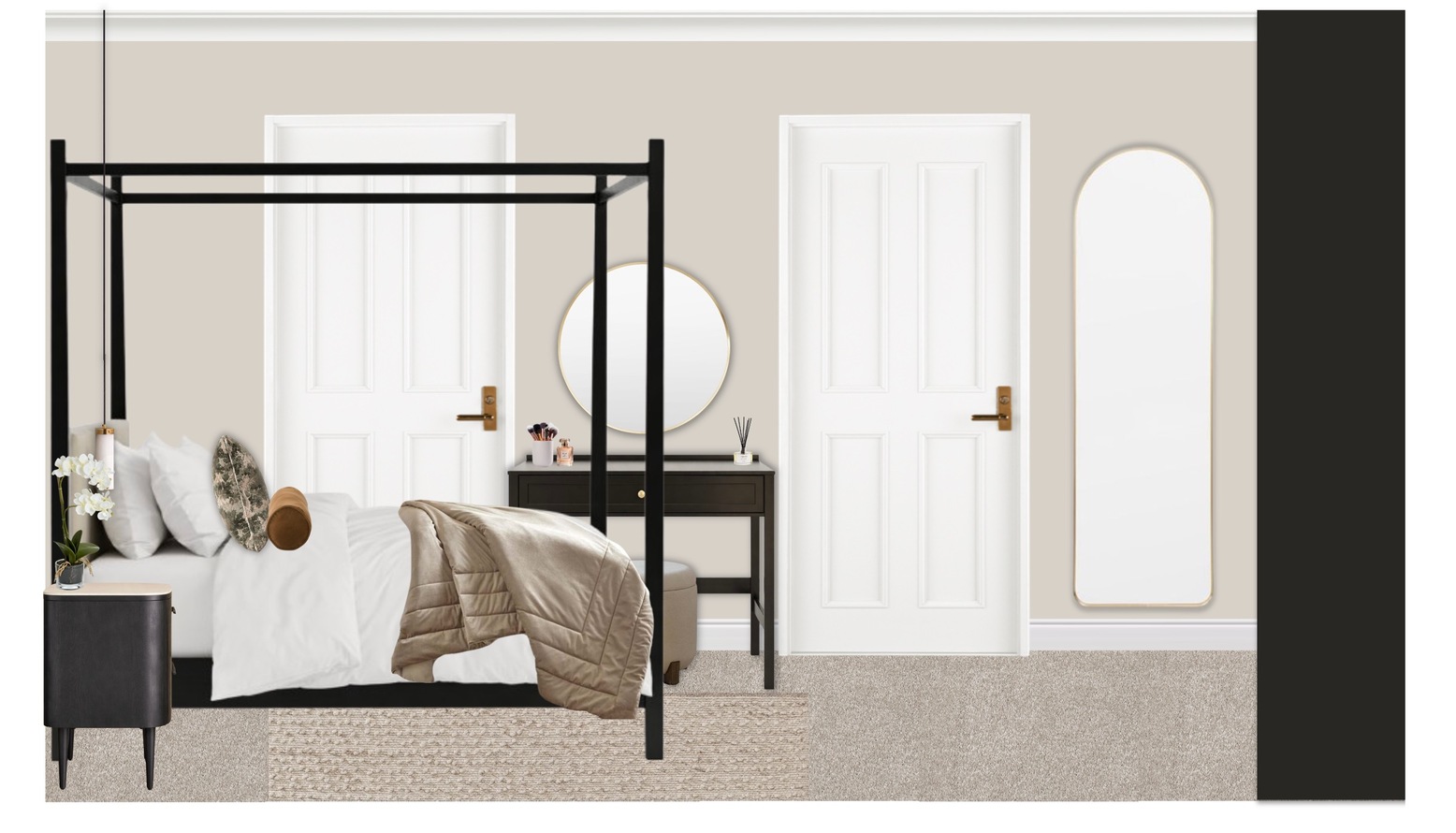 The room is anchored by a cozy wool rug in a subtle beige tone, which enhances the inviting atmosphere underfoot. A sophisticated dressing table in a chic black finish is positioned, accompanied by a faux potted mini orchid that introduces a hint of nature into the space.