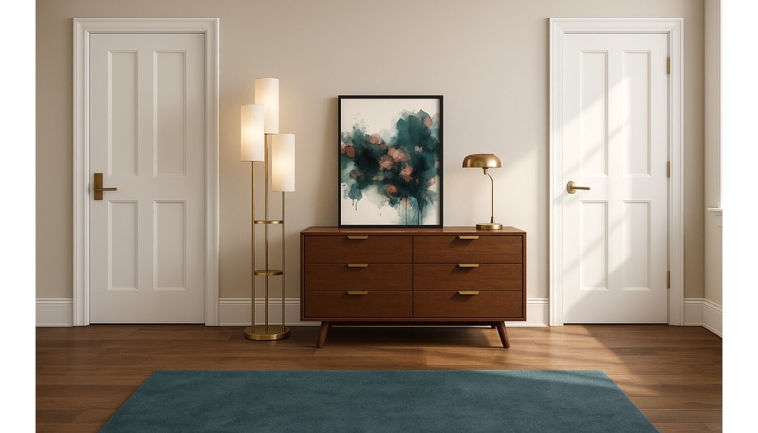 In the corner, a tall palm plant brings a hint of nature, while sophisticated lighting features like the antique brass wall sconces and a stylish floor lamp provide both functionality and aesthetic appeal. A chic abstract piece of artwork hangs prominently above the bed, creating a focal point that ties together the room's overall design.