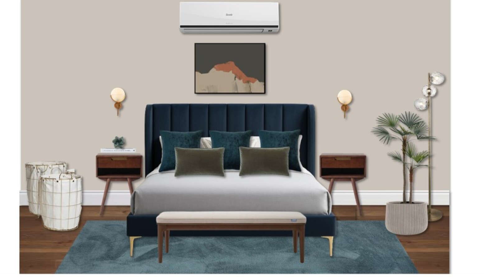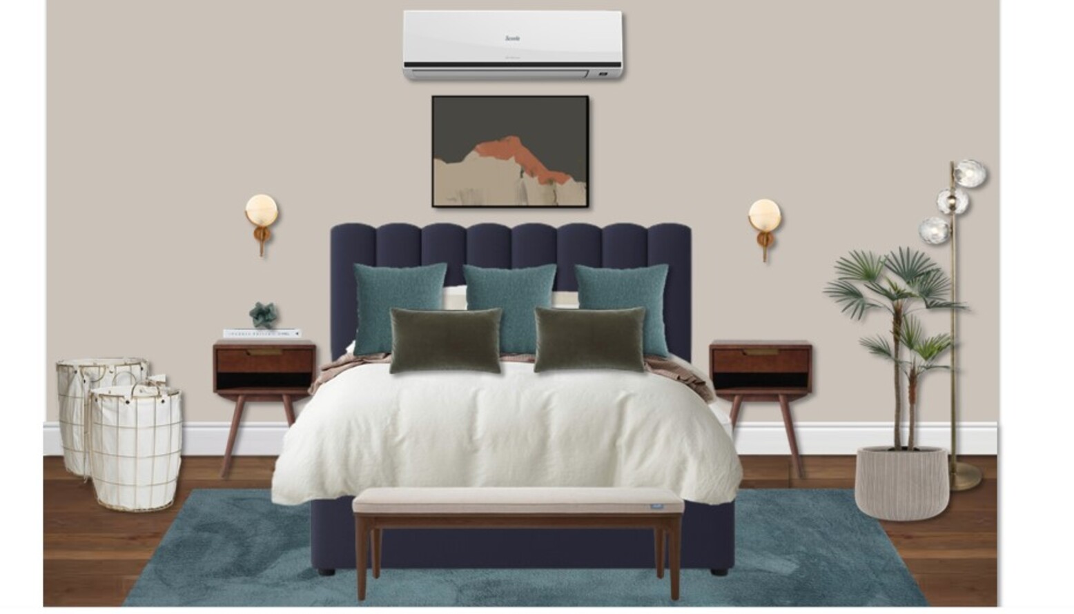 Additional decor elements, such as a round laundry basket and decorative photo frame, integrate practicality with style, ensuring that every choice serves a purpose. The overall result is a harmonious blend of comfort, style, and effortless elegance, making this bedroom a perfect retreat.