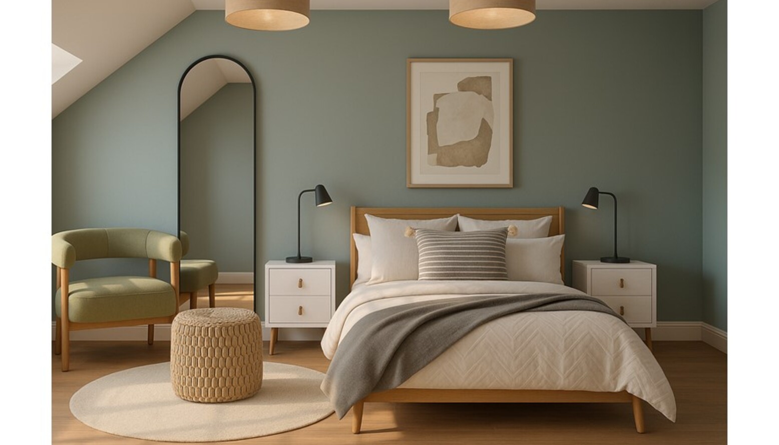 The bedroom showcases a serene atmosphere with a calming color palette dominated by soft greens and warm neutrals. The walls are painted in a soothing shade of green, creating a tranquil backdrop for the space. Natural light floods the room, highlighting the elegant wood tones of the furniture.
