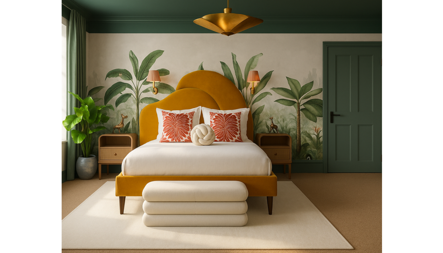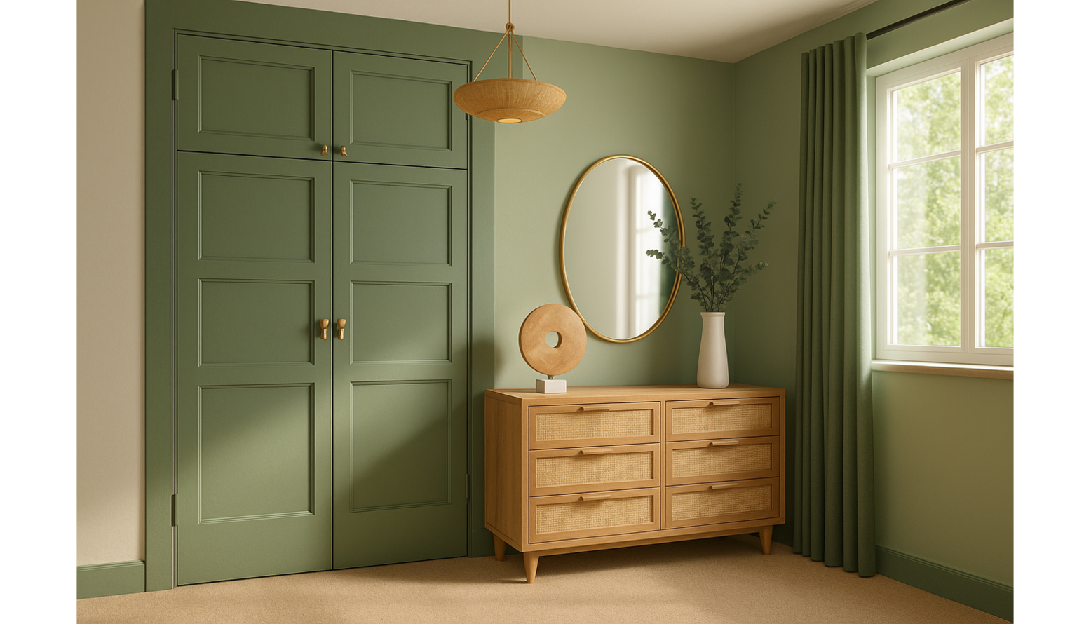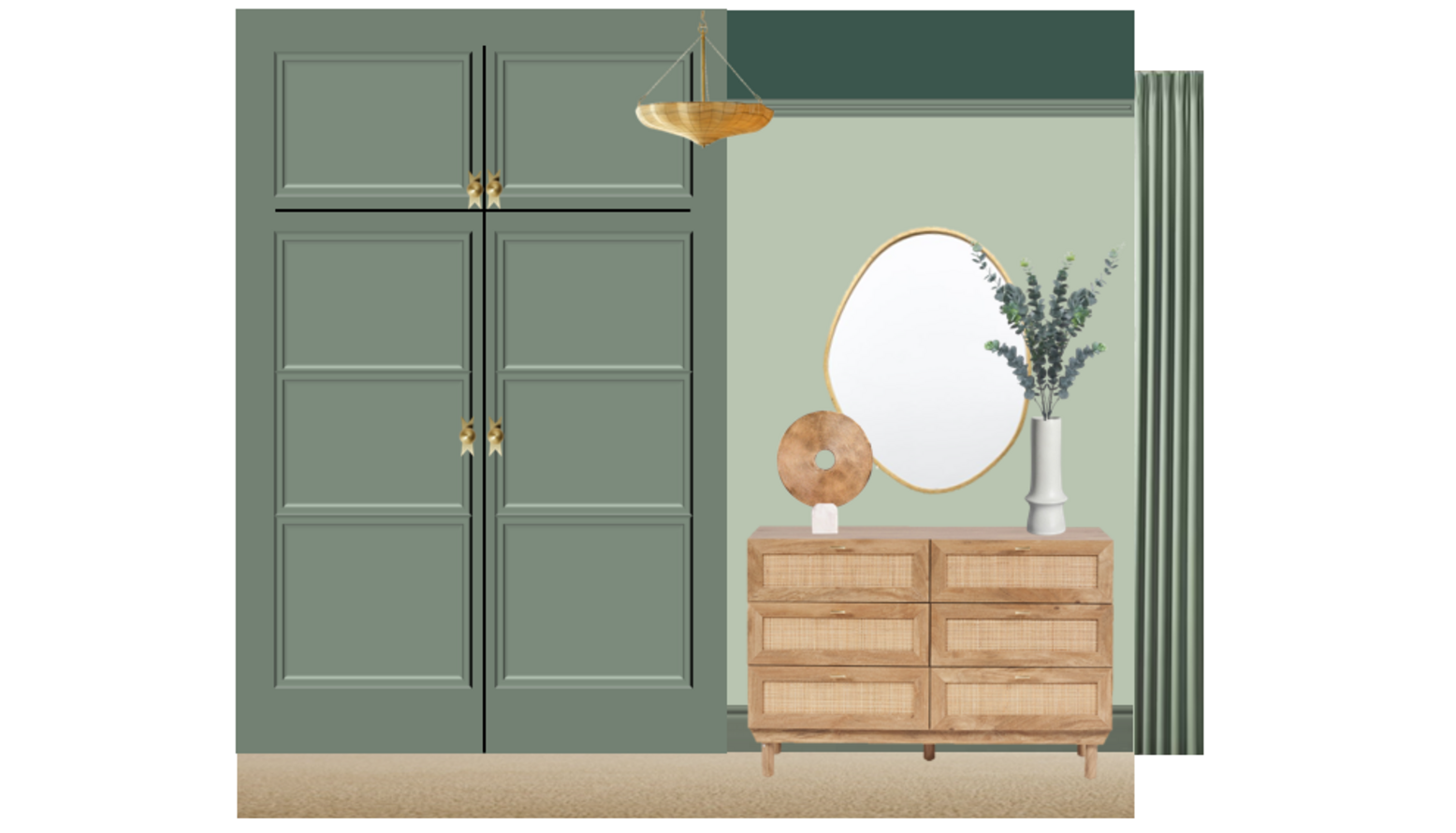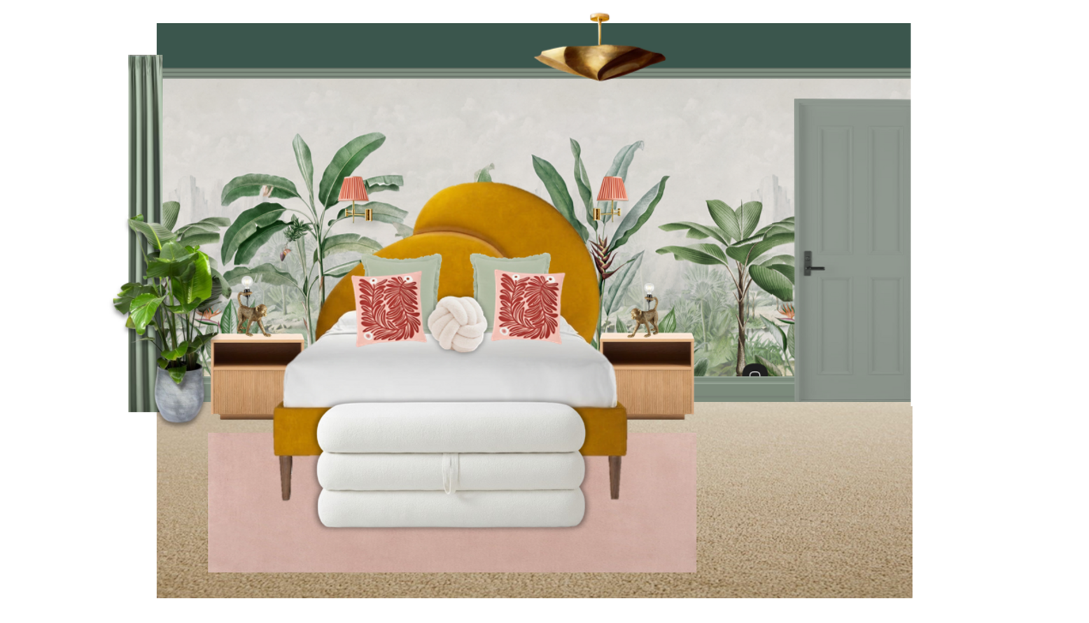If you’d like to go for a bolder colour scheme in your bedroom design then look to muted, softer hues that have warmer undertones like sage or moss green or a dusky pink.
