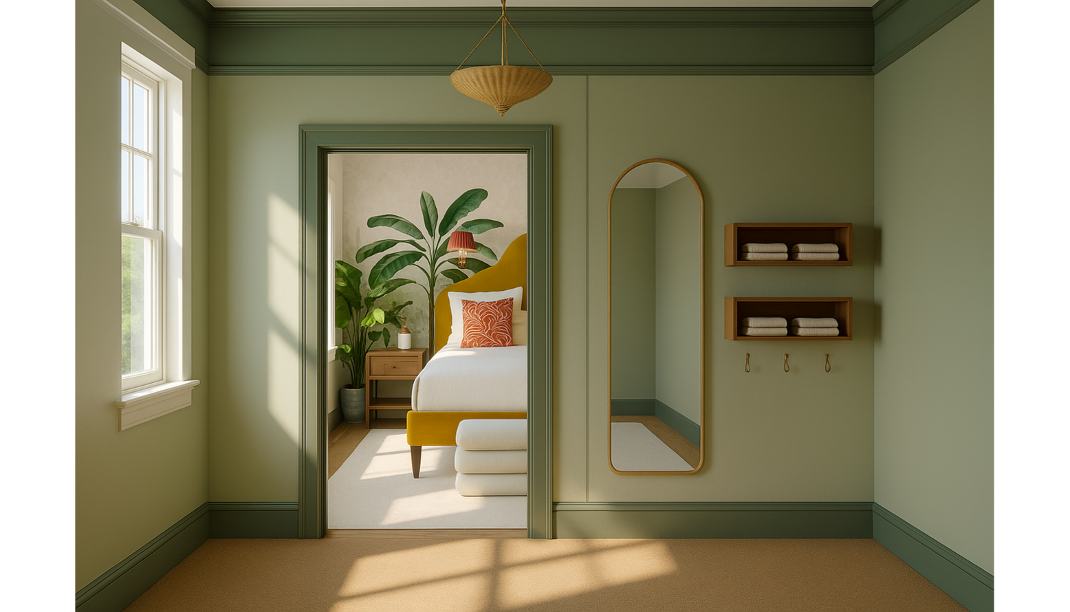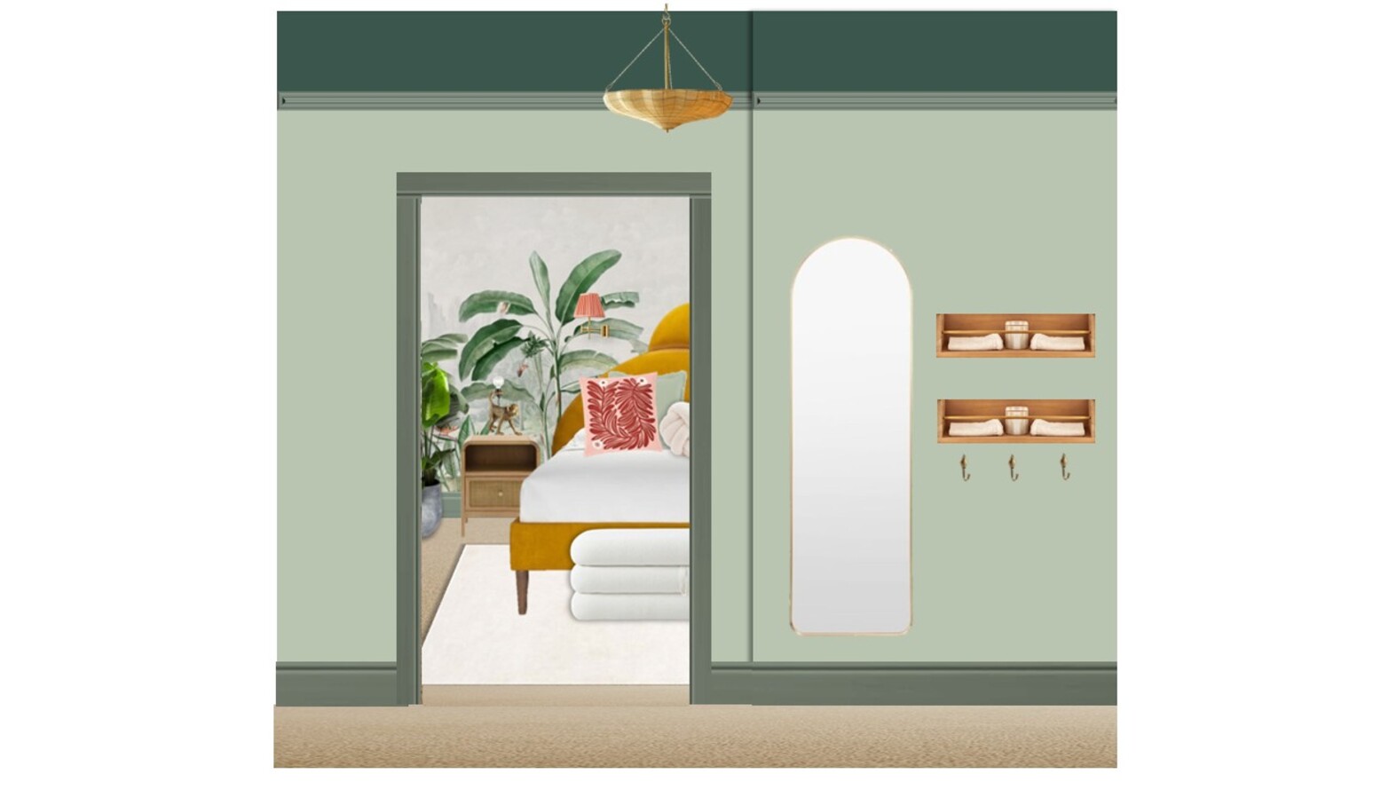 Artwork and decor elements, such as wall-mounted items and a stunning Holworth Arch Mirror in Gold, contribute to the overall design aesthetic. The design includes personalized touches with the artwork suggested, ensuring the space reflects the clients’ tastes beautifully.
