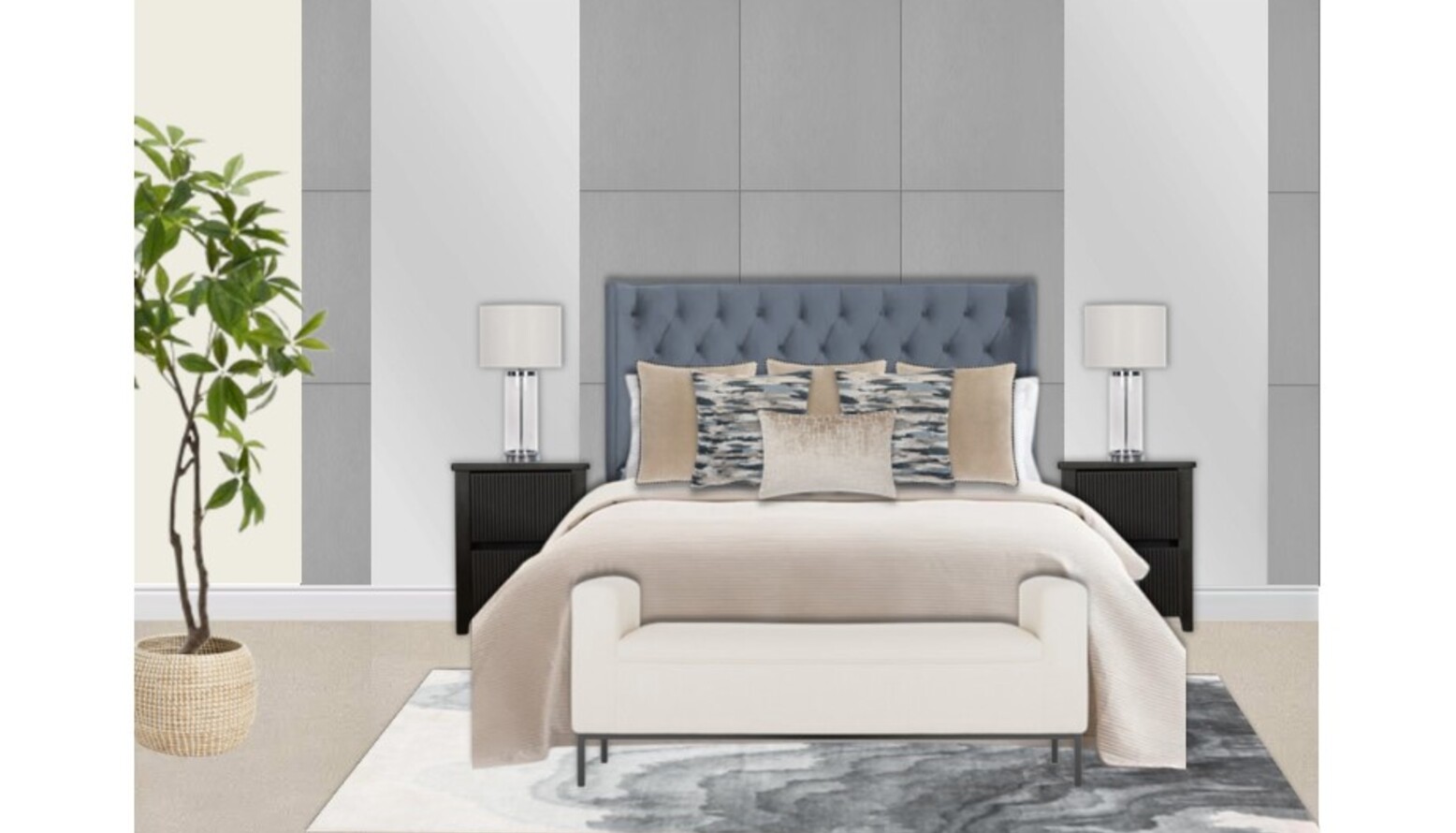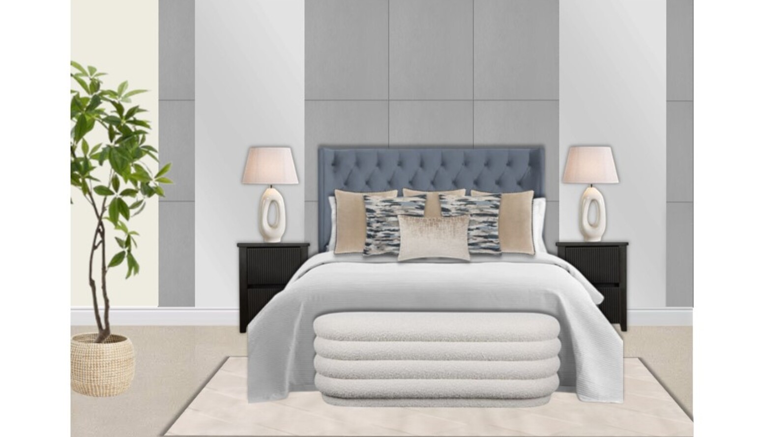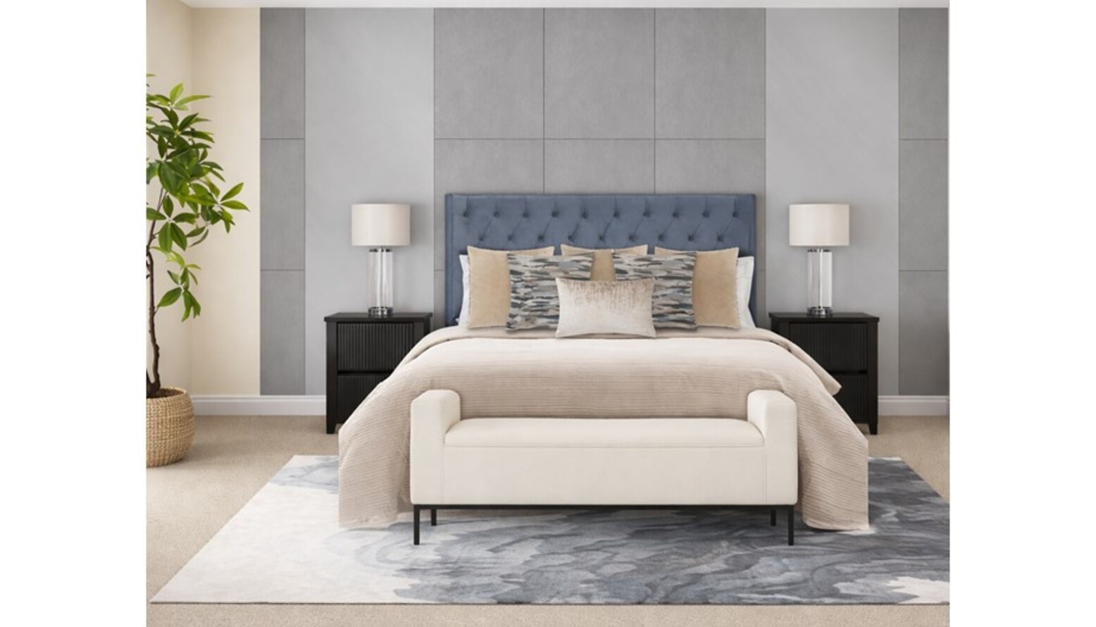 The bedroom features a sophisticated and modern design with a calming color palette. A plush, tufted blue headboard stands as the focal point above the neatly made bed, which is adorned with a light beige bedspread and an array of decorative pillows in various textures and patterns. Flanking the bed are sleek black nightstands, each topped with elegant, transparent table lamps that diffuse soft light.