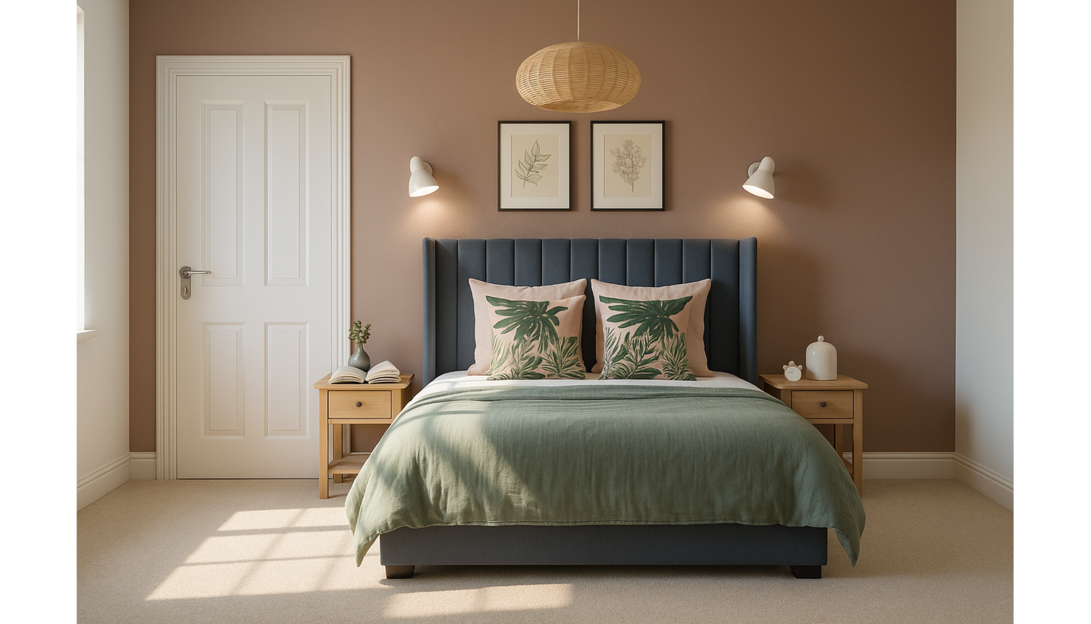 The bed, adorned with a soft sage green bedspread and decorative pillows featuring lush foliage, invites comfort. Two stylish bedside tables flank the bed, each holding a charming décor piece that adds character.