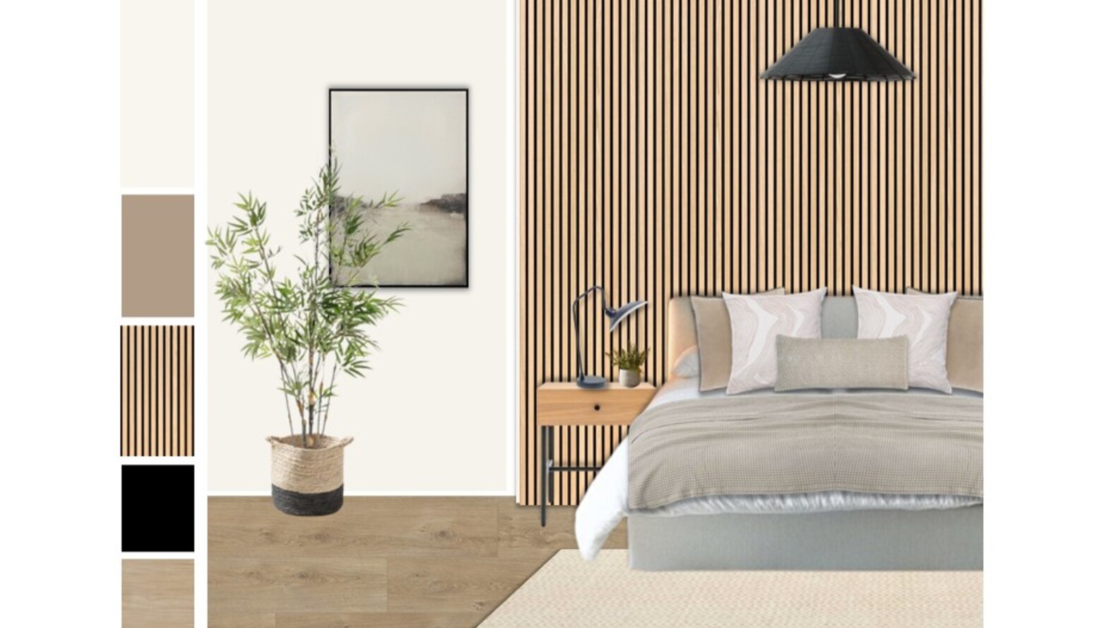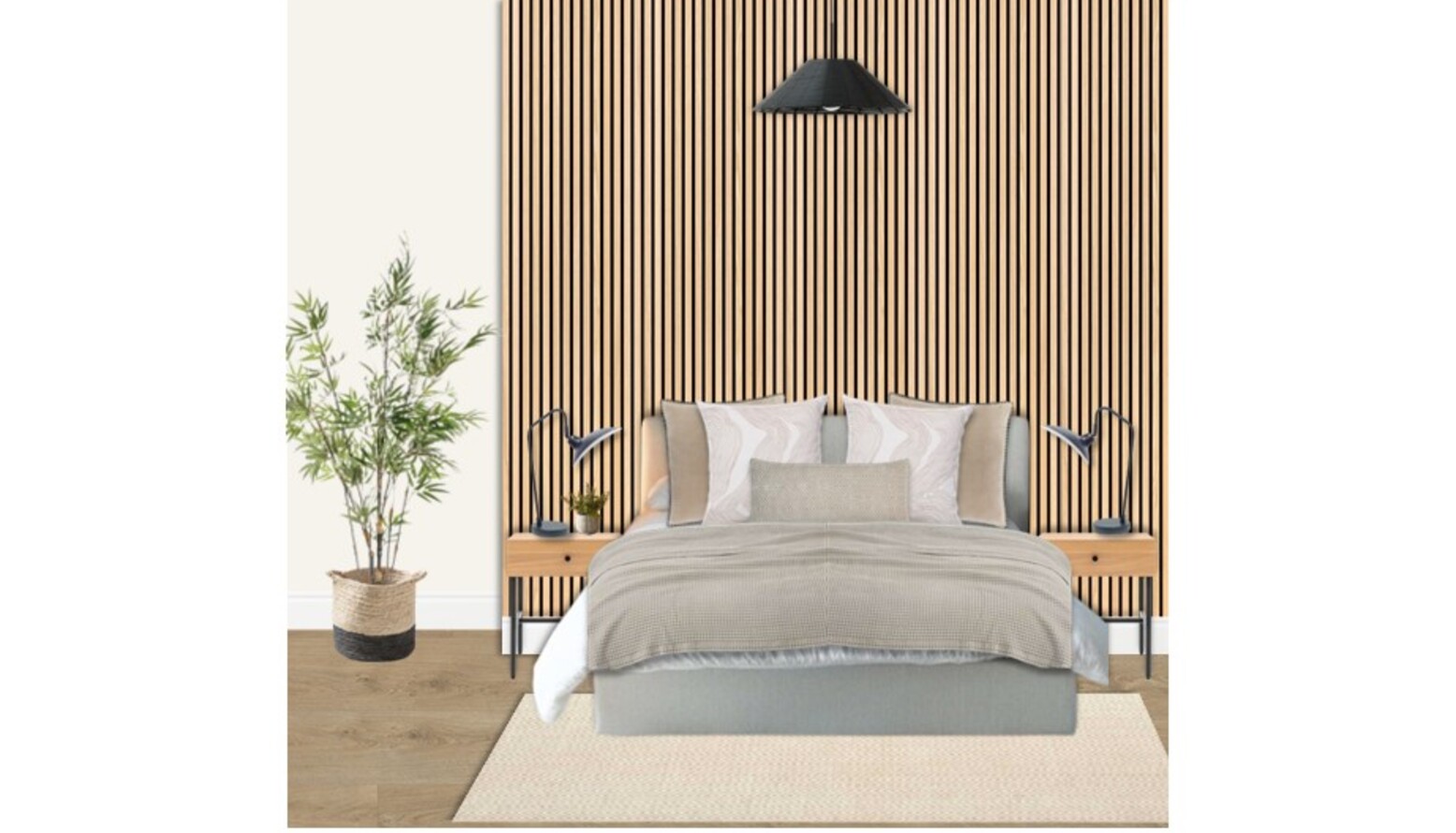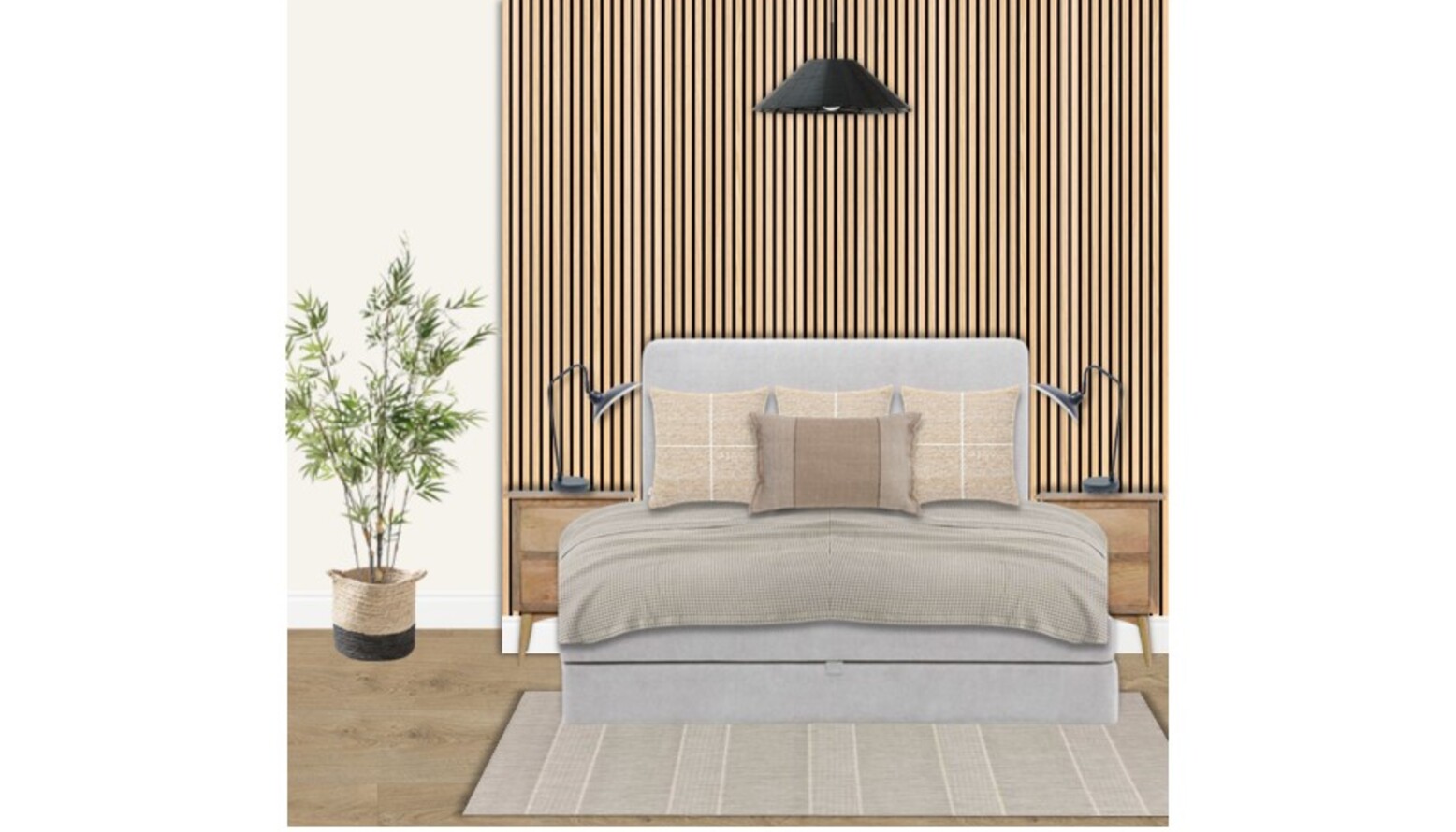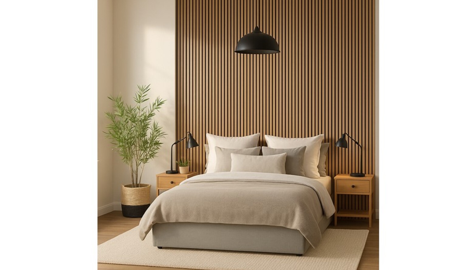 This guest bedroom exudes a serene and contemporary vibe, featuring a stylish design centered around comfort and functionality. The focal point of the room is a king-size ottoman bed, upholstered in a soft ivory fabric, offering ample storage beneath. Beneath the bed lies a natural-toned textured rug that furthers the coziness of the space. Flanking the bed are two bedside tables made of light wood, each equipped with a sleek black table lamp, providing ambient lighting. A layered approach to bedding adds dimension, with a natural waffle bedspread gently draping over the bed, complemented by an assortment of plush cushions in varying shades of taupe and grey. The room is accentuated by a striking feature wall adorned with vertical wooden slats, bringing warmth and character. A living plant in a basket, placed strategically beside the bed, introduces a touch of nature. Art on the wall features an abstract canvas within a black frame, enhancing the modern aesthetic. The overall color palette is soft and neutral, creating a calming atmosphere that invites relaxation.