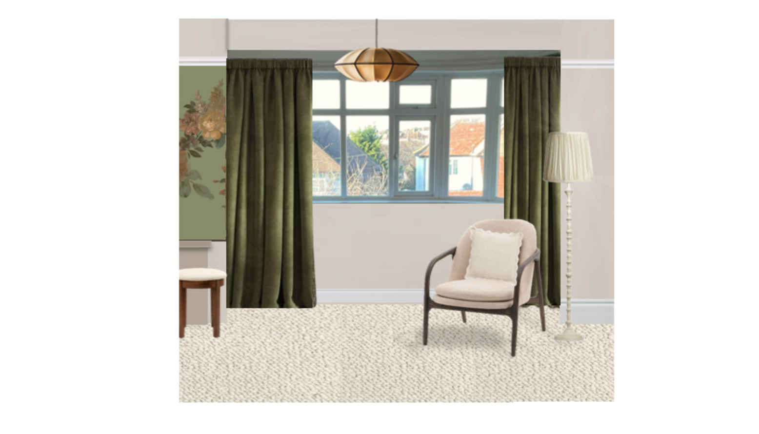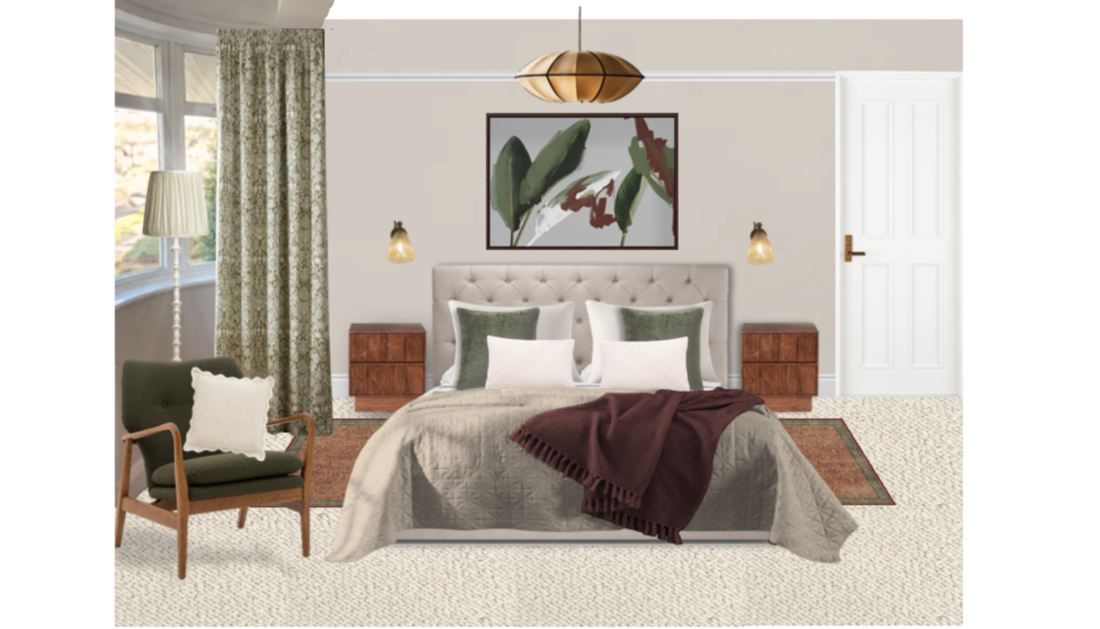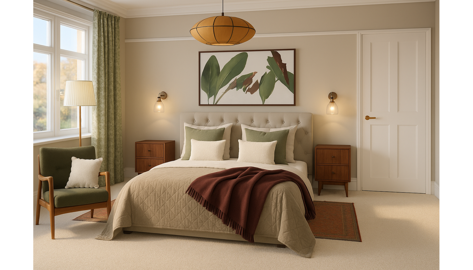 This bedroom design presents a harmonious blend of comfort and style. The centerpiece is a super-king size ottoman bed, upholstered in stone brushed linen cotton, exuding elegance. Flanking the bed are two dark brown bedside tables, providing both functionality and a touch of warmth. Above the bed, a beautifully framed abstract botanical artwork adds a pop of color and serves as a focal point in the room. On either side of the bed, stylish wall sconces provide soft, ambient lighting, enhancing the inviting atmosphere. The bedding is in cream, featuring crisp and fresh Egyptian cotton percale, further complemented by a neutral opulent velvet bedspread that adds texture and depth. Accent cushions in shades of green and cream introduce subtle tones that echo the artwork above. A cozy, rich burgundy throw blankets the bed, inviting warmth and comfort. Underfoot, an amber red flatwoven rug anchors the space, adding warmth and pattern to the soft beige carpet. A sleek, taupe silk pendant light casts a soft glow, while the 40cm tall tapered gathered lampshade contributes to the layered lighting scheme. A round wood mirror above the bed reflects light and visually expands the room. Adjacent to the bed, a vintage-style armchair in green with a plush cushion offers a perfect reading nook, positioned near the window dressed in elegant made-to-measure sunflower curtains that add a burst of floral charm. The soft drapes frame the window beautifully, allowing natural light to filter through. This bedroom combines elegance, comfort, and personal touches that cater to both style and functional needs.