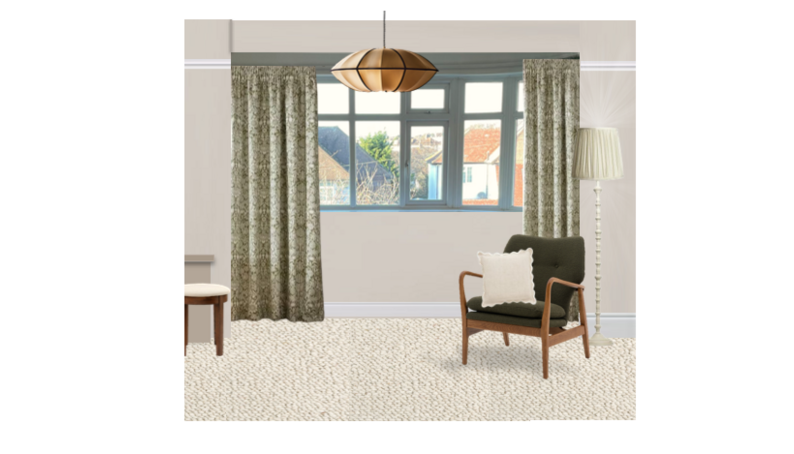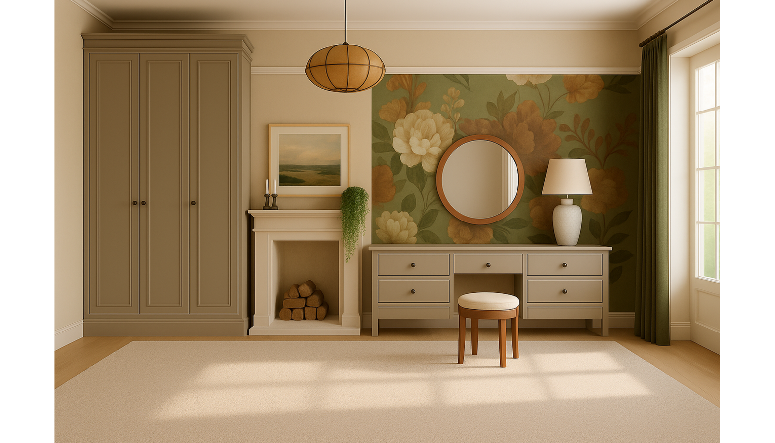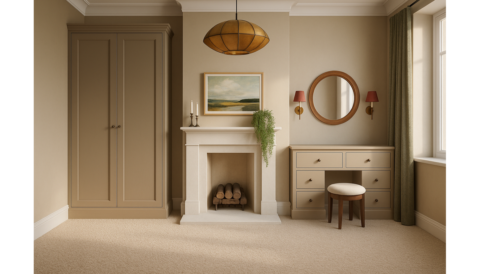 This bedroom design presents a harmonious blend of comfort and style. The centerpiece is a super-king size ottoman bed, upholstered in stone brushed linen cotton, exuding elegance. Flanking the bed are two dark brown bedside tables, providing both functionality and a touch of warmth. Above the bed, a beautifully framed abstract botanical artwork adds a pop of color and serves as a focal point in the room. On either side of the bed, stylish wall sconces provide soft, ambient lighting, enhancing the inviting atmosphere. The bedding is in cream, featuring crisp and fresh Egyptian cotton percale, further complemented by a neutral opulent velvet bedspread that adds texture and depth. Accent cushions in shades of green and cream introduce subtle tones that echo the artwork above. A cozy, rich burgundy throw blankets the bed, inviting warmth and comfort. Underfoot, an amber red flatwoven rug anchors the space, adding warmth and pattern to the soft beige carpet. A sleek, taupe silk pendant light casts a soft glow, while the 40cm tall tapered gathered lampshade contributes to the layered lighting scheme. A round wood mirror above the bed reflects light and visually expands the room. Adjacent to the bed, a vintage-style armchair in green with a plush cushion offers a perfect reading nook, positioned near the window dressed in elegant made-to-measure sunflower curtains that add a burst of floral charm. The soft drapes frame the window beautifully, allowing natural light to filter through. This bedroom combines elegance, comfort, and personal touches that cater to both style and functional needs.