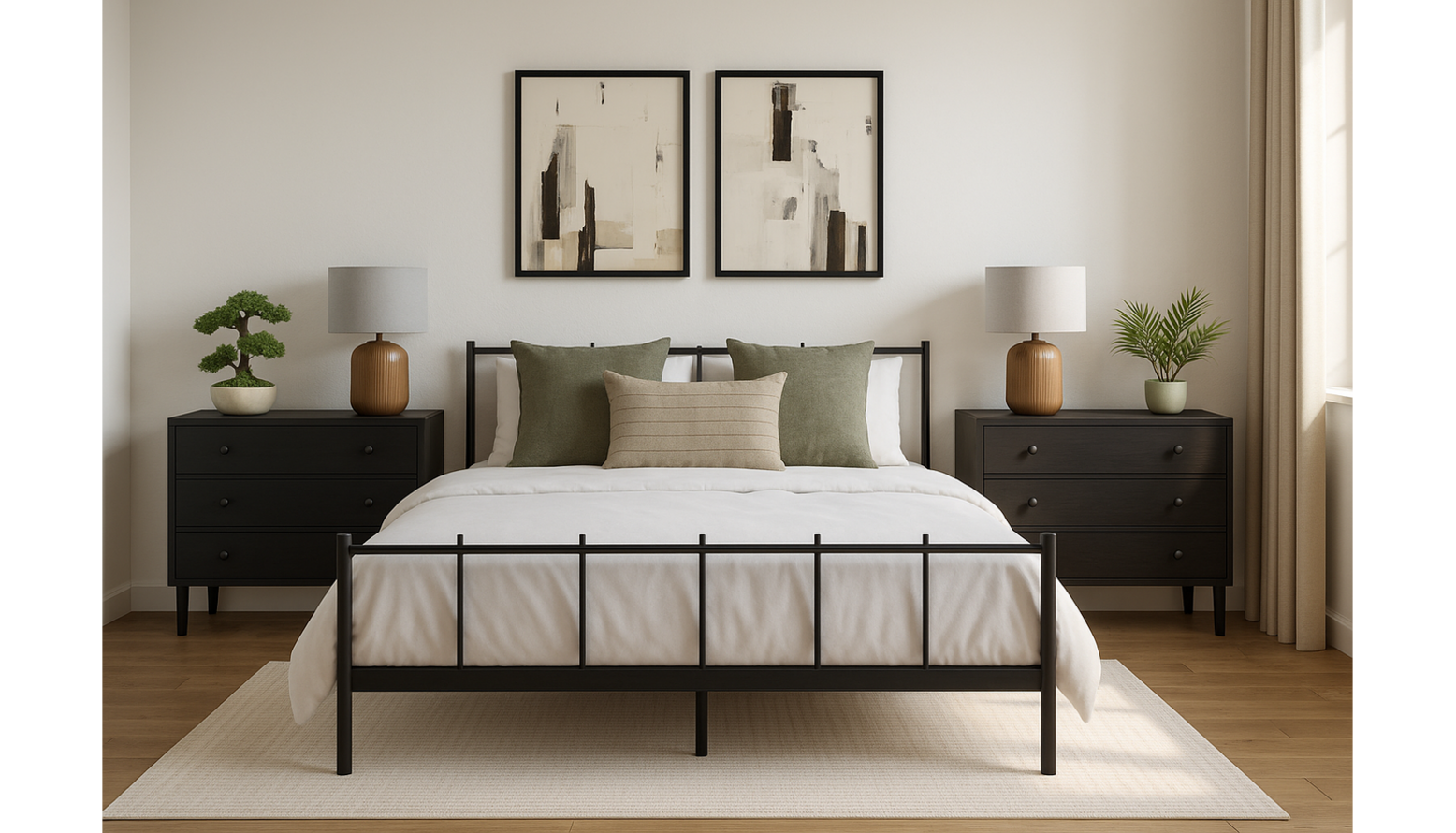 The bedroom is designed with a calming palette of natural tones, complemented by sleek black furniture and warm accents. A black metal bed frame serves as the focal point, adorned with a white comforter and layered with several plush cushions in green tones and a striped accent pillow, promoting both comfort and style. Flanking the bed are two black chest of drawers, providing both functionality and an elegant touch. Each chest is topped with decorative pieces: a modern table lamp with a beige shade on one side, and a delicate faux bamboo plant in a ceramic pot on the other, adding a hint of greenery. The walls are adorned with minimalist abstract artwork in muted colors, enhancing the sophisticated vibe of the room. A light-colored area rug underfoot adds warmth to the wooden flooring, while soft window drapes frame the natural light that fills the space, creating an inviting atmosphere for relaxation. Practical elements such as wall-mounted shelving are integrated, offering chic storage options while maintaining an organized aesthetic. Overall, the design reflects a harmonious blend of contemporary style and comfort, perfect for restful nights.