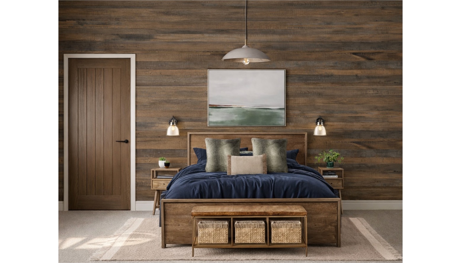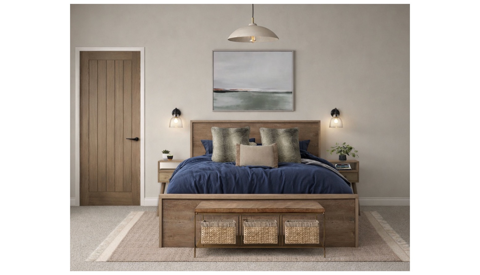 A serene bedroom design features a double bed with a warm oak finish, complemented by a backdrop of calming, muted tones. The bed is dressed in denim blue washed linen bedding adorned with plush cushions in various textures, including a faux fur option for added comfort. Flanking the bed are stylish wall-mounted task lights with a matte black and glass finish, providing both functionality and an elegant touch.