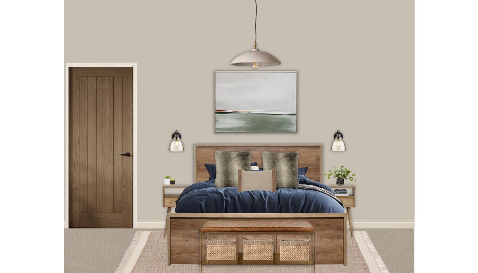 Artfully displayed above the bed, a large abstract canvas in soothing greens and grays acts as a focal point, further enriching the room's palette. A seagrass storage basket near the bed adds functionality without sacrificing style, while live plants in simple ceramic pots bring a touch of nature indoors. The overall design is completed with a pendant light in pale grey concrete, blending modern industrial elements with warm, welcoming materials.