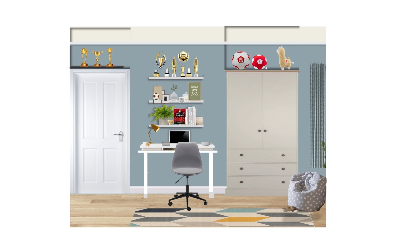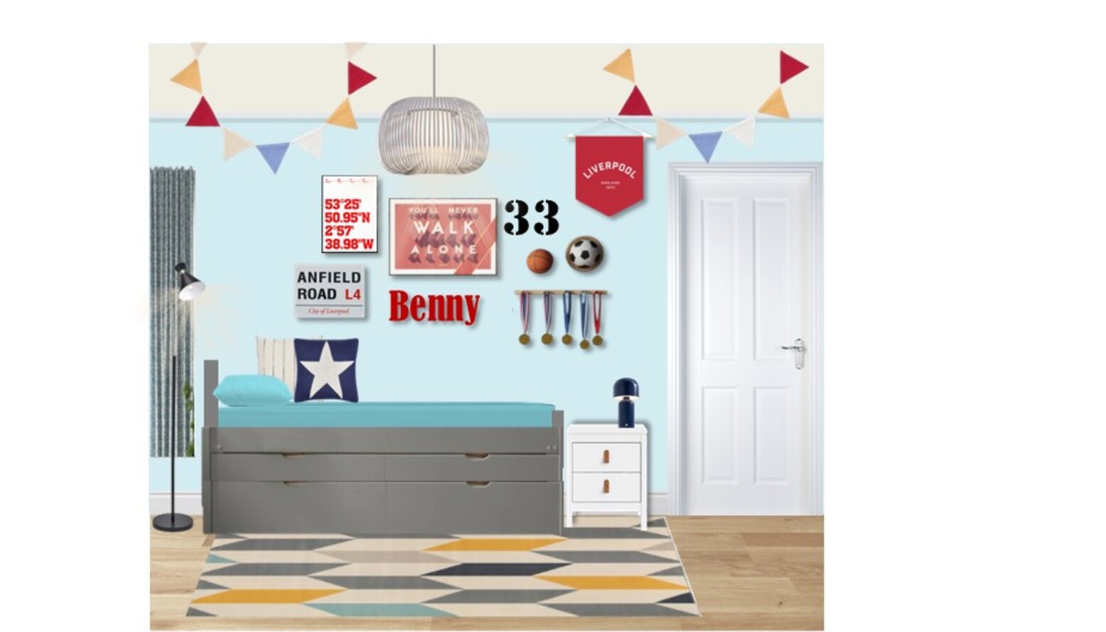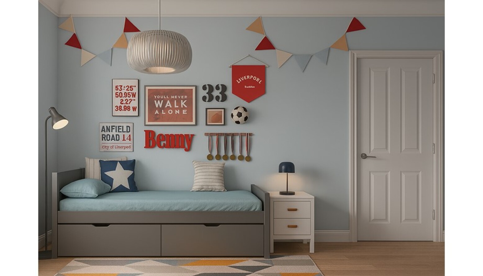 Above the bed, the walls are adorned with various artworks and decorations, including a vibrant Liverpool FC poster, a banner celebrating the team, and personalized name decor that adds a unique touch. A fun star-patterned pillow rests on the bed, while a festive garland with multi-colored flags brings a playful element to the room.