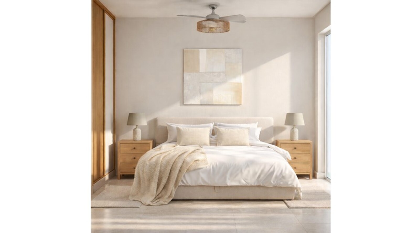 This bedroom embodies a serene and modern aesthetic, characterized by warm natural tones and minimalist design elements.