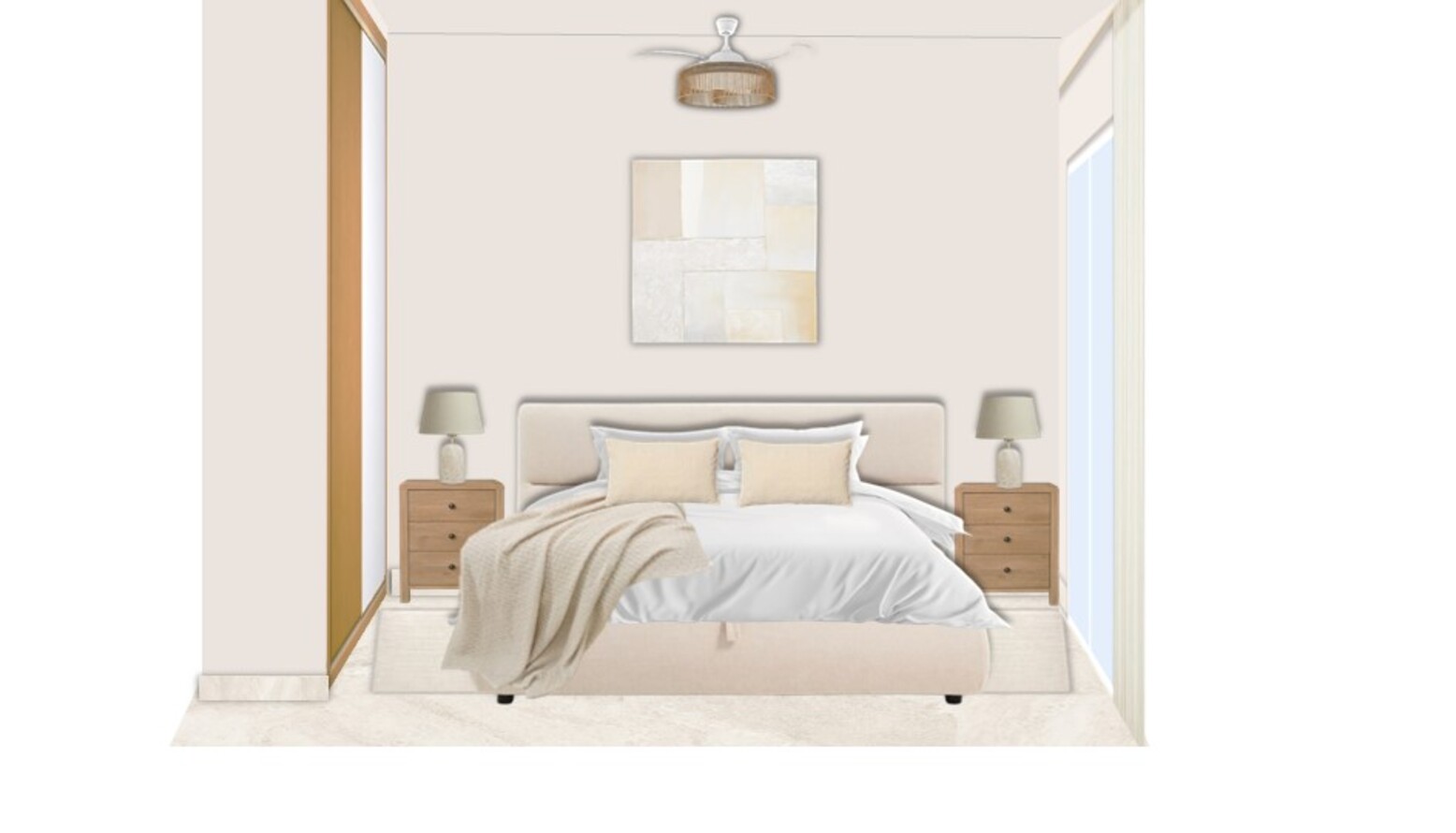 Above the bed, an abstract artwork in neutral tones creates a focal point, harmonizing beautifully with the room's overall palette.