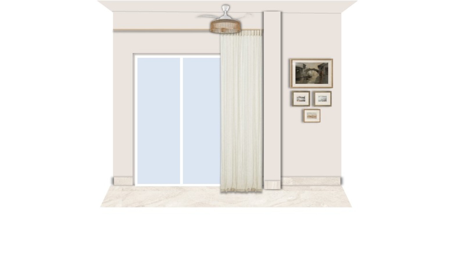 The ceiling fan light, with its nickel and wood accents, contributes to the modern look while ensuring comfort on warmer days.