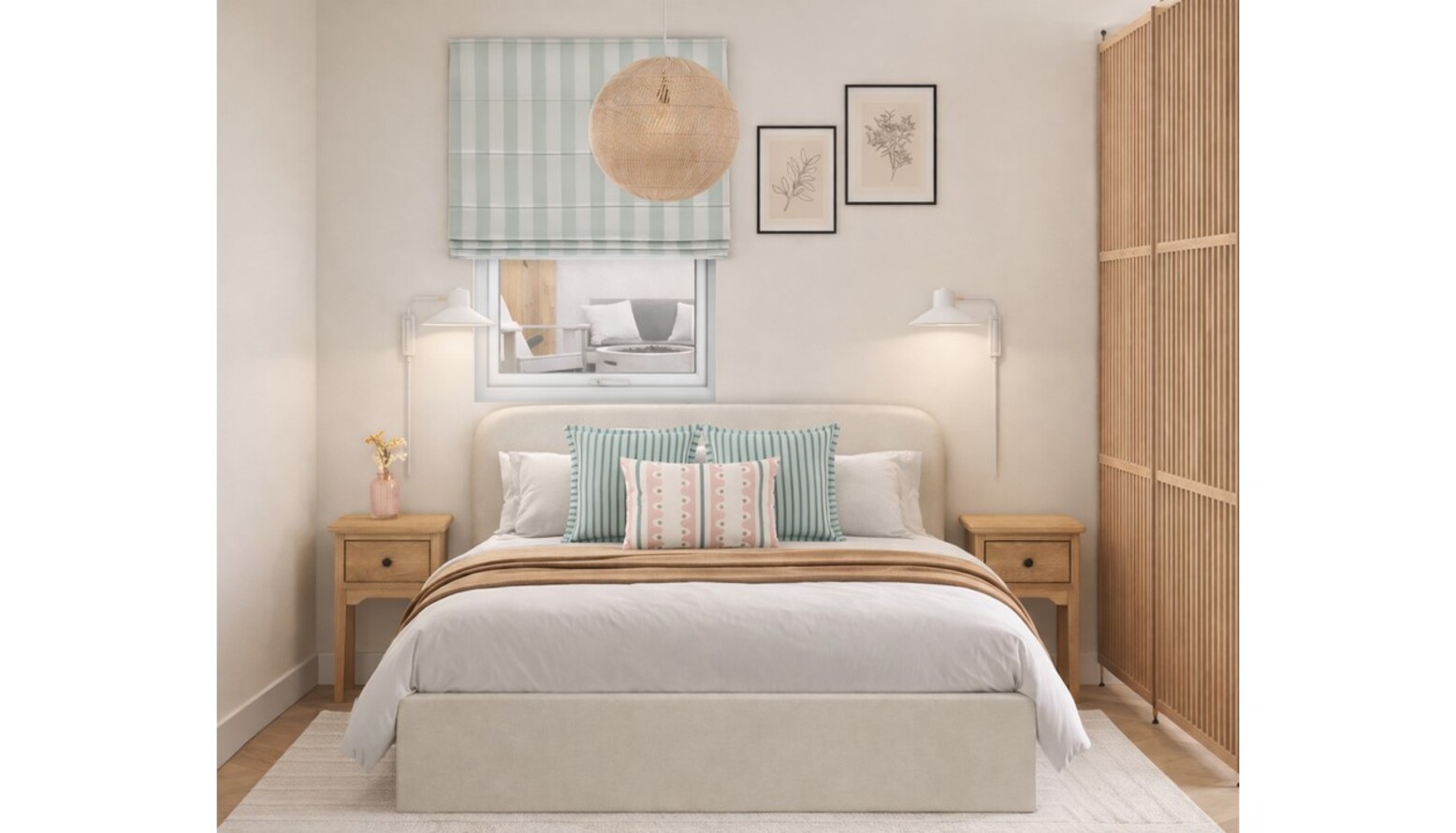 The bedroom features a soothing palette with a focus on natural materials. The bed is a dual-tone ivory upholstered ottoman storage bed, complemented by a cozy white duvet cover set and decorative striped cushions in soft greens and pinks. The bedside tables, crafted from natural oak veneer, sit on either side of the bed, providing functional yet stylish storage space. Lighting is provided by contemporary steel wall lights in a clean white finish, alongside a round ceiling shade made from natural materials, creating a warm ambiance. The walls are painted in a soft off-white, enhancing the airy feel of the room. Artworks framed in black add a touch of elegance, while a shaggy cream rug underfoot contributes to the comfort. In the corner, a desk of natural oak veneer is paired with a stylish office chair, thoughtfully selected to fit the dimensions of the workspace. A room divider with a slatted design offers a sense of separation without compromising light flow. Accessorizing the space are decorative vases, a mirror, and tasteful throw blankets, all curated to create a cohesive and inviting environment. The combination of light woods and gentle colors evokes a tranquil retreat, perfect for relaxation and rest.