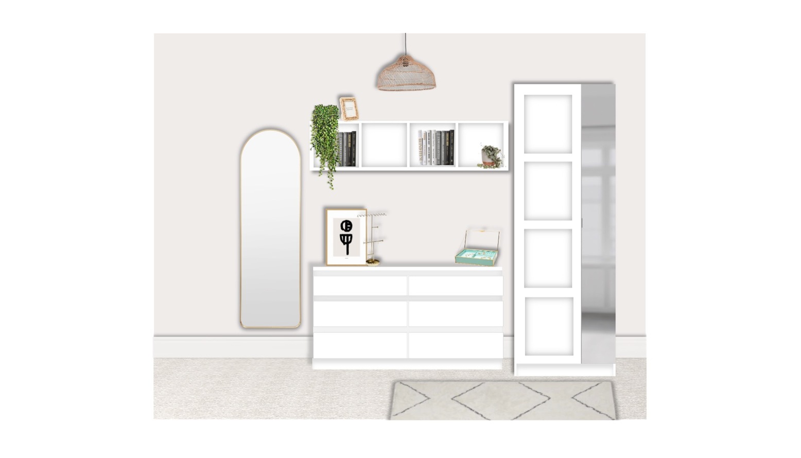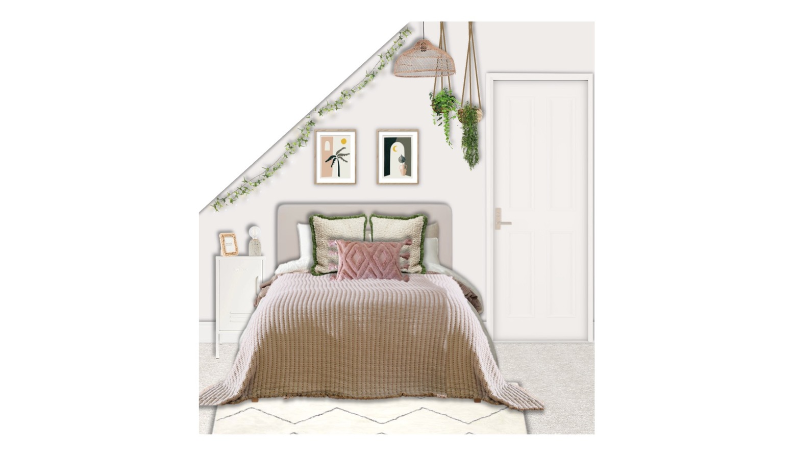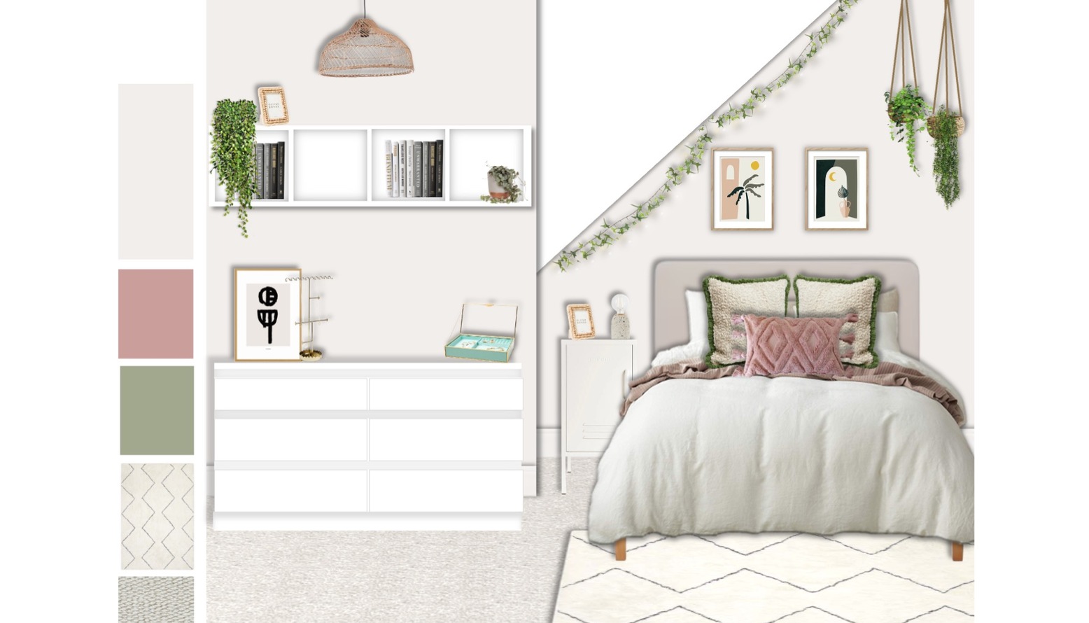 Storage solutions are practical yet stylish, featuring a white storage locker and a two-door wardrobe. The space is adorned with a soft Moroccan zigzag plush rug, contributing to the room's inviting atmosphere. Shelving above the dresser provides additional space for books and plants, including both real and faux options, adding a touch of nature. The room’s lighting is elegantly crafted with a gold-finished ceiling lamp and heart LED light bulbs, creating a warm ambiance.