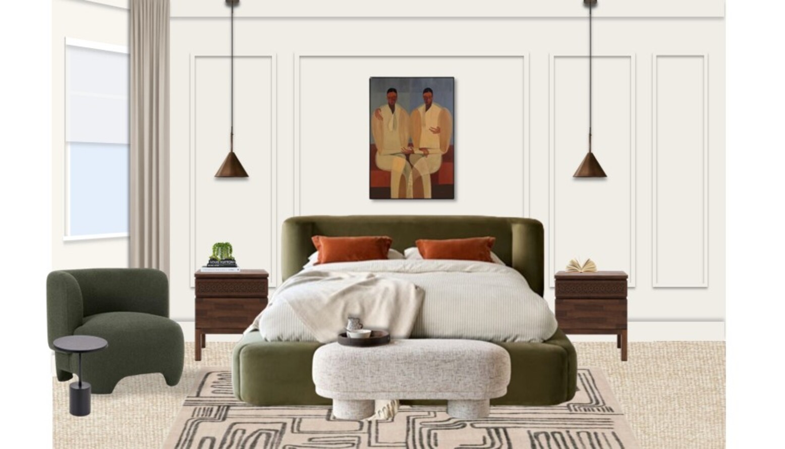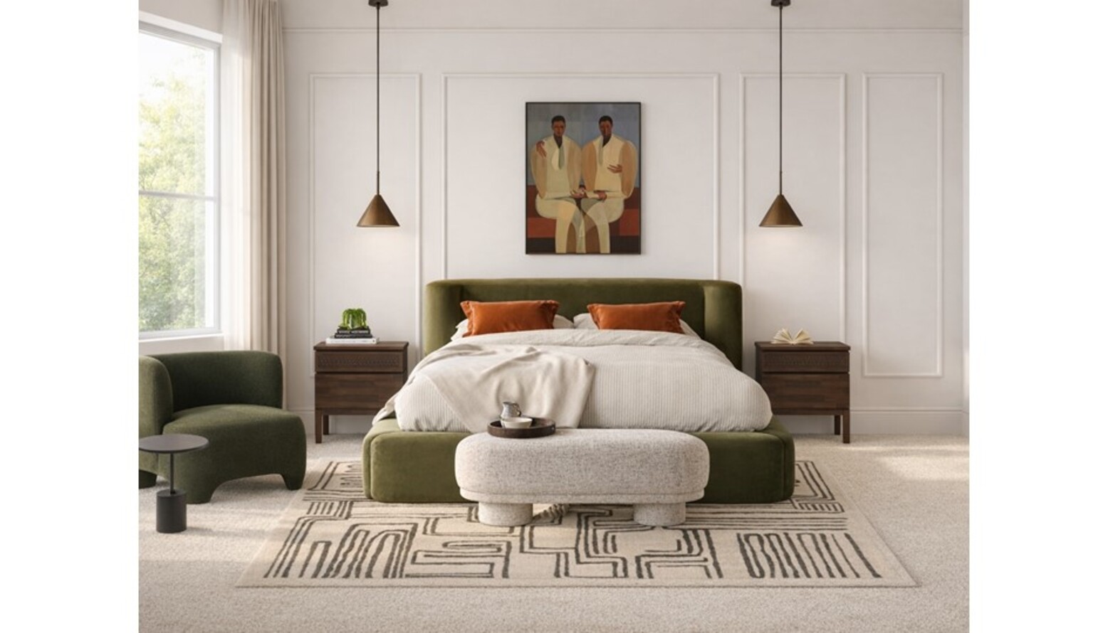 This bedroom and dressing area showcases a harmonious blend of style and comfort. The centerpiece is the olive green recycled velvet king-size ottoman bed, featuring a gently curved headboard for an inviting look. Underbed storage is easily accessible with its hydraulic mechanism, offering practicality alongside aesthetics. Flanking the bed, the bedside chests in a rich wood tone add both function and warmth, perfectly complementing the overall color scheme. A plush, dirty orange cushion cover placed atop the bed introduces a vibrant pop of color, and the textured blanket adds an inviting layer of coziness. Artful touches are provided by a striking piece of artwork above the headboard, which adds personality and serves as a focal point in the design. Lighting is elegantly addressed with brushed antique bronze pendant lights and wall sconces, creating a warm ambiance that enhances the room's atmosphere. The green boucle armchair offers a comfortable seating area, while the rounded forms of the furniture contribute to a relaxed and inviting feel in the space. The flooring is adorned with a flatwoven rug in black and ivory, creating visual interest and layering that enhances the comfort of the room. To add the finishing touches, a backless bench with a smooth rounded design offers additional seating while retaining a sleek look. The carefully chosen accessories such as the small plant stand and the touch table lamp with a crystal trim bring a modern touch to the dressing area. Overall, this bedroom/dressing area is designed for both relaxation and functionality, making it a perfect retreat.